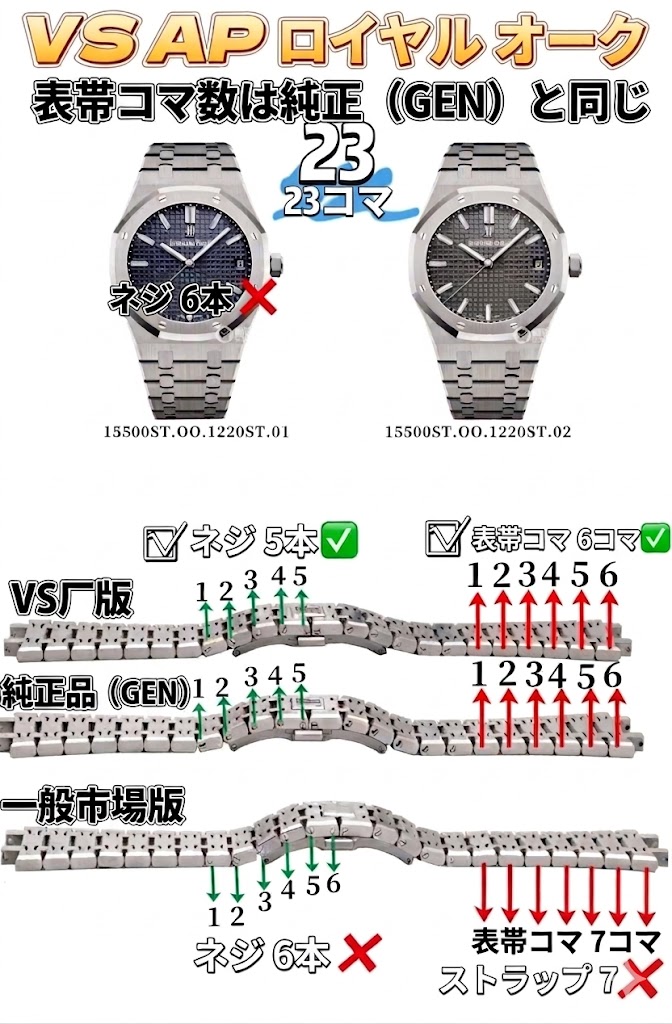 これは非常に大きな改善点です。熱狂的なAP愛好家ならご存知の通り、市場に出回るほとんどの標準モデルは、ブレスレットのコマ数を「24コマ」で製造するというミスを犯しています。