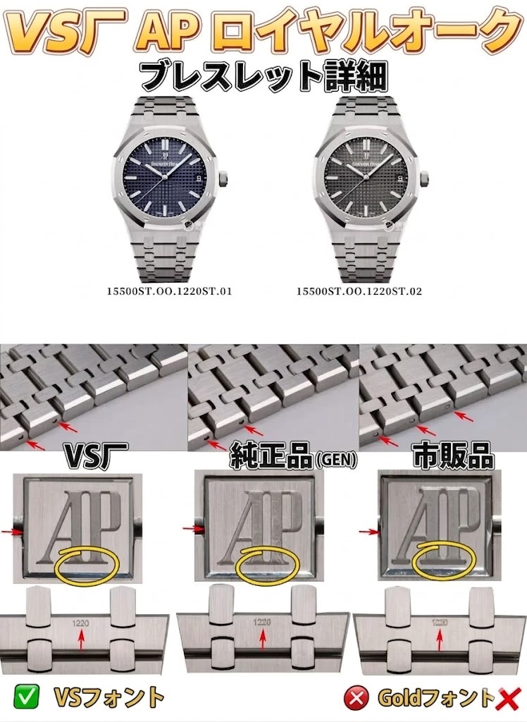 しかし最も印象的なのは、インナークラスプの「AP」の刻印です。文字の下部のセリフには、コレクターの間でアシカの足として知られる独特のカーブがあります。VSはこのミクロレベルのタイポグラフィの癖まで完璧に捉えており、真の最高峰モデルとしての地位を確固たるものにしています。