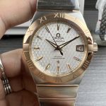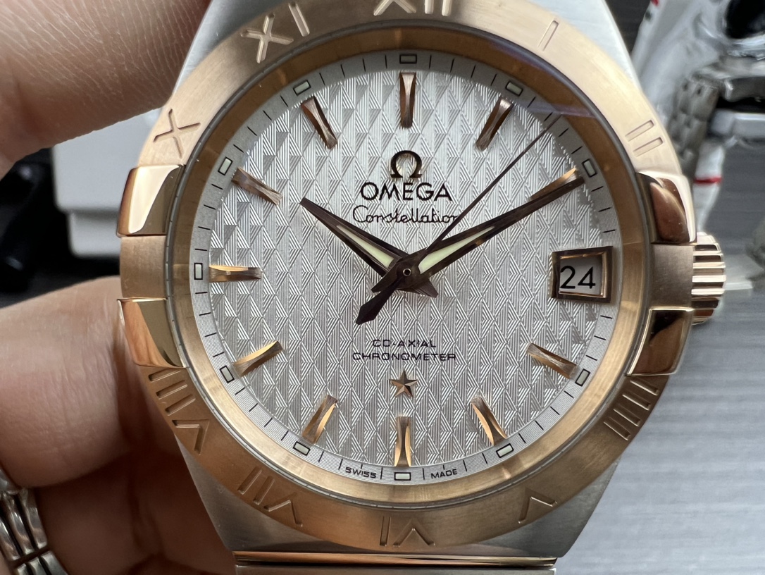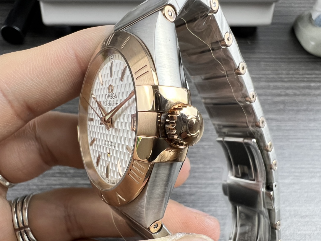 オメガ コンステレーション (リファレンス 123.20.38.21.02.007) は、象徴的な建築デザインとローズトーンの貴金属の豊かでモダンな温かみをブレンドした、時計製造のエレガンスの時代を超越したシンボルです。オメガ スーパークローンの誰もが認めるマスターである伝説的なVSファクトリー(VSF)によって完璧に実行されたこの1:1レプリカは、本物の印象的な美学と洗練されたプロポーションを捉えています。完璧なサイズの38mmステンレススチールケースに収められ、輝く18Kセドナ(ローズ)ゴールドメッキのベゼルに取り付けられた、コレクションの特徴的な「爪(グリフ)」を備えています。絶対的な際立った特徴は、複雑な十字型の「ロゼンジ(ひし形)」テクスチャーパターンと豊かなローズゴールドのハードウェアで飾られた壮観なシルバーホワイトの文字盤です。伝説的なツートンのモノラン統合型ブレスレットにマウントされたこの時計は、究極の洗練されたデイリーウェアです。業界をリードする丹東DD8500 1:1コーアクシャルクローンムーブメントを搭載し、完璧な信頼性、独立したジャンピングアワー針、驚くべき装飾の精度を提供します。