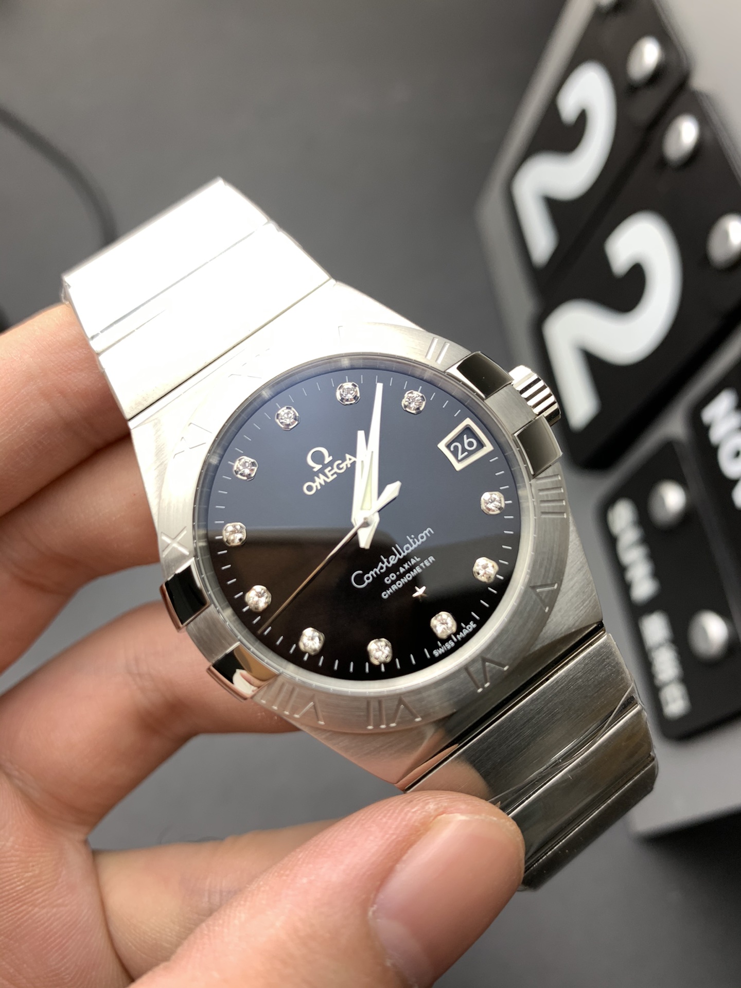 ダイヤモンドセット ブラック文字盤: この時計の目玉は、その信じられないほど印象的でハイコントラストな文字盤です。VSFは深くてインクのようなブラックの背景を見事に複製し、アワーマーカーが光で爆発するのに最適なキャンバスを提供しています。標準のバトンの代わりに、文字盤には11個の輝く完璧にカットされた模造ダイヤモンドが特徴で、それぞれが磨かれたロジウムメッキのホルダーに細心の注意を払ってセットされています。