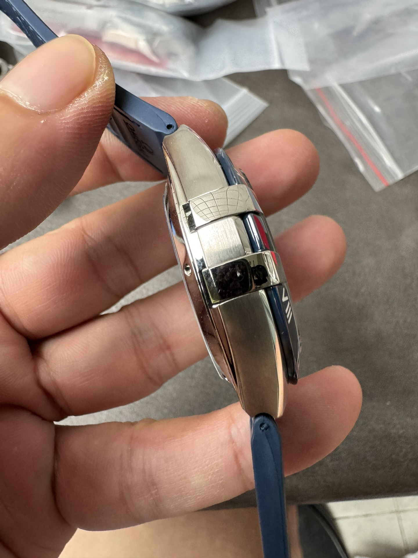 ストラップ: プレミアム ネイビーブルー アリゲーターエンボス レザーストラップ(汗に強いブラック ラバー裏地とステンレススチール フォールドオーバー デプロイアント クラスプ付き)