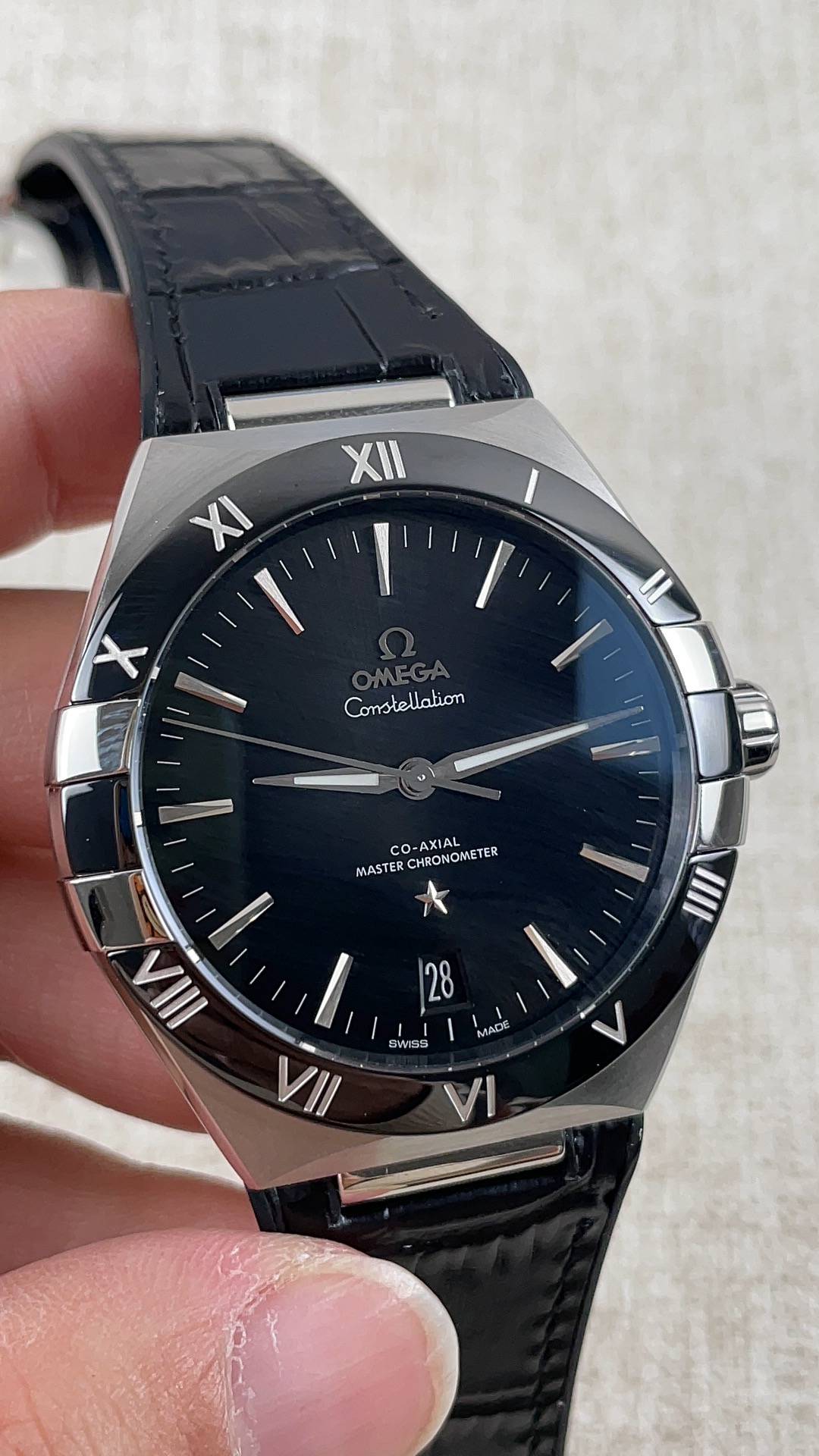 ブラック セラミック&リキッドメタル™ベゼル: モダンなコンステレーションの決定的な特徴はそのベゼルです。VSFはポリッシュ仕上げのブラックセラミック [ZrO2] インサートを完璧に複製しました。オメガ独自のリキッドメタル™技術を使用して、古典的なローマ数字はシルバートーンの合金でシームレスに満たされ、セラミックの表面と完全に面一になり、色あせに強くなっています。ベゼルは、3時と9時位置にある4つの象徴的で高度に研磨されたスチールの「爪」によって完全にグリップされています。