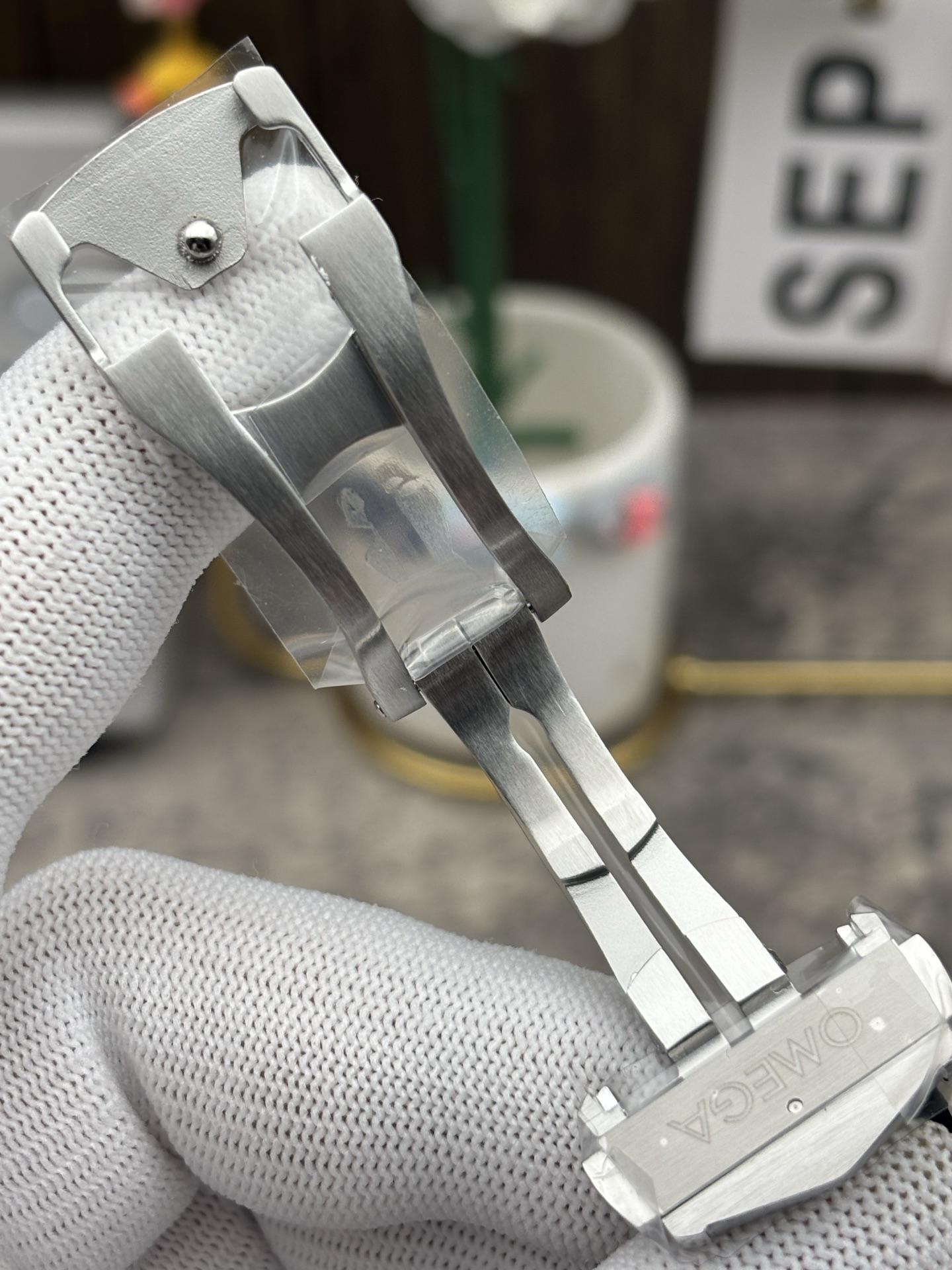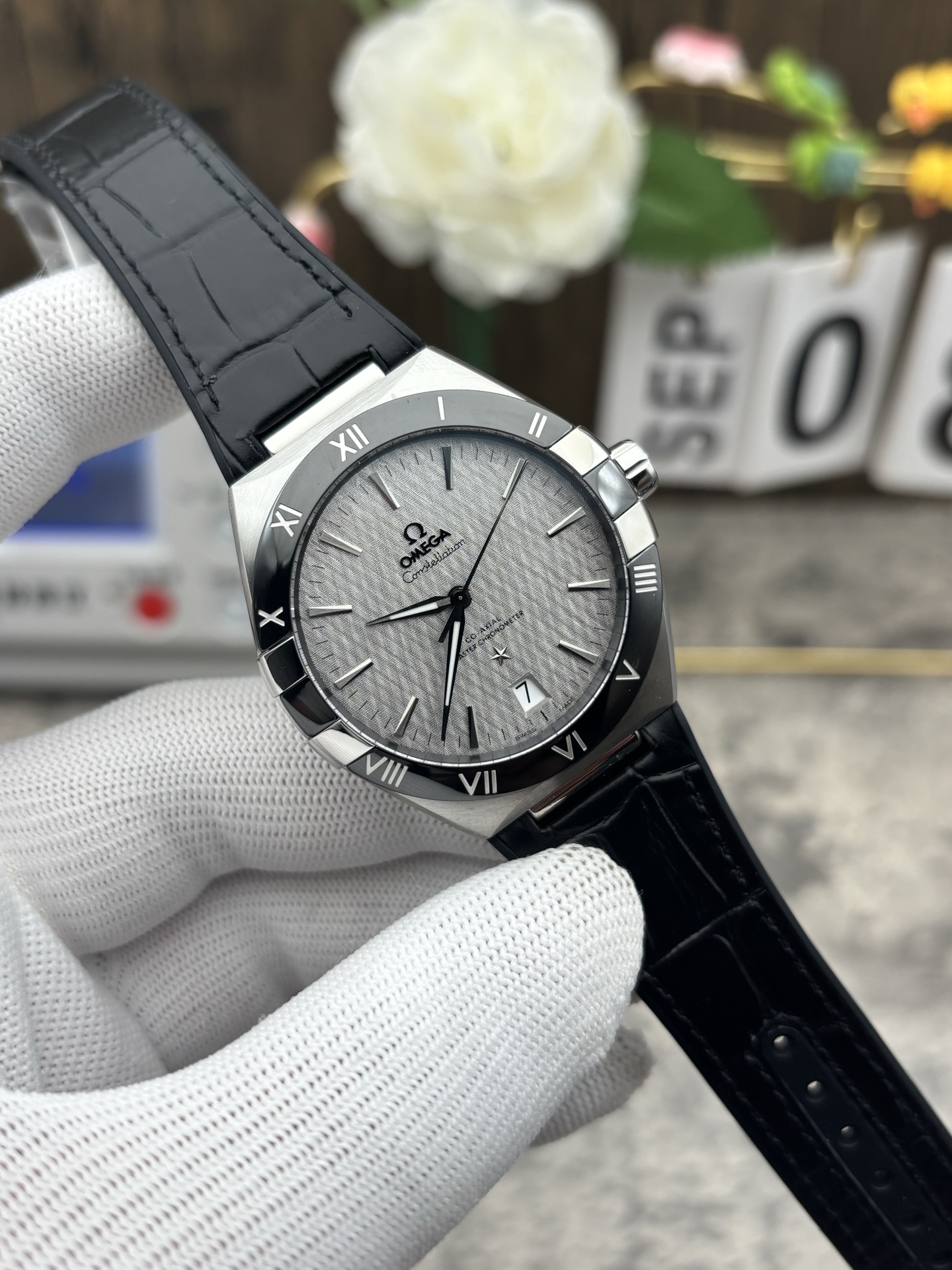 • ブラック セラミック&リキッドメタル™ベゼル: コンステレーションの決定的な特徴はそのベゼルです。VSFはポリッシュ仕上げのブラックセラミック [ZrO2] インサートを完璧に複製しました。オメガ独自のリキッドメタル™技術を使用して、古典的なローマ数字はシルバートーンの合金でシームレスに満たされ、セラミックの表面と完全に面一になり、色あせに強くなっています。ベゼルは、3時と9時位置にある4つの象徴的で高度に研磨されたスチールの「爪」によって完全にグリップされています。
