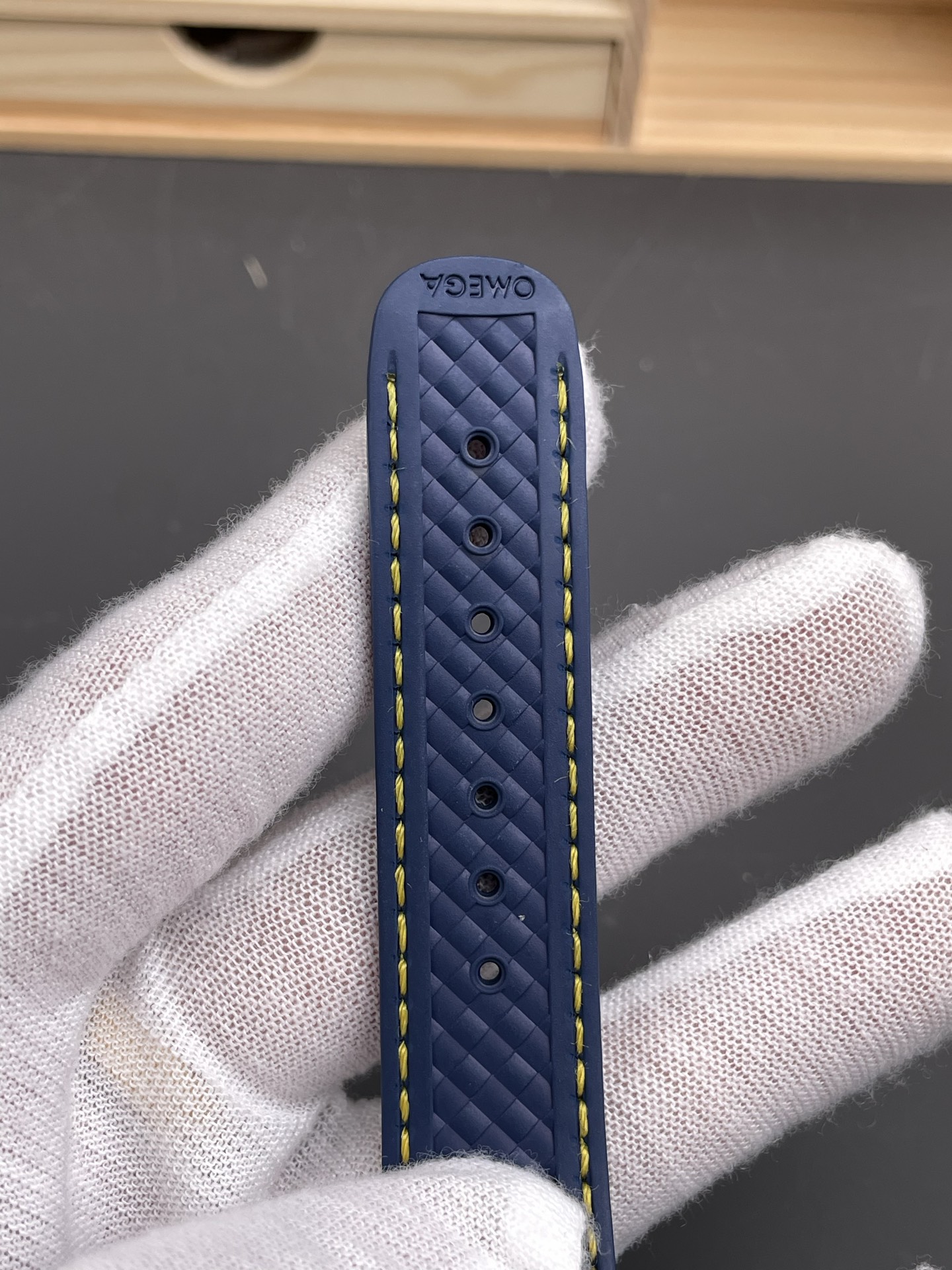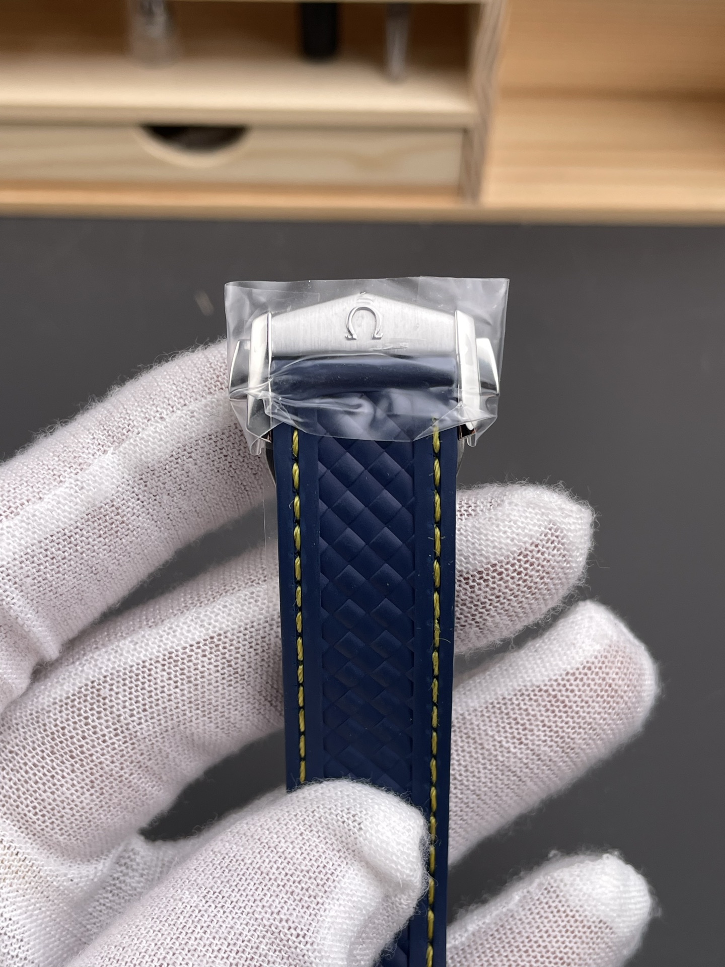 ストラップ: ディープブルー 構造化ラバーストラップ(鮮やかなイエローの対照的なステッチとステンレススチール フォールドオーバー デプロイアント クラスプ付き)