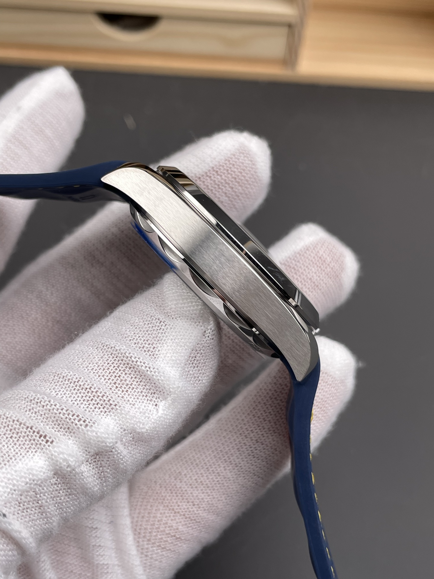 スポーティな統合型ラバーストラップ: レーシング/セーリングの美学に完全に傾倒したこのモデルは、文字盤に完璧にマッチする深くテクスチャー加工されたディープブルーの統合型ラバーストラップにマウントされています。織り込まれた帆布のようなパターンが特徴で、イエローの文字盤のアクセントを完璧に引き立てる2本の鮮やかなイエローの対照的なステッチでハイライトされています。高度に設計されたステンレススチール製のフォールドオーバー デプロイアント クラスプで固定されています。
