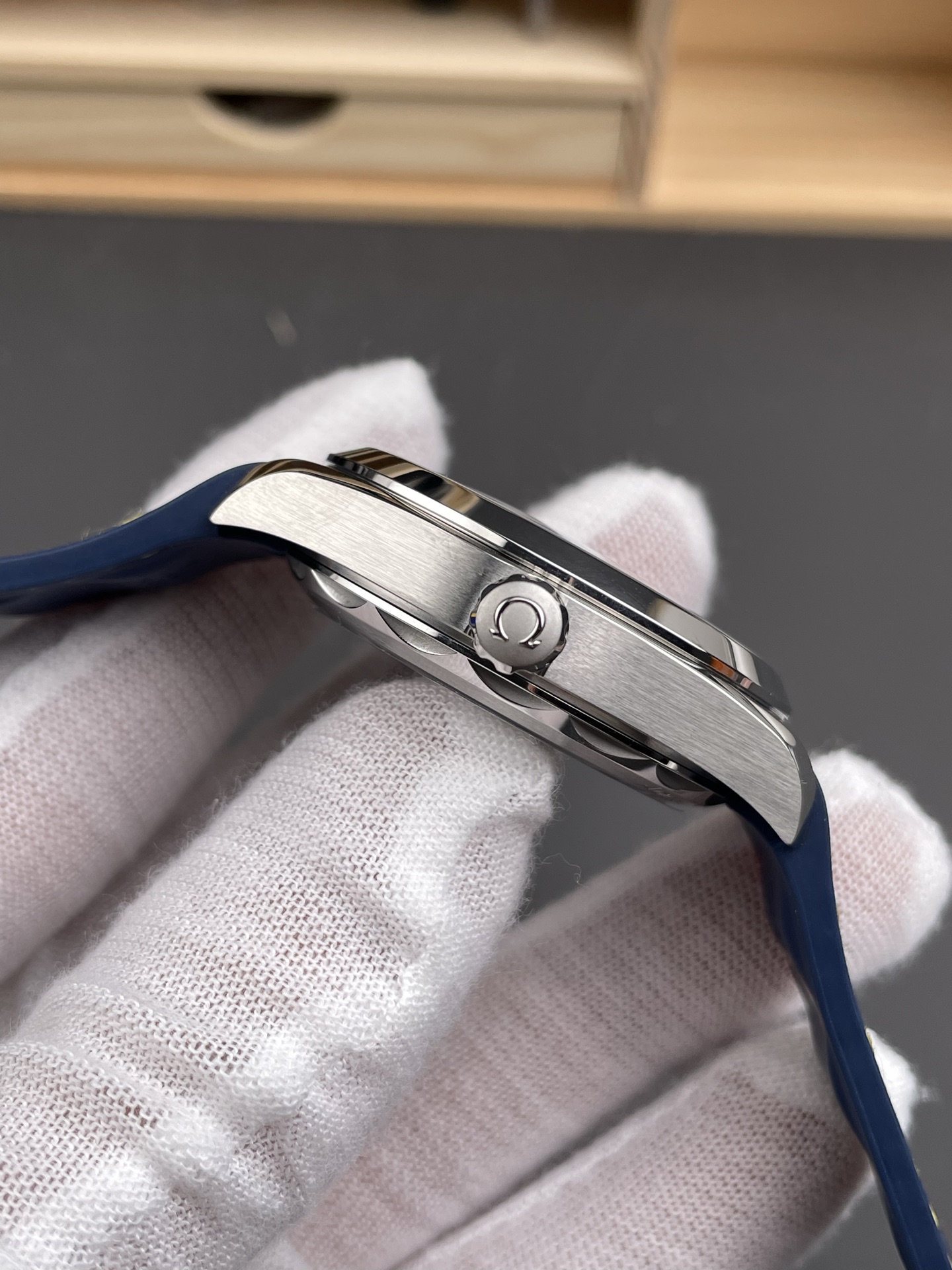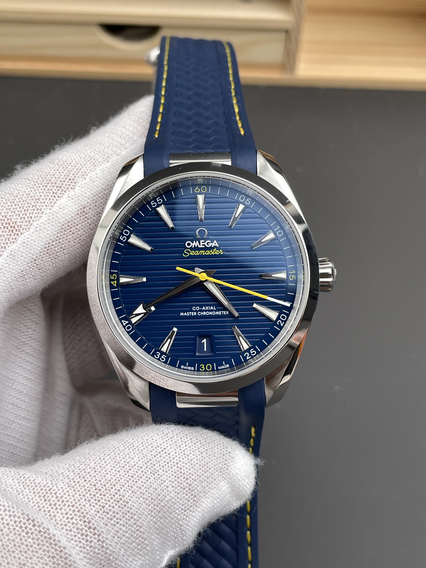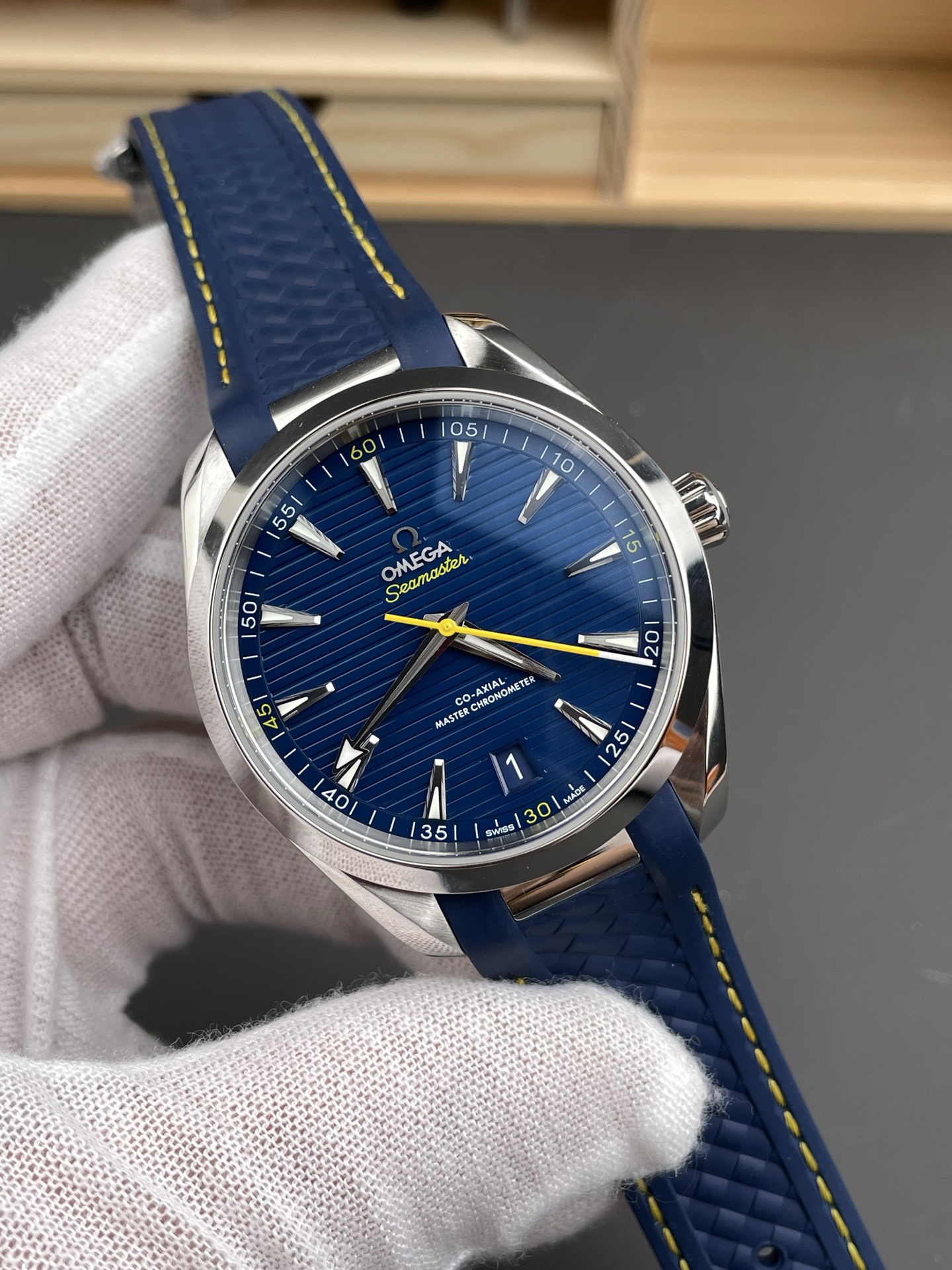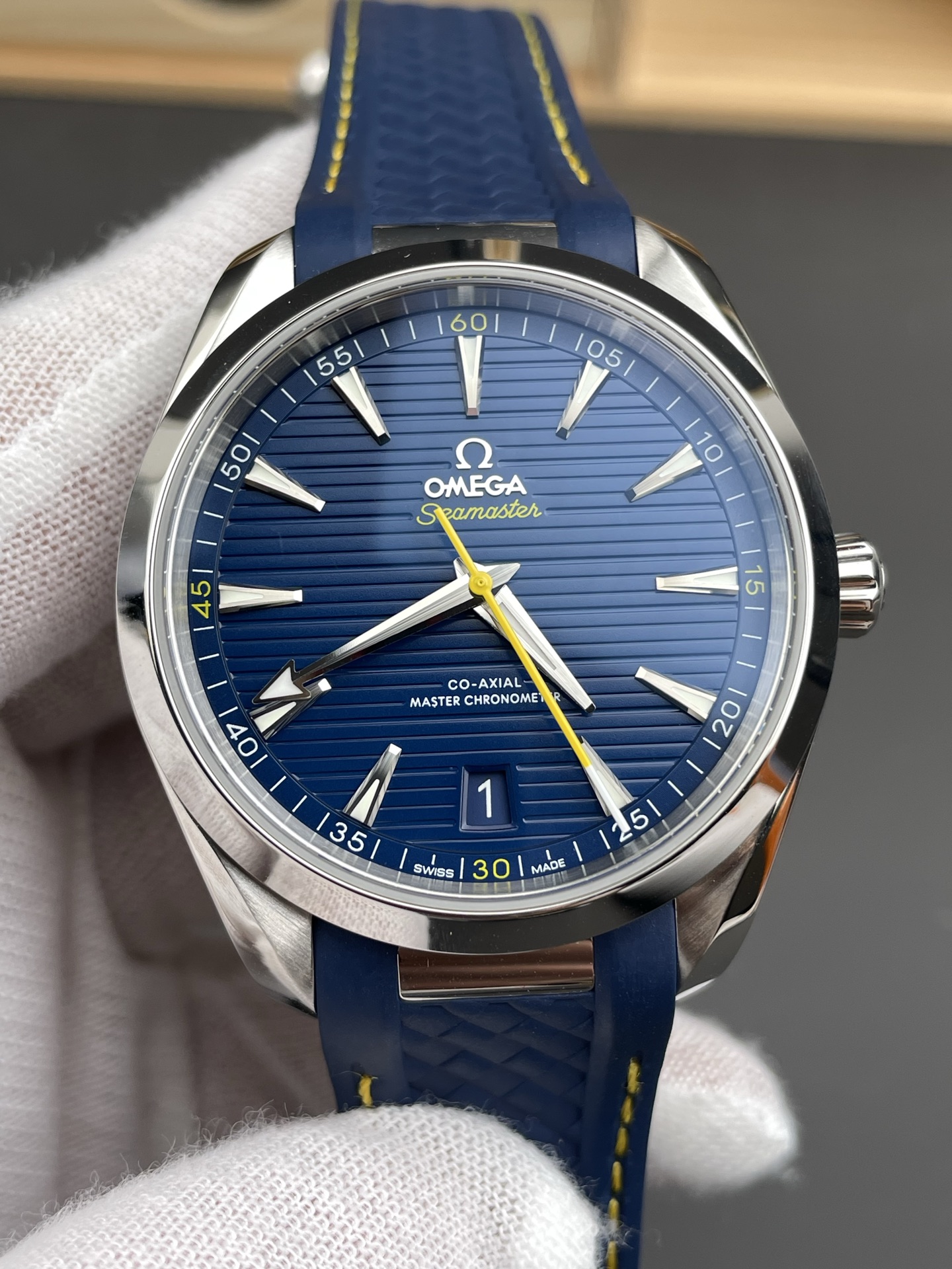 オメガ シーマスター アクアテラ 150M (リファレンス 220.12.41.21.03.001) は、スポーティなエレガンスの傑作であり、クラシックな海洋ドレスウォッチのDNAに鮮やかな色彩のバーストを完璧に注入しています。オメガ スーパークローンの誰もが認めるマスターである伝説的なVSファクトリー(VSF)によって完璧に実行されたこの1:1レプリカは、本物の印象的でハイコントラストな美学と洗練された建築デザインを捉えています。美しく輪郭を描かれた41mmのステンレススチールケースに収められ、モダンな水平の「チーク」デッキラインによって定義される輝くサンバースト ディープブルー文字盤を備えています。このリファレンスの絶対的な際立った特徴は、色の大胆な使用です。ブルーのラバーストラップにあるイエローの文字盤のテキストと対照的なイエローのステッチに完全に一致する、鮮やかなイエローのスイープ秒針です。業界をリードする丹東DD8900 1:1コーアクシャルクローンムーブメントを搭載し、完璧な信頼性、本物の「ジャンピング」アワー針機能、驚くべき装飾の精度を提供します。