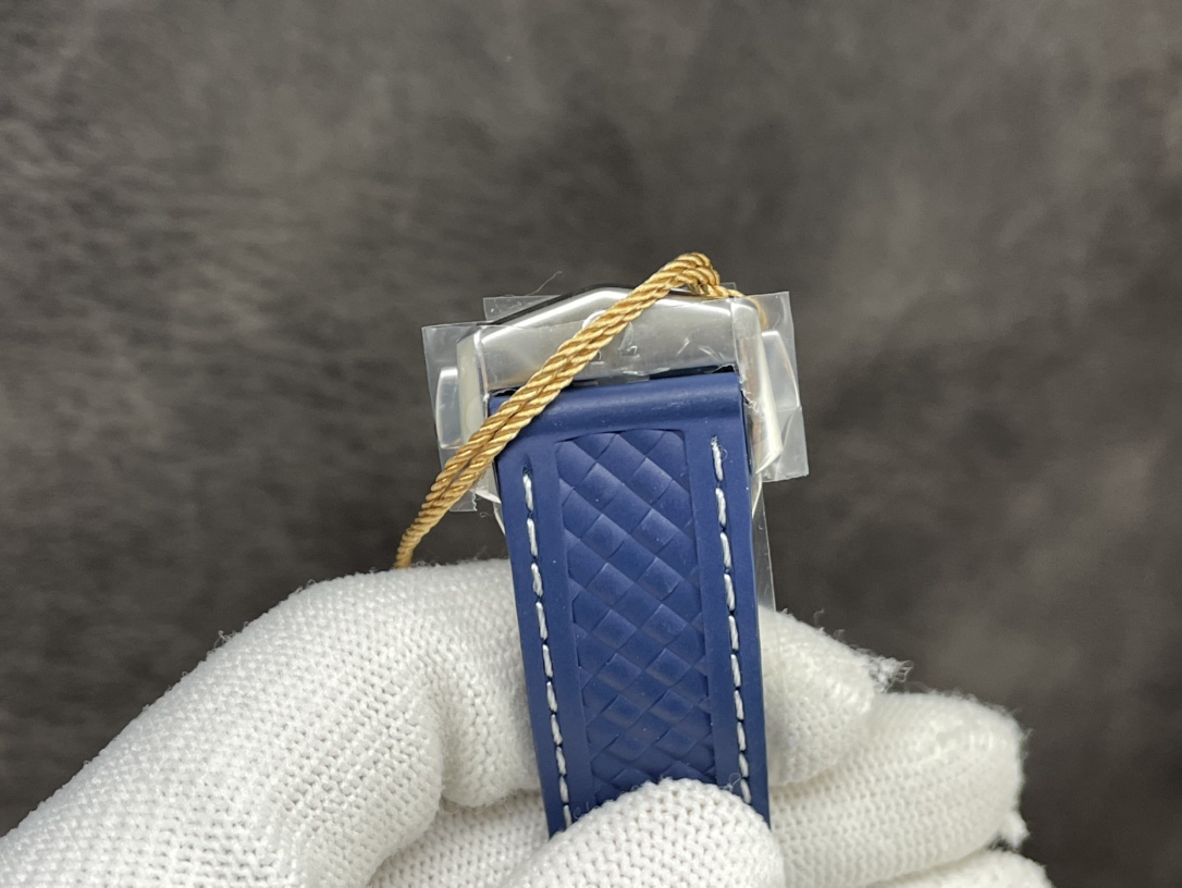 ゴールドリンクを備えた統合型ラバーストラップ: 豪華な水生の美学に完全に傾倒したこの時計は、織り込まれた帆布のようなパターンを特徴とする深くテクスチャー加工されたネイビーブルーの統合型ラバーストラップにマウントされています。ホワイトの対照的なステッチがアクセントになり、ステンレススチール製のデプロイアント クラスプで固定されており、セドナゴールドの統合リンクが追加されることで、ストラップがまとまりのある高価なジュエリーのように感じられます。