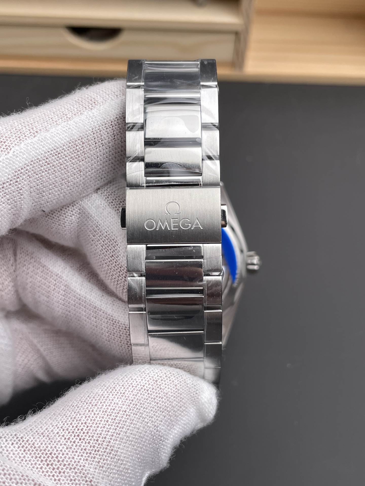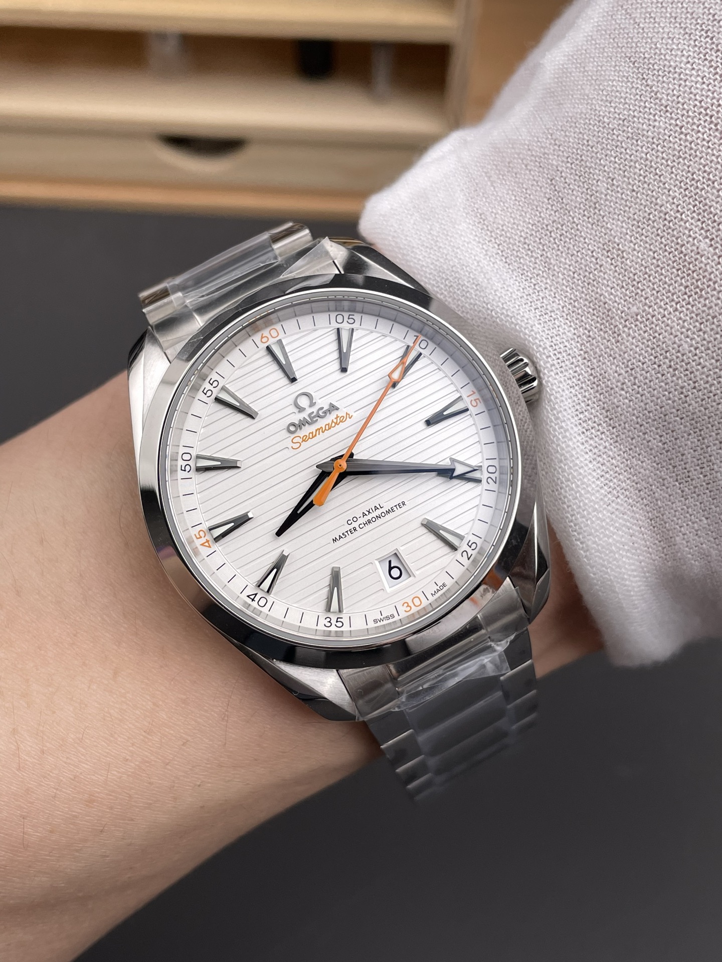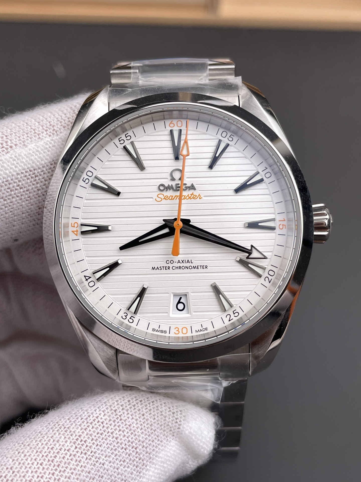 鮮明なホワイト「チーク」文字盤: 完璧な明るいキャンバスを提供する文字盤は、鮮やかでクリーンなシルバーホワイトで仕上げられたオメガのモダンな水平の「チーク」パターンを特徴としています。この明るい文字盤はアクアテラの個性を完全に変え、手首でわずかに大きく感じられ、夏の着用に信じられないほど新鮮な印象を与えます。