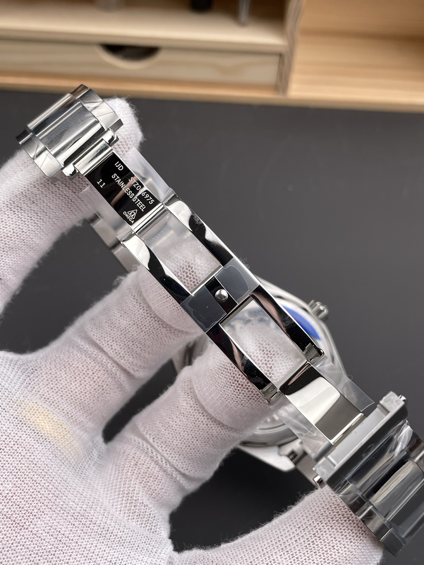 洗練されたステンレススチール ブレスレット: 3連のステンレススチールブレスレットは、スポーティな文字盤とのバランスを完全にとっています。高度に研磨された中央リンクをサテン仕上げの外側リンクで縁取っており、手首に豪華なジュエリーのようなドレープを提供します。途切れることのない完璧な外観のために、シームレスな隠しダブルデプロイアント バタフライクラスプで固定されています。