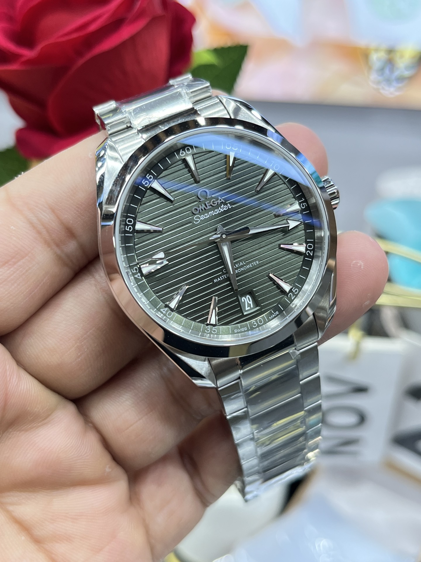 文字盤: サンブラッシュ仕上げ オリーブ/フォレストグリーン(水平「チーク」パターン、ロジウムメッキの針/インデックス、シルバーの文字盤テキスト付き)