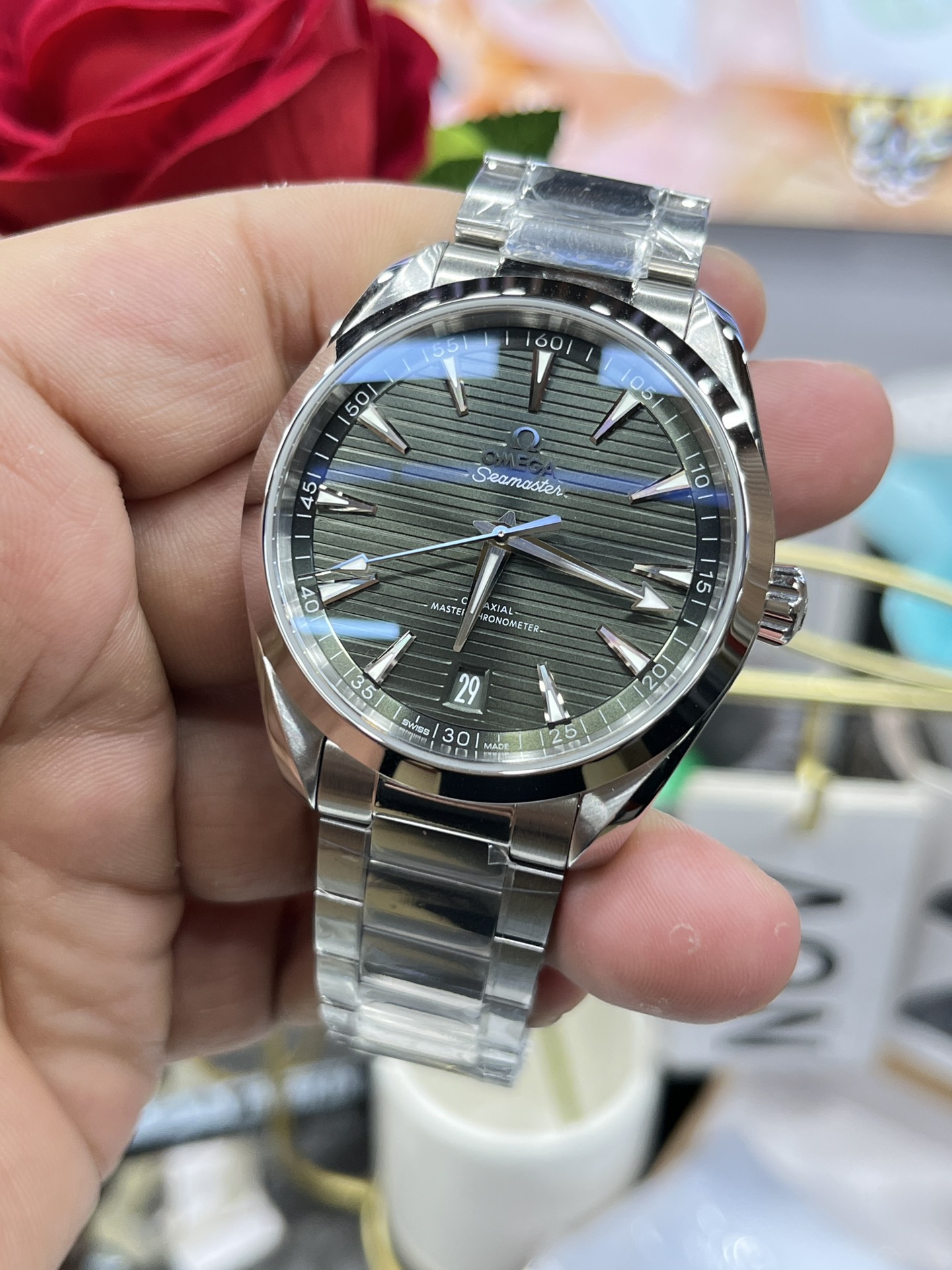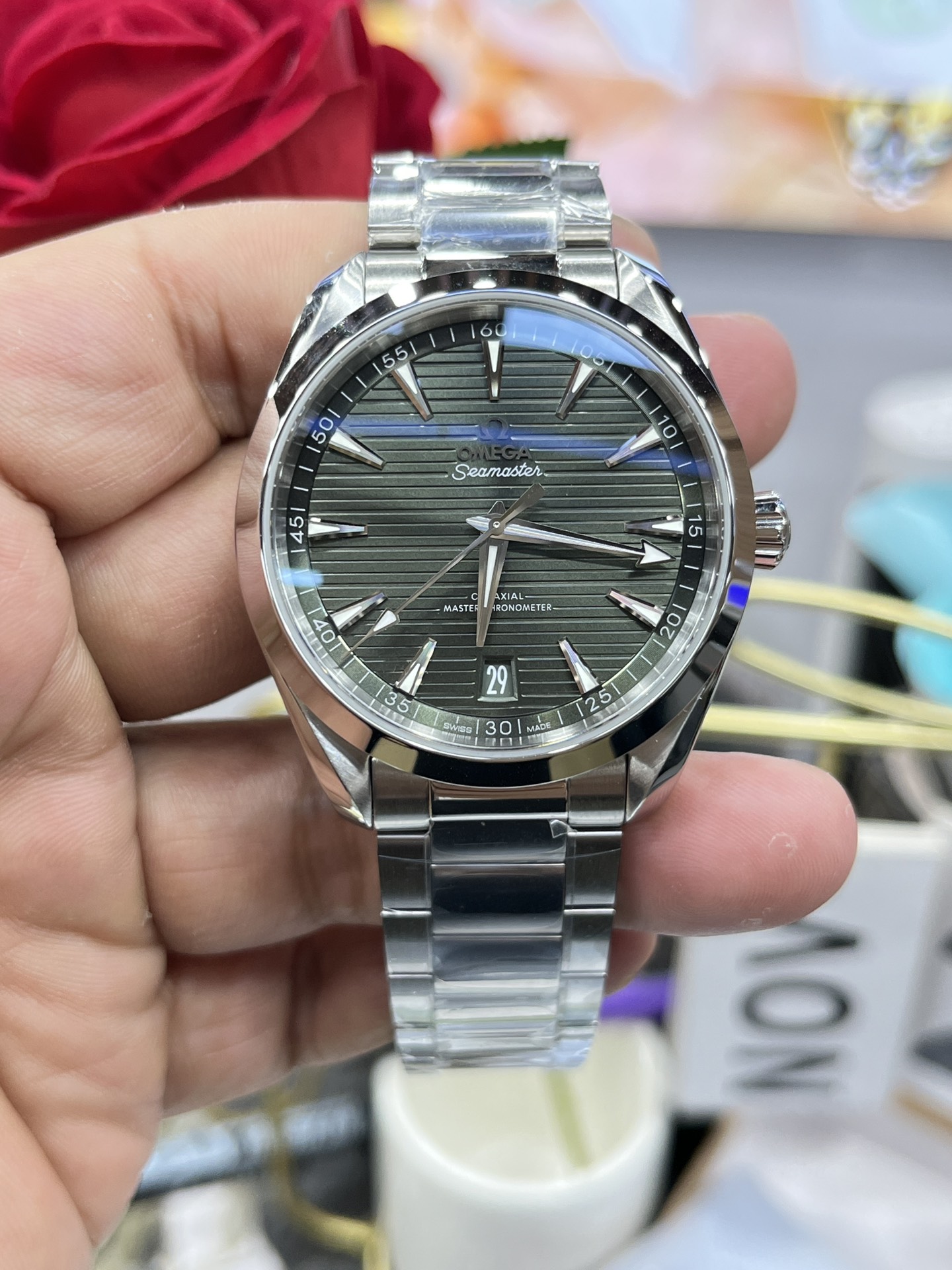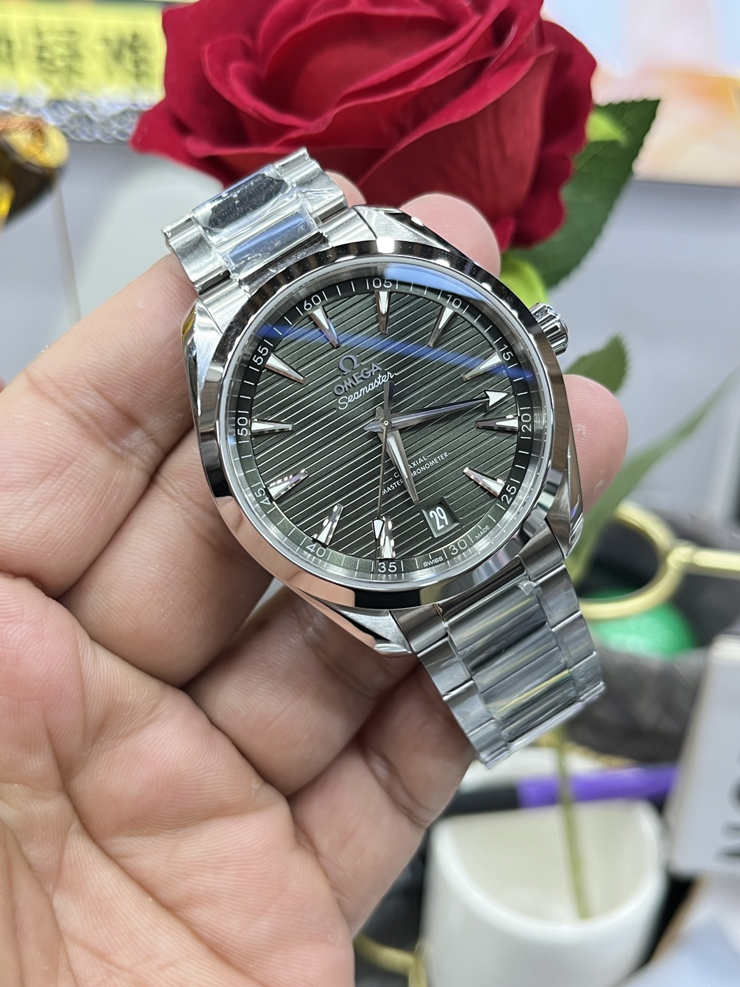 印象的なオリーブグリーン「チーク」文字盤: このリファレンスの絶対的な目玉はその驚異的な文字盤です。VSFはオメガのオリーブ/フォレストグリーンの正確な色合いを見事に複製しました。モダンな水平の「チーク」パターンと鮮やかなサンレイブラシ仕上げの組み合わせにより、文字盤はカメレオンのように機能し、暗い場所ではほぼ黒に見え、直射日光の下では鮮やかで豊かな緑色に爆発します。ファセットカットされたロジウムメッキのブロードアロー針とくさび形のインデックスは完璧なコントラストを提供し、明るいホワイトのスーパールミノバで満たされています。