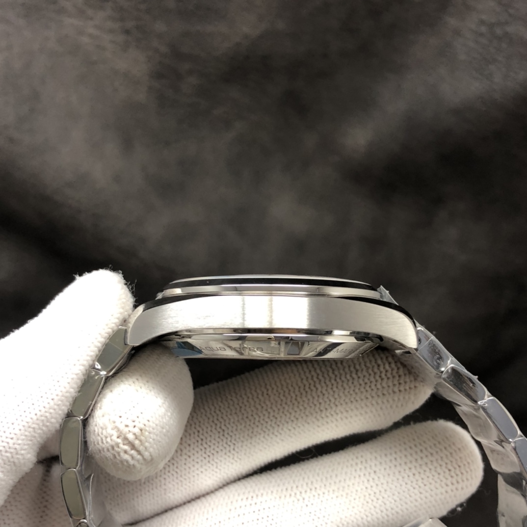 印象的なブルースチールのハードウェア: この特定のリファレンスの決定的な特徴は、壮観な文字盤のハードウェアです。VSFは、ファセットカットされたスケルトン化されたブロードアロー針と、くさび形のアワーマーカーの深くメタリックなブルーの仕上げを完璧に複製しました。照明に応じて、これらの要素は明るく鮮やかな青からほとんどステルスなダークネイビーへと変化し、明るいグレーの文字盤に対して信じられないほどのコントラストを提供します。