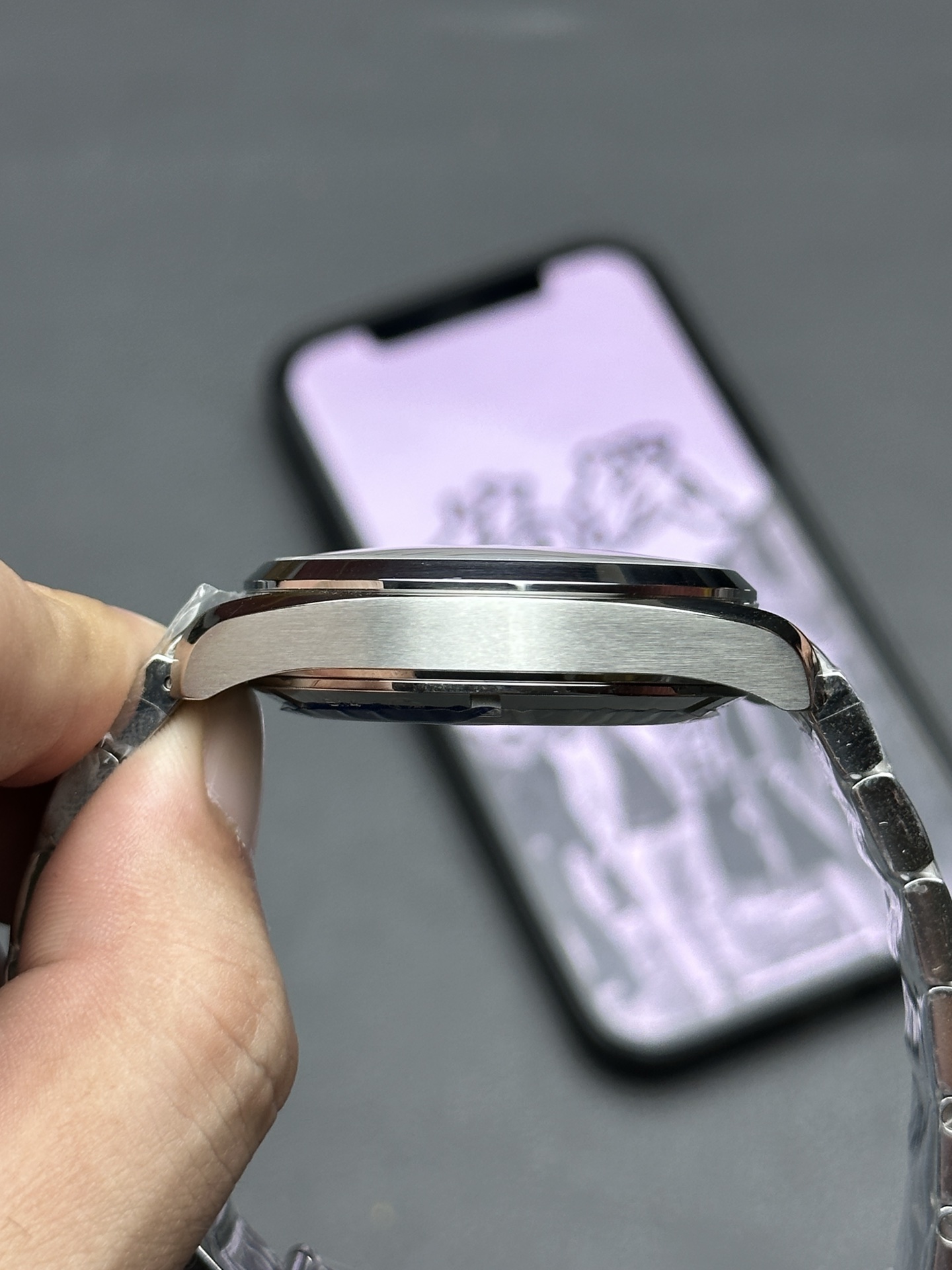 クラシックな8500時代のプロポーション: 新しい41mmモデルとは異なり、この特定のリファレンスは非常に人気のある41.5mmのケースサイズを維持し、元の青写真に完全に忠実に、3時位置にきれいに縁取られた日付ウィンドウを備えています。ケースは、特徴的なねじれた「ライアー(竪琴)」ラグに沿って、細かいサテンブラシ仕上げの表面と高度に研磨された流れるような面取りをシームレスにブレンドしています。