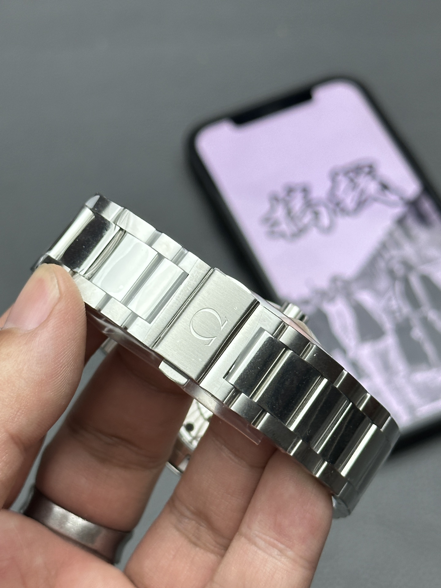 洗練されたステンレススチール ブレスレット: 3連のステンレススチールブレスレットは、スポーティな41.5mmケースとのバランスを完全にとっています。高度に研磨された中央リンクをサテン仕上げの外側リンクで縁取っており、手首に豪華なジュエリーのようなドレープを提供します。途切れることのない完璧な外観のために、シームレスな隠しダブルデプロイアント バタフライクラスプで固定されています。