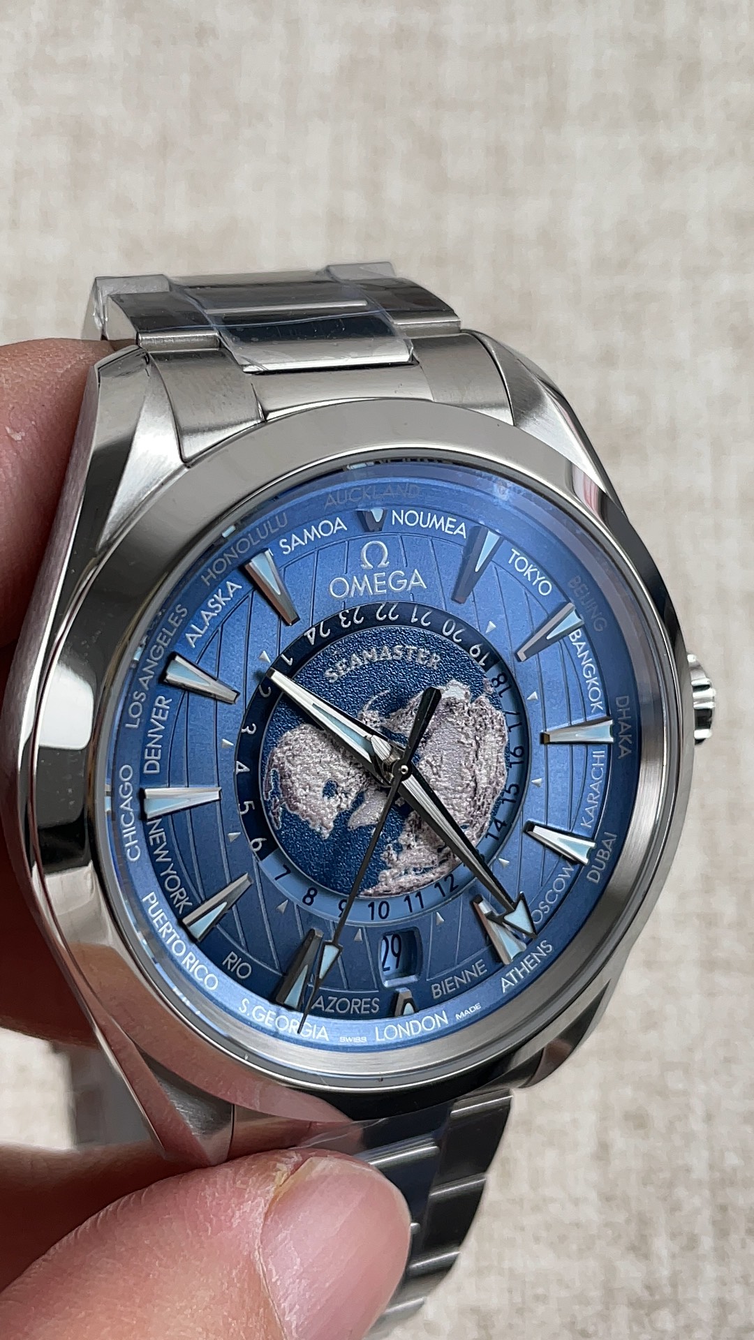 威厳のある43mmケース: 視認性を犠牲にすることなく、非常に複雑なワールドタイマー ディスプレイに対応するために、時計はより大きな43mmのステンレススチールケースを利用しています。オメガの特徴であるねじれた「ライアー(竪琴)」ラグを披露し、ブラシ仕上げの側面と高度に研磨された流れるような面取りを美しく交互に繰り返し、計り知れない手首の存在感を与えています。