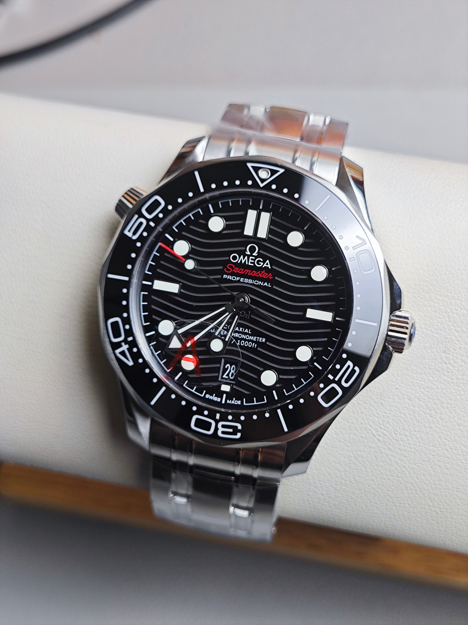 文字盤: ポリッシュ仕上げ ブラック セラミック [ZrO2](レーザー彫刻の波模様、夜光インデックス、赤い「Seamaster」テキスト付き)