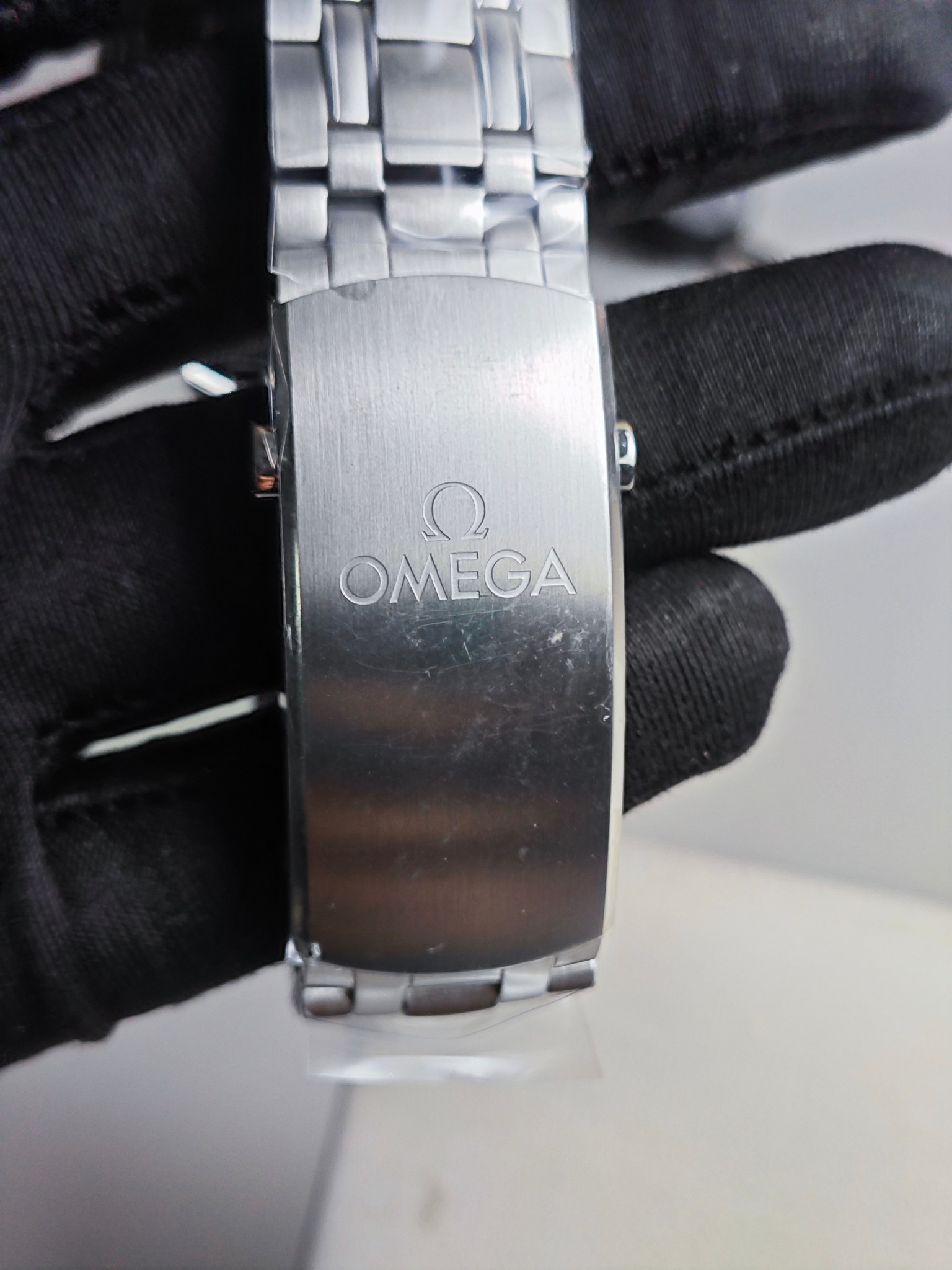 複雑な5連ステンレススチール ブレスレット: このヘビーデューティーで高度に連結されたブレスレットは、シーマスターのシグネチャーです。サテン仕上げの外側と中央のリンクで縁取られた2つのポリッシュ仕上げのインナーリンクを特徴とし、手首に豪華な存在感を提供します。ウェットスーツや暑い日のむくんだ手首に完璧にフィットする、使いやすいプッシュボタン式の微調整システムを備えた堅牢なデプロイアントクラスプで固定されています。