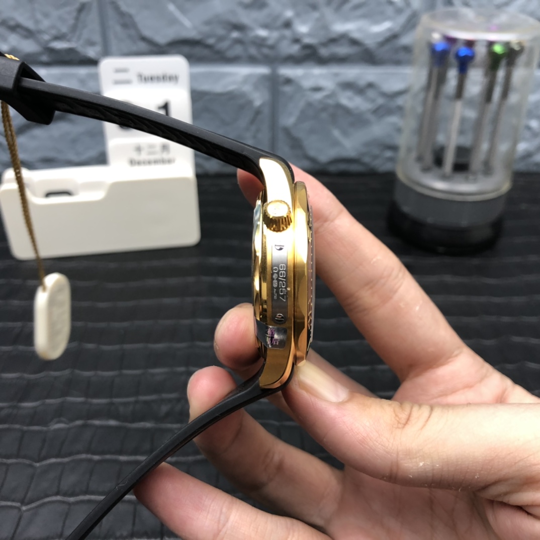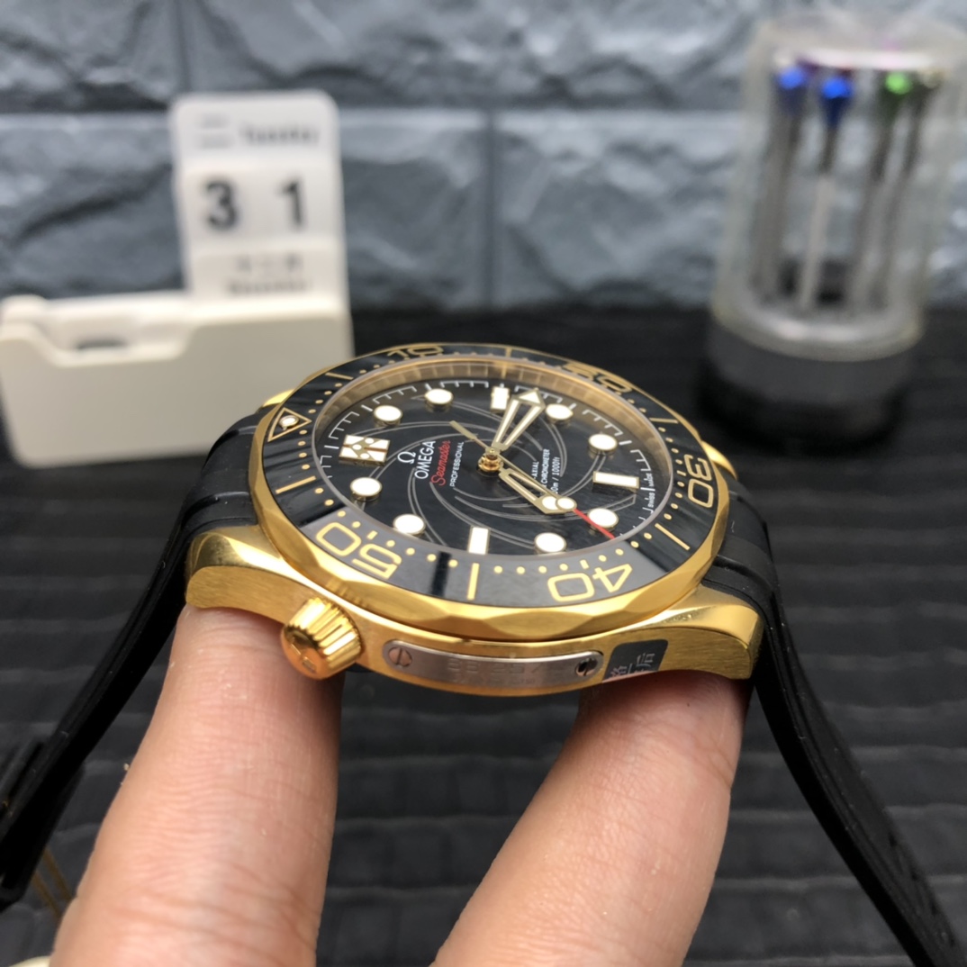 厚塗りの18Kイエローゴールド&Ceragold™: 42mmのケースは、豊かな18Kイエローゴールドで厚く電気メッキされたプレミアム316Lステンレススチールのコアを利用しています。逆回転防止ベゼルは、傷がつきにくい光沢のあるブラックセラミックで作られています。標準的なホワイトエナメルの代わりに、VSFはオメガのCeragold™プロセスを完璧に複製し、ダイビングスケールの数字をイエローゴールドで満たして、ケースと文字盤のアクセントに完全に一致させました。