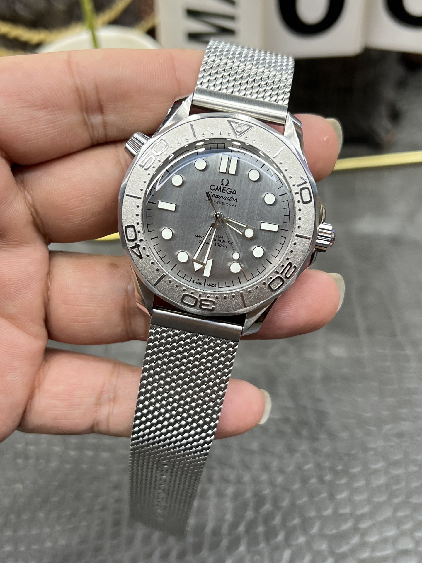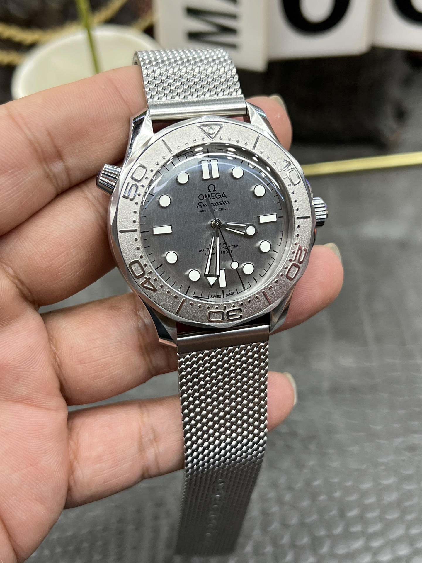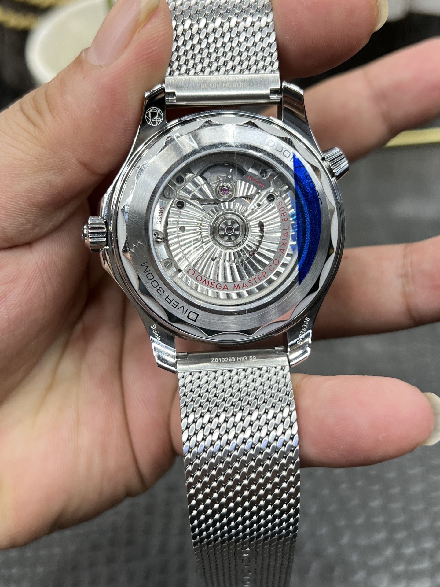 クラシックなウェーブ文字盤とロリポップ針: 文字盤もブルーの陽極酸化アルミニウムで作られており、90年代の美学を彷彿とさせる、より細かく、より密集したレーザー彫刻の波模様が特徴です。VSFは、モダンな300Mラインの標準的な赤い先端のアロー針とは明確に異なる、ユニークな白塗りの「ロリポップ」スイープ秒針を完璧に複製しました。
