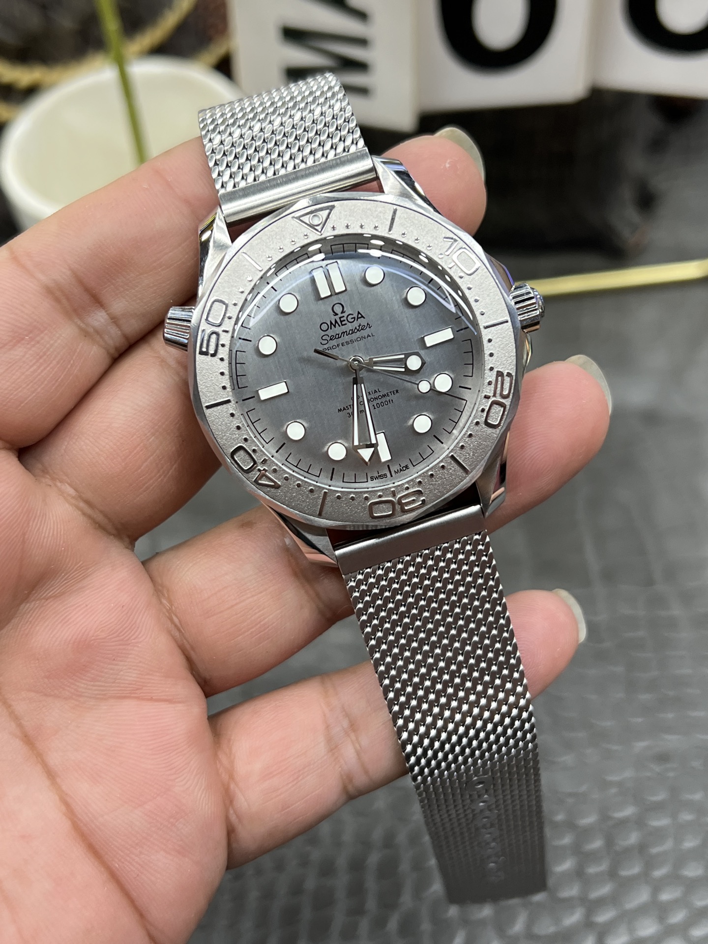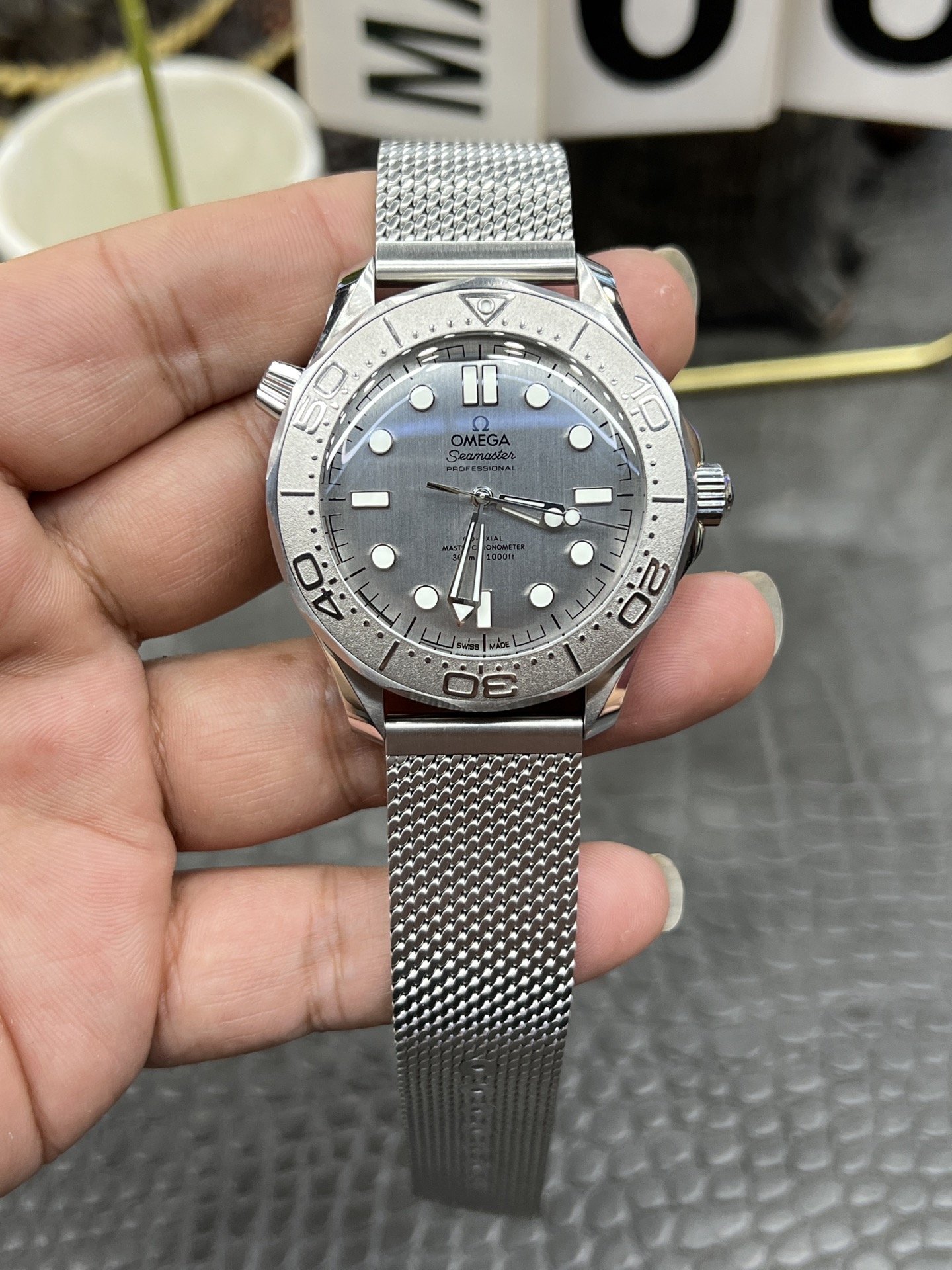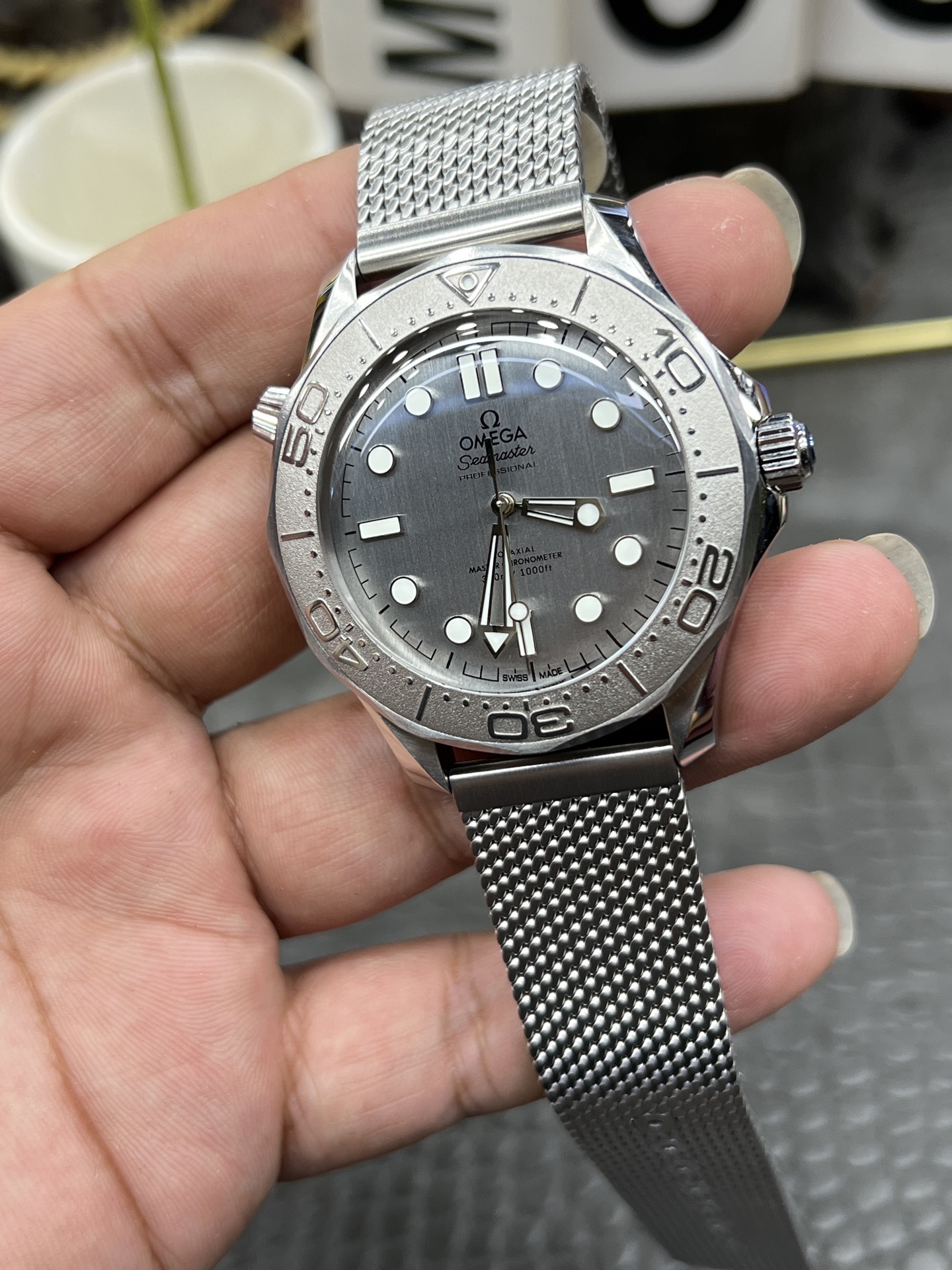 クラシックなウェーブ文字盤とロリポップ針: 文字盤もブルーの陽極酸化アルミニウムで作られており、90年代の美学を彷彿とさせる、より細かく、より密集したレーザー彫刻の波模様が特徴です。VSFは、モダンな300Mラインの標準的な赤い先端のアロー針とは明確に異なる、ユニークな白塗りの「ロリポップ」スイープ秒針を完璧に複製しました。