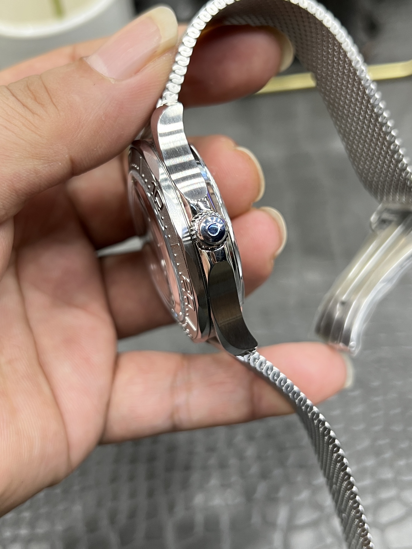 ステンレススチール メッシュ ブレスレット: VSFは、今回はチタンではなくヘビーデューティーな316Lステンレススチールでレンダリングされた複雑なミラネーゼ メッシュ ブレスレットを美しく複製しました。しなやかで通気性があり、手首に非常に快適にフィットし、どんな任務中でもロックされたままになるように高度に設計されたフォールドオーバー(折りたたみ式)調節可能なクラスプで固定されています。