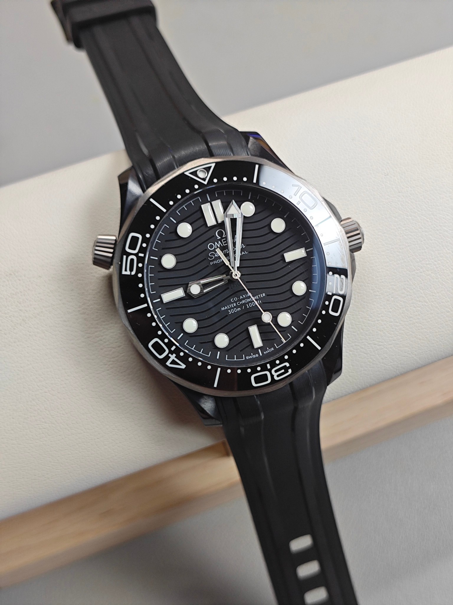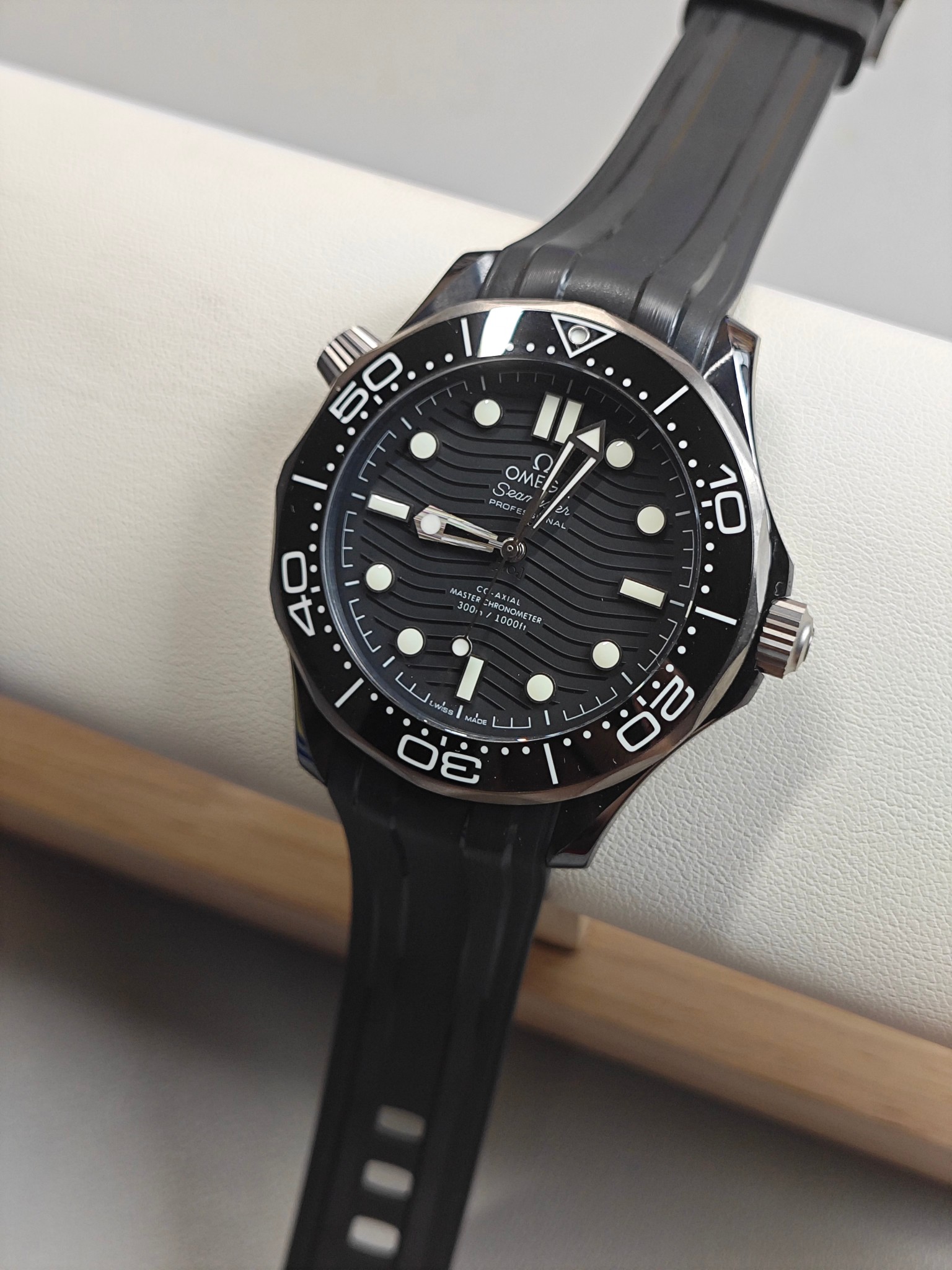 ポジティブレリーフ 波文字盤: 波が文字盤に「彫り込まれている」標準的なシーマスターとは異なり、この特定のリファレンスは、レーザーアブレーションを使用して背景を削り取り、象徴的な波を「ポジティブレリーフ(浮き彫り)」で隆起させています。VSFはこの複雑な3Dテクスチャを完璧に実行しました。スケルトン化された針とアプライド・アワーマーカーは、一致するチタンで作られ、低照度の視認性を最大化するために明るいホワイトのスーパールミノバで満たされています。
