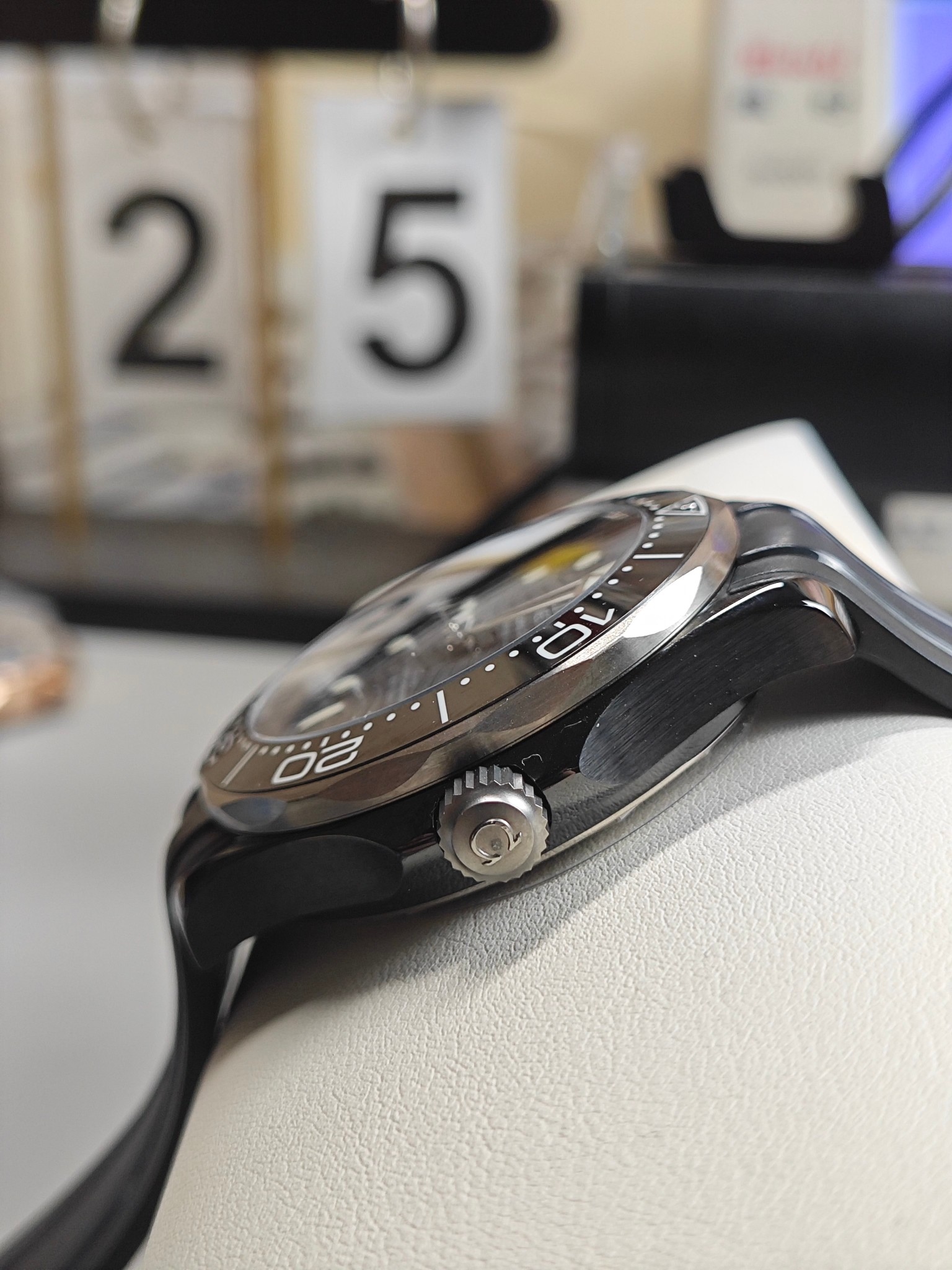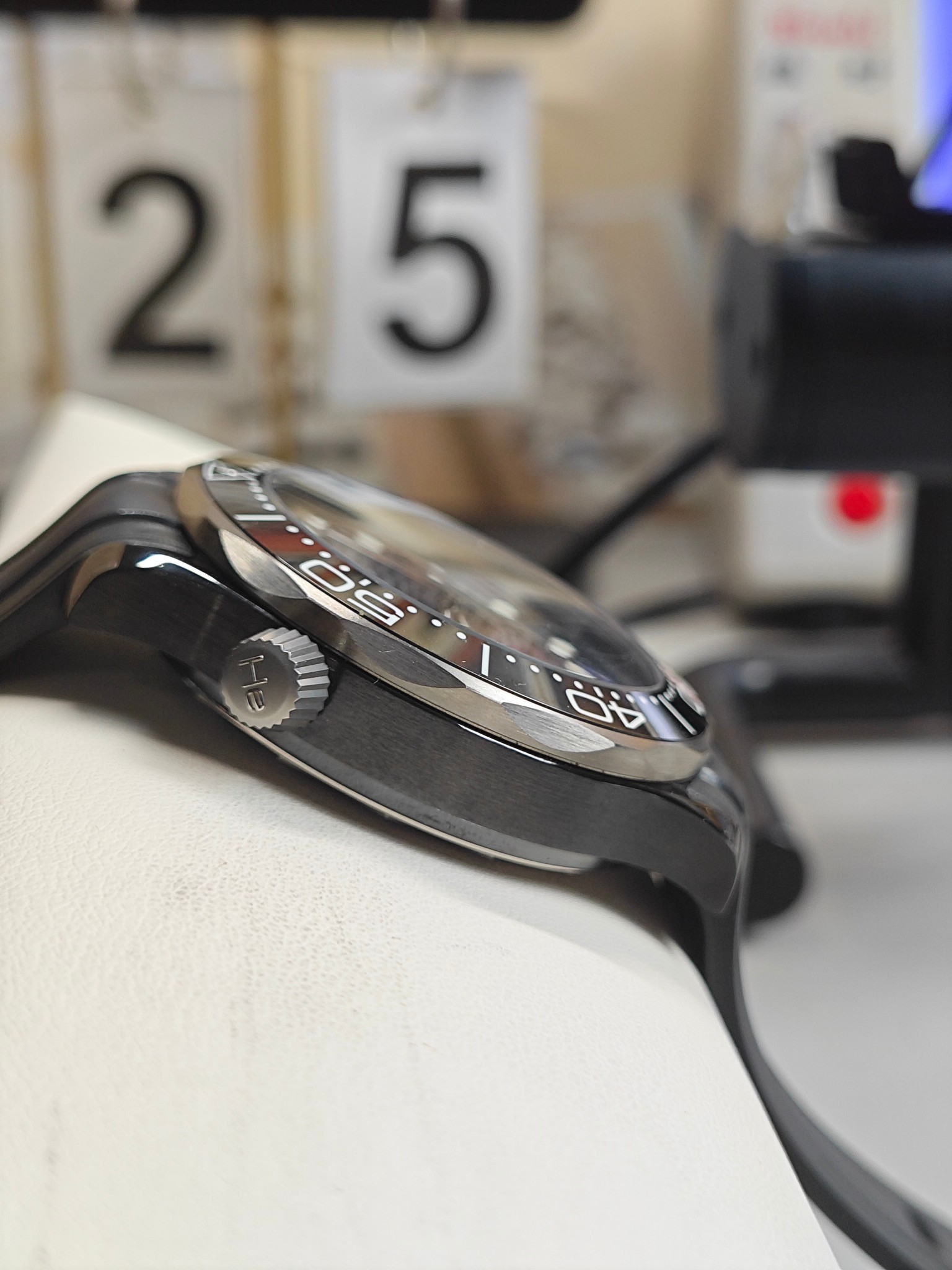 グレード5 チタン アクセント: ステルスなブラックのプロファイルを分割するために、オメガはハードウェアに航空宇宙グレードのチタンを利用しました。VSFはこれを完璧に複製し、ローレット加工された逆回転防止ベゼルリング、3時位置の巻き上げリューズ、および10時位置の円錐形のヘリウムエスケープバルブに本物のグレード5チタンを使用しています。