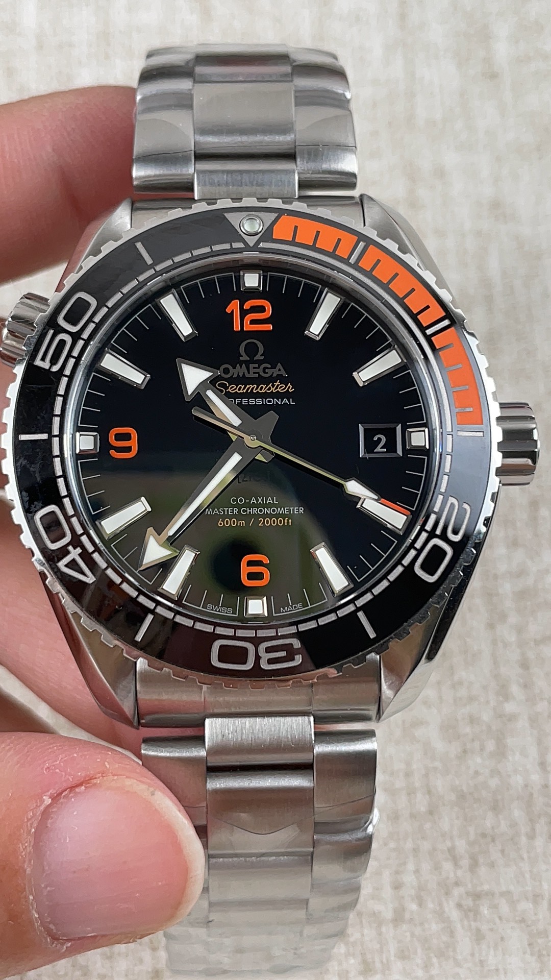 光沢のあるブラック セラミック文字盤: 文字盤は深く鏡のような仕上げを提供し、ポリッシュ仕上げされたブラックセラミックの固体ブロックから作られています(微妙な [ZrO2] の刻印で示されています)。鮮やかなベゼルに完璧にマッチするように、VSFは6時、9時、12時の位置に明るいオレンジ色のアラビア数字を配置し、オレンジ色の「Seamaster」スクリプトとスイープする秒針のオレンジ色の先端を組み合わせました。