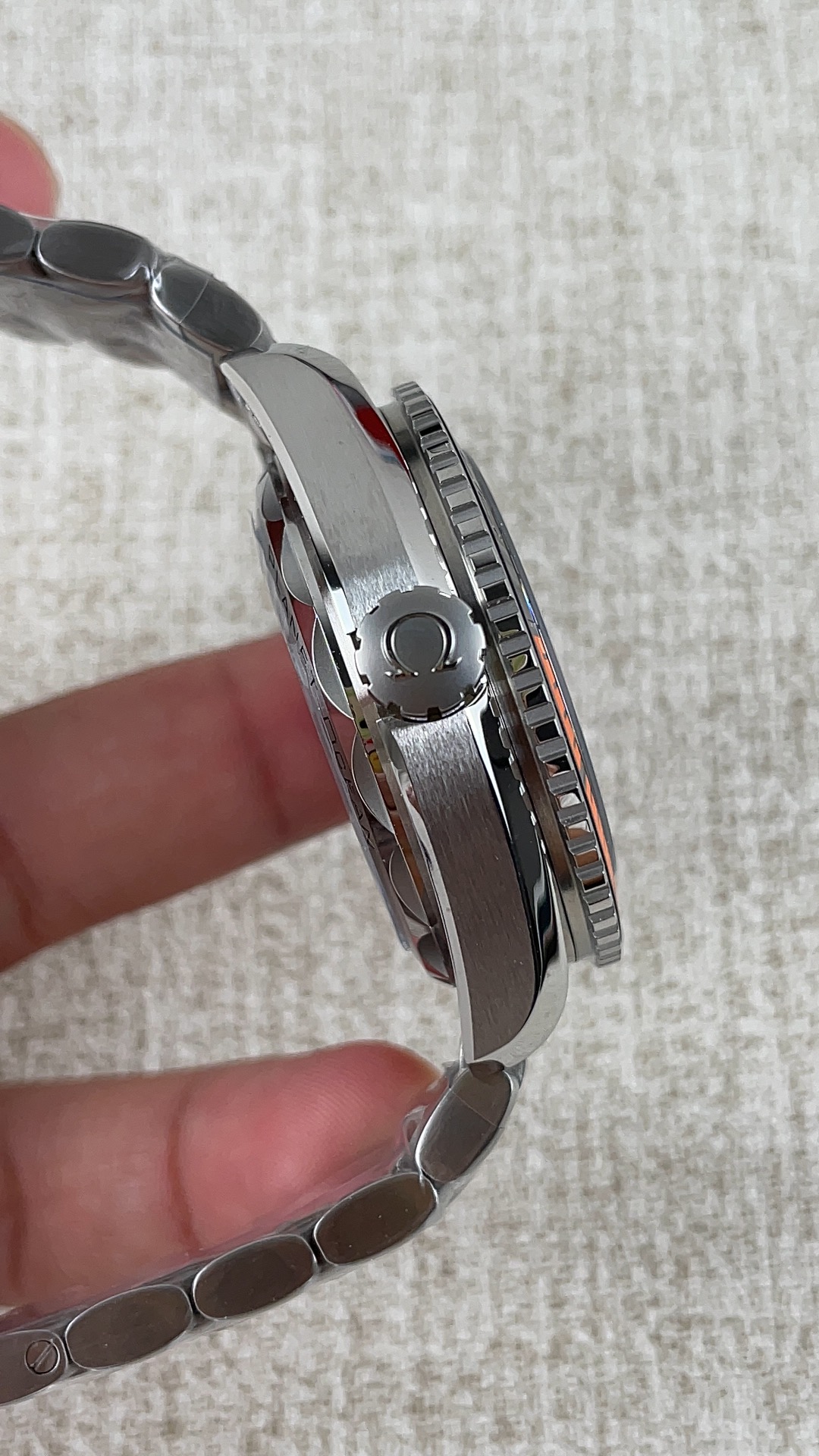 革新的なブレンド セラミックベゼル: VSFは、ゴムとセラミックをブレンドするというオメガの画期的な技術を完璧に複製しました。逆回転防止の光沢のあるブラックセラミックベゼルは、ダイビングスケールの最初の15分間に直接注入された鮮やかなオレンジ色の加硫ゴムを特徴としています。スケールの残りの部分は信じられないほど耐久性のあるシルバーのリキッドメタル™ で満たされており、マーキングが平らなままであり、時間の経過とともに色あせたり、黄色くなったり、変色したりしないようにしています。