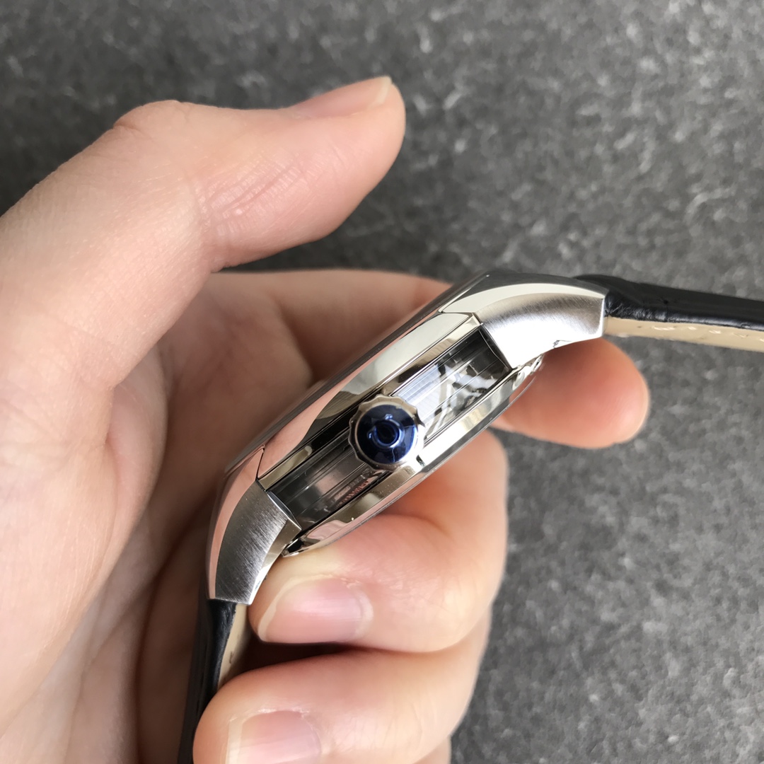 • ロジウムメッキのハードウェア: ディープブルーの文字盤に対して鮮やかでモダンな閃光を提供するために、スリムでファセットカットされた時針と分針、そして極薄のスイープする中央の秒針は、鏡のような輝きに完璧にロジウムメッキされています。