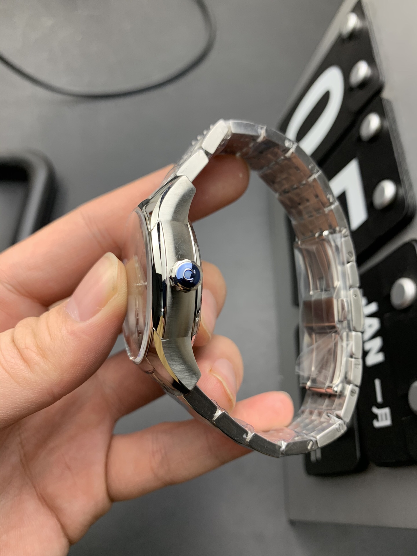 ロジウムメッキのハードウェア: ブルーの文字盤に対して鮮やかでモダンなコントラストを提供するために、適用されたローマ数字(II、IV、VI、VIII、IX、X、XIIに配置)と交互のカボションマーカーは、鏡のような輝きに完璧にロジウムメッキされています。クラシックなリーフ型の時針と分針、そして極薄のスイープする中央の秒針は、この明るいシルバートーンに完全に一致しています。