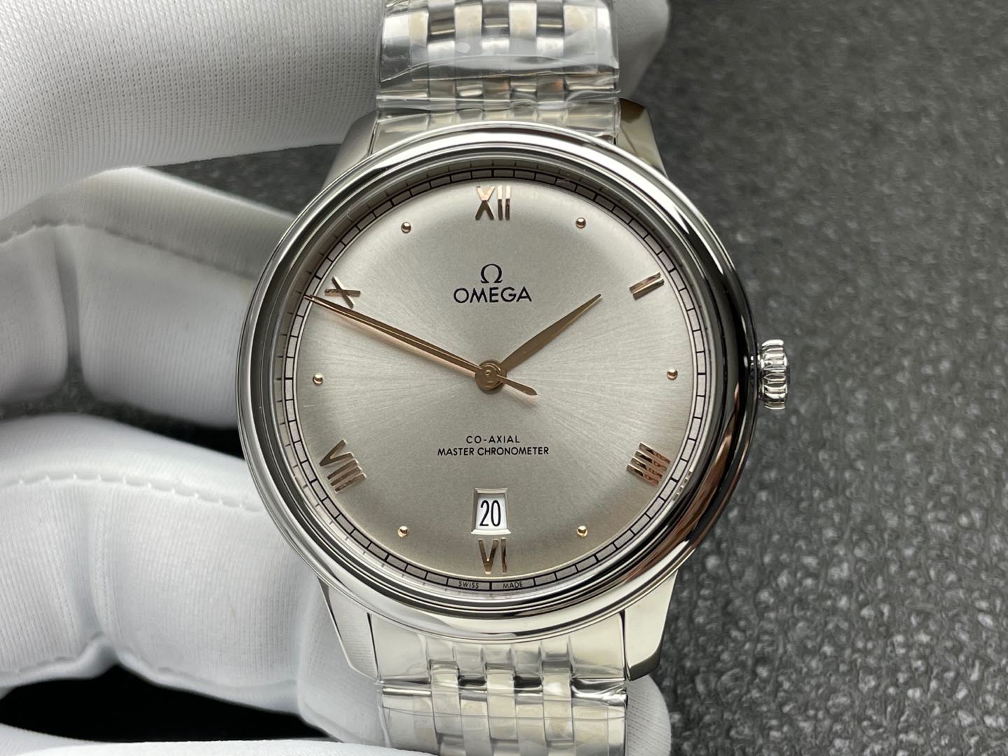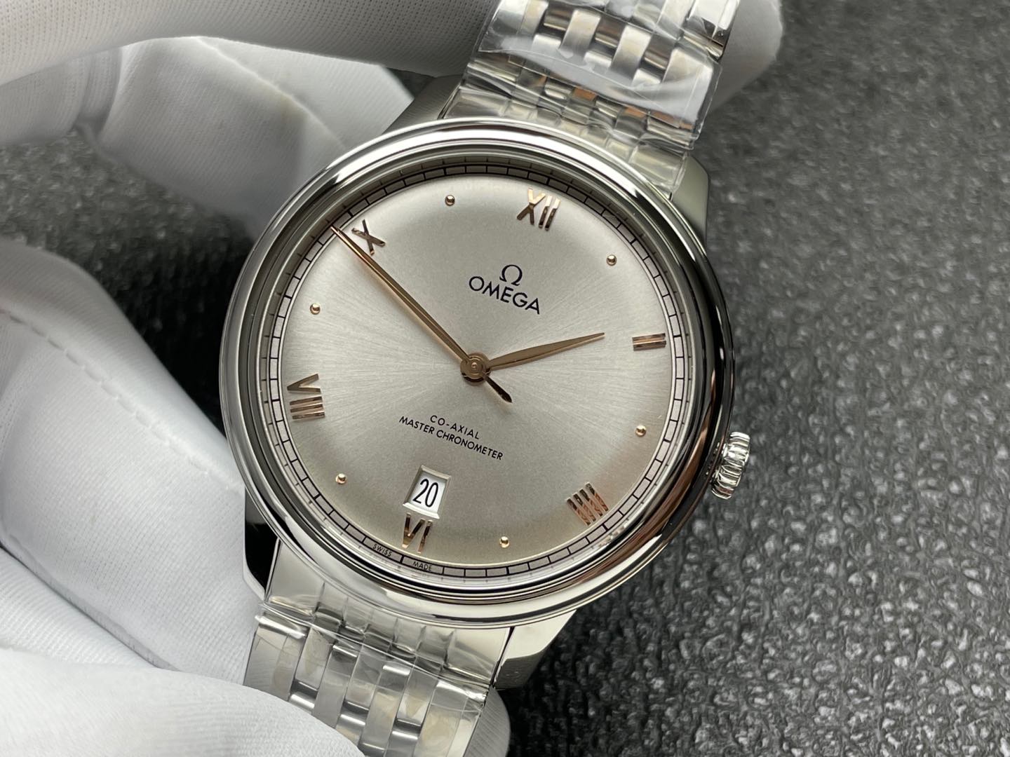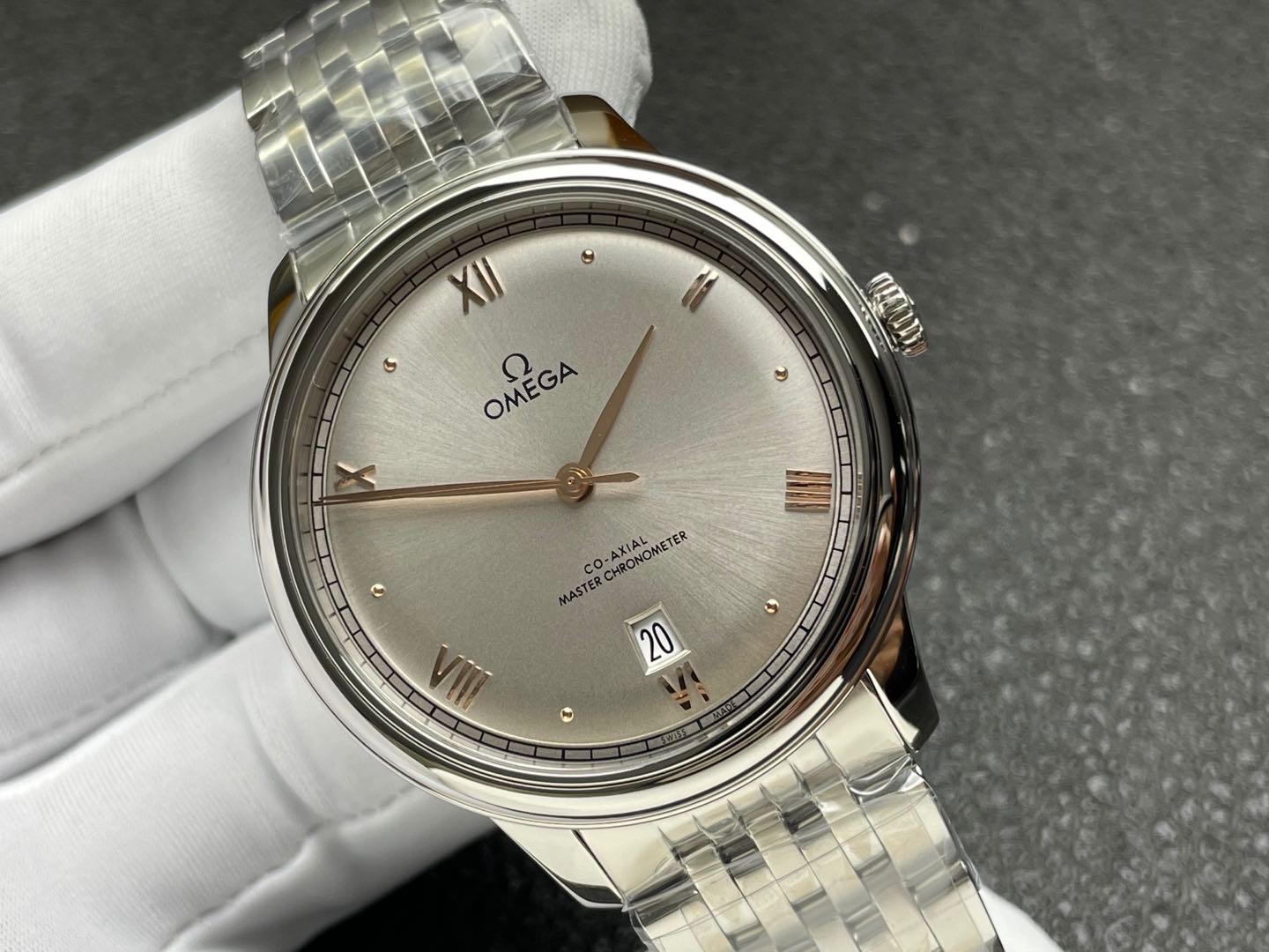 オメガ デ・ヴィル プレステージ (リファレンス 434.10.40.20.02.002) は、貴金属の色調の温かみのあるタッチによって高められた、クラシックで控えめなドレスウォッチのエレガンスの絶対的な頂点を表しています。伝説的なVSファクトリー(VSF)によって完璧に実行されたこの1:1レプリカは、本物の第3世代モデルのヴィンテージにインスパイアされた魅力とモダンな建築デザインを捉えています。美しくスレンダーな完全ポリッシュ仕上げの40mmステンレススチールケースに収められ、オメガ独自の18Kセドナ(ローズ)ゴールドでメッキされた針とローマ数字によって命を吹き込まれたドーム型のシルバー/オパーリン文字盤を備えています。コレクションの特徴的なマルチリンク ステンレススチール ブレスレットにマウントされたこの時計は、伝統的なスチールとツートンのラグジュアリーの間のギャップを楽々と埋めます。信じられないほど信頼性の高い丹東DD8800 1:1コーアクシャルクローンムーブメントを搭載し、完璧な日常のパフォーマンス、完璧な文字盤の対称性、驚くべき装飾の精度を提供します。