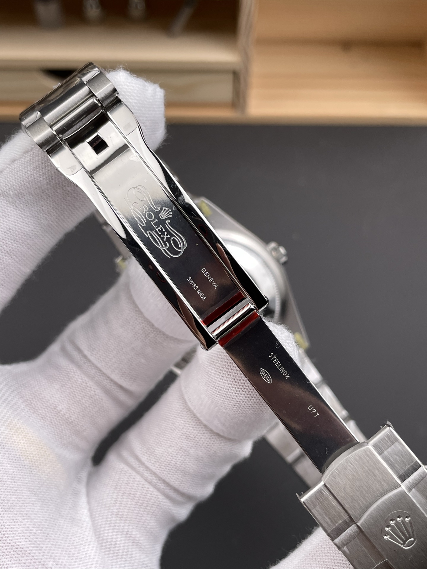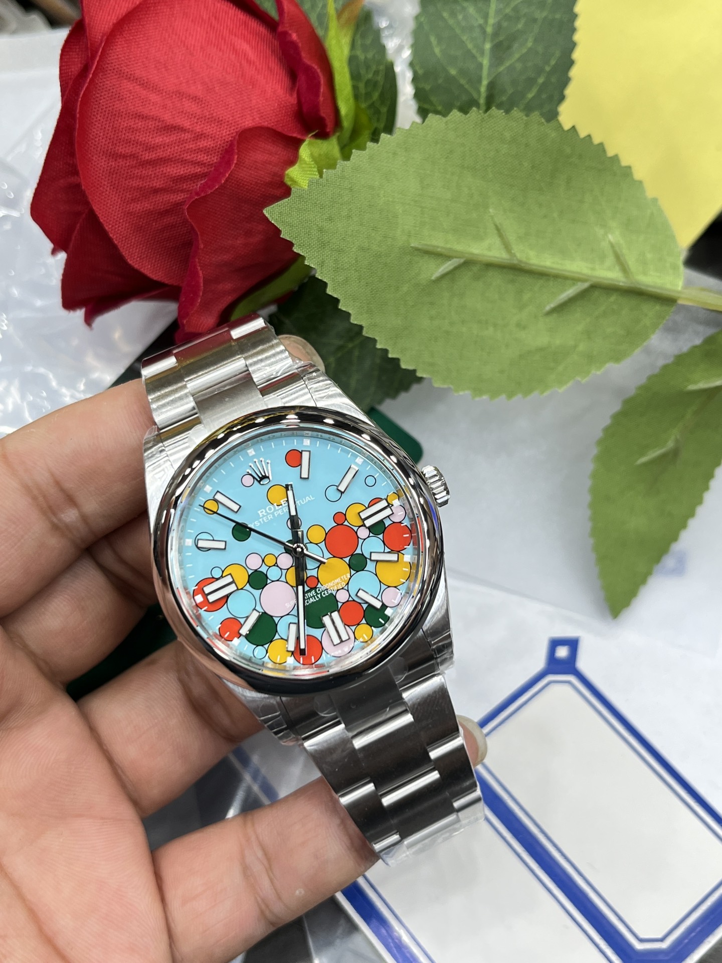 完璧な36mmのプロポーション: 36mmのケースは、オイスターパーペチュアルにとって「完璧な」サイズと広く考えられています。VSFは、洗練された流れるようなラグとスリムなケースプロファイルを完璧に複製しました。文字盤のアートワークがどれほど派手で遊び心があるかを考えると、36mmのサイズ設定は、時計が圧倒的になるのを防ぎ、どんな手首でも完全にバランスの取れた上品な状態を保ちます。