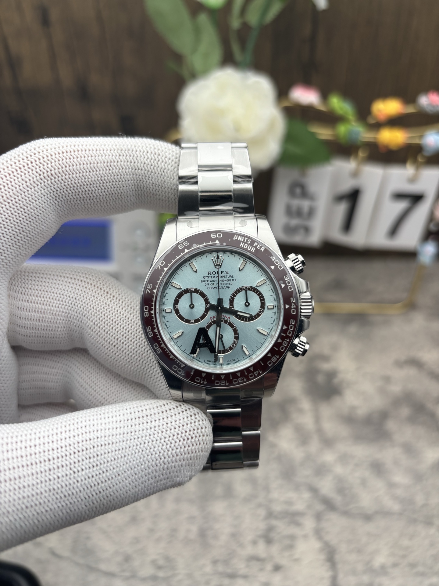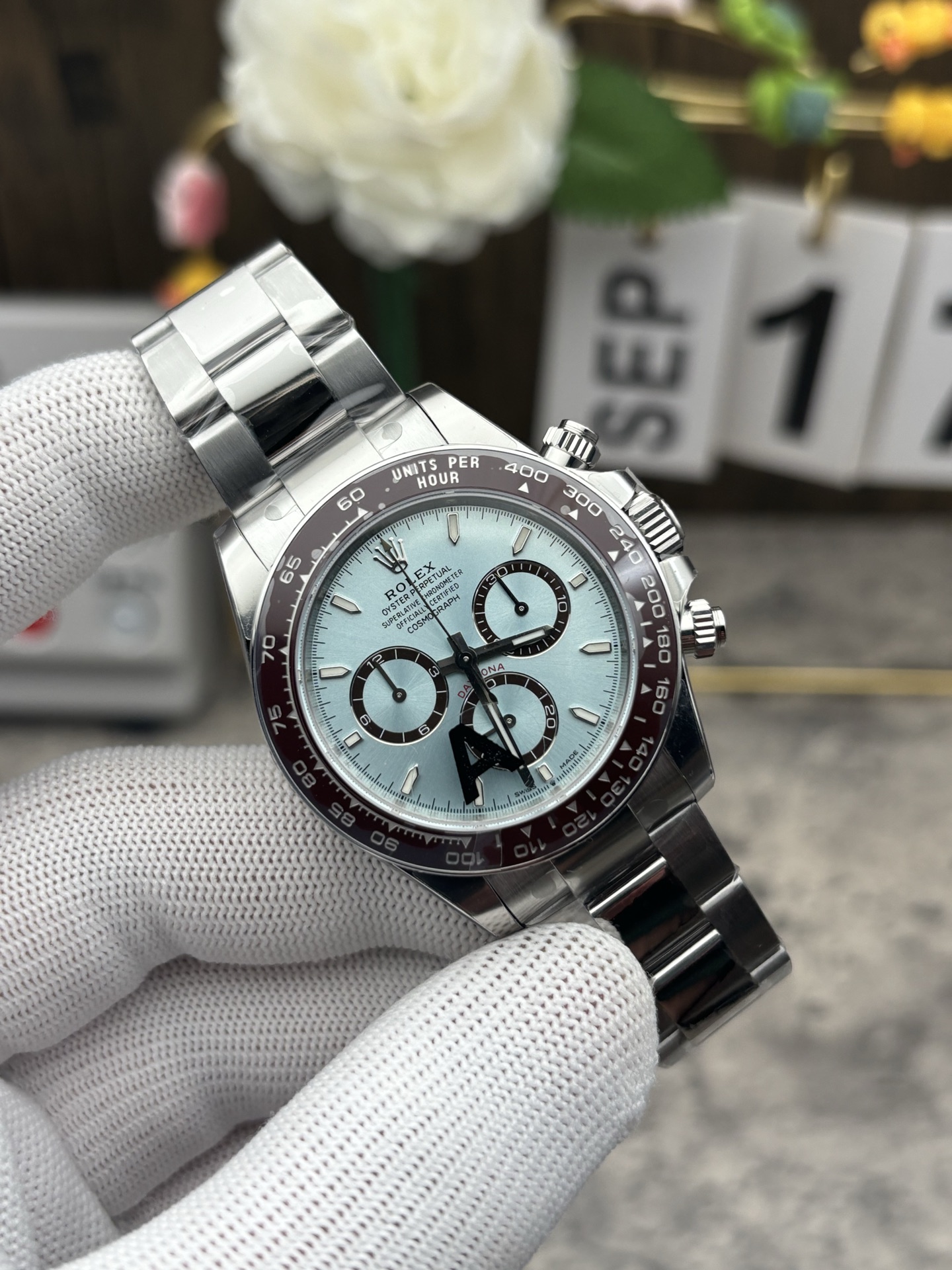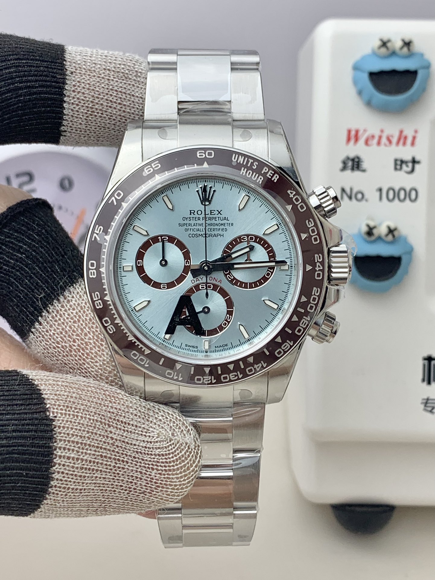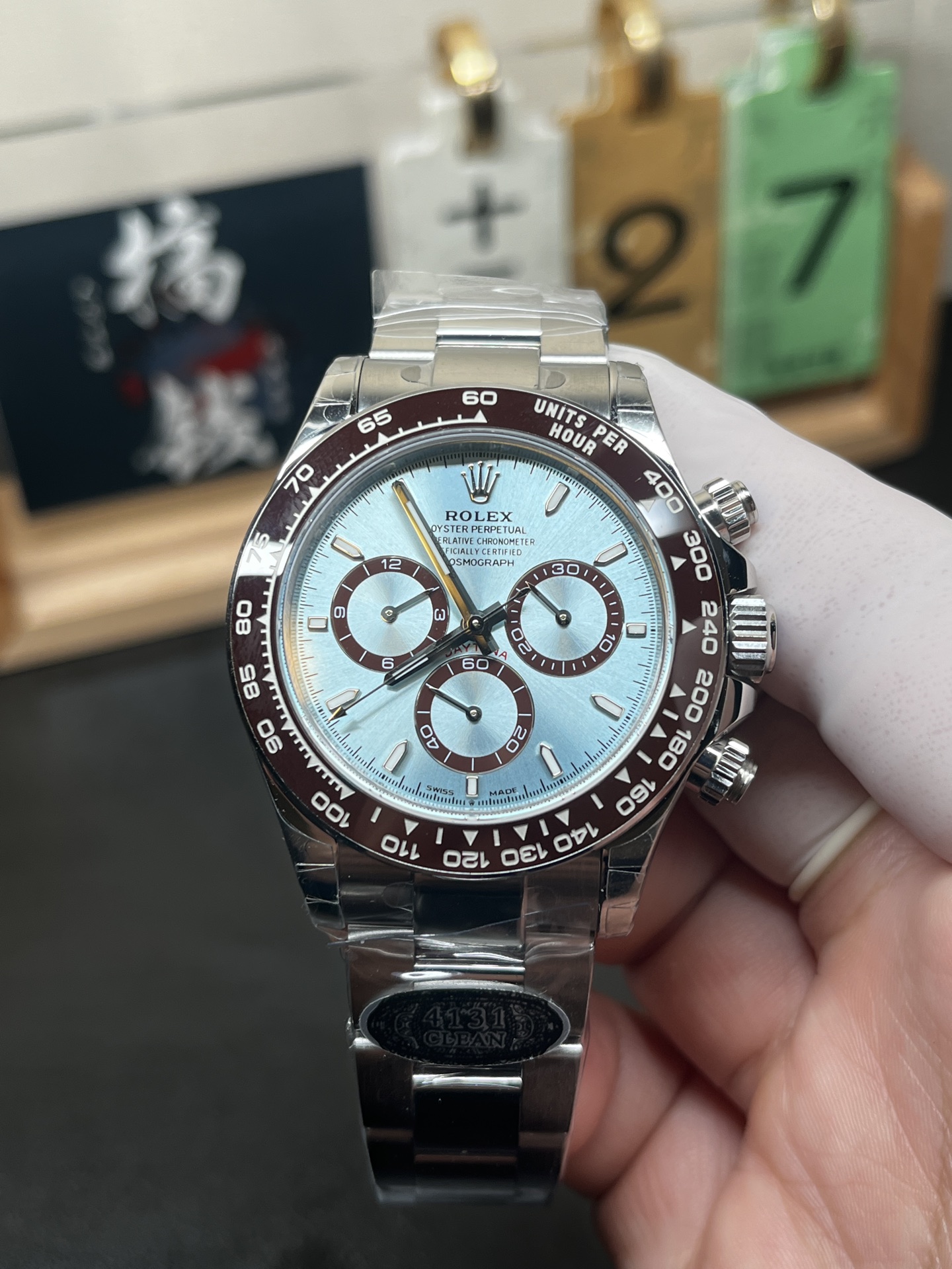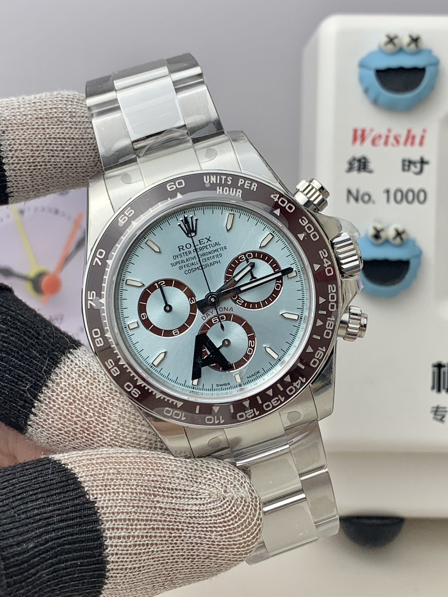 象徴的なアイスブルー文字盤: ロレックスのカタログにおいて、アイスブルーの文字盤はプラチナモデル専用です。VSファクトリーは、照明によって色がダイナミックに変化するこの魅惑的なサンバースト仕上げを見事に複製しました。これは、クロノグラフ・サブダイヤルの光沢のあるチェスナットブラウンのリングと完璧なコントラストをなしています。これらは、新しい4131世代の特徴である洗練されたわずかに狭いプロポーションを備えています。
