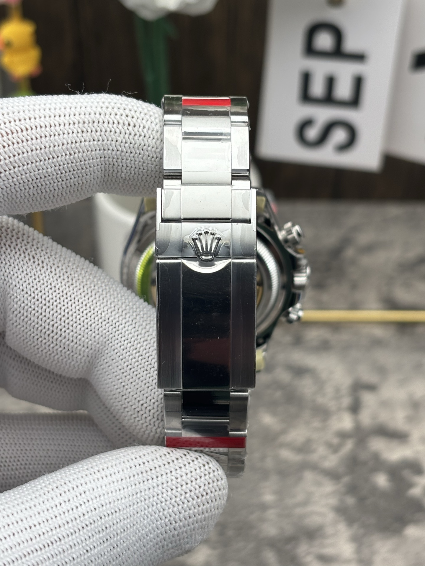新世代のアップグレード: このスーパークローンは、最新のデイトナのアップデートを忠実に再現しています。非常に傷に強いチェスナットブラウンのセラクロムベゼルは、現在、美しく研磨されたメタルエッジリングによって包まれています。これにより、セラミックの端を日常の衝撃から保護し、時計にわずかに層状の、洗練された、そして堅牢なプロファイルを与えます。
