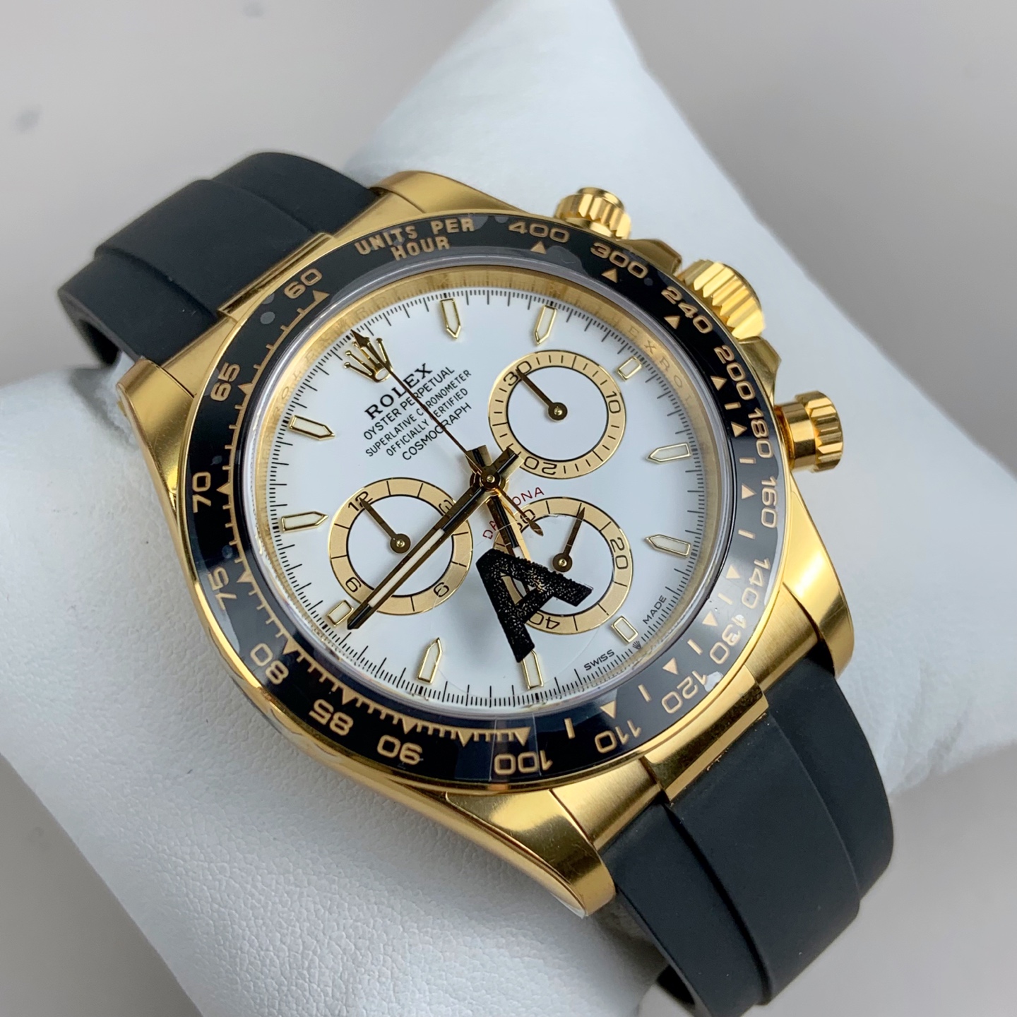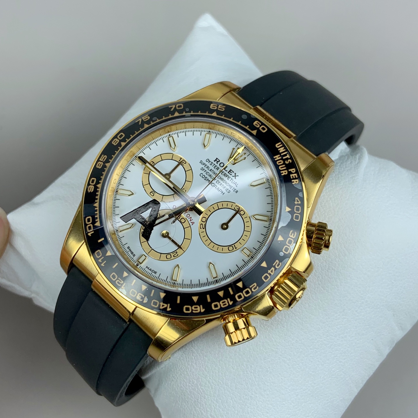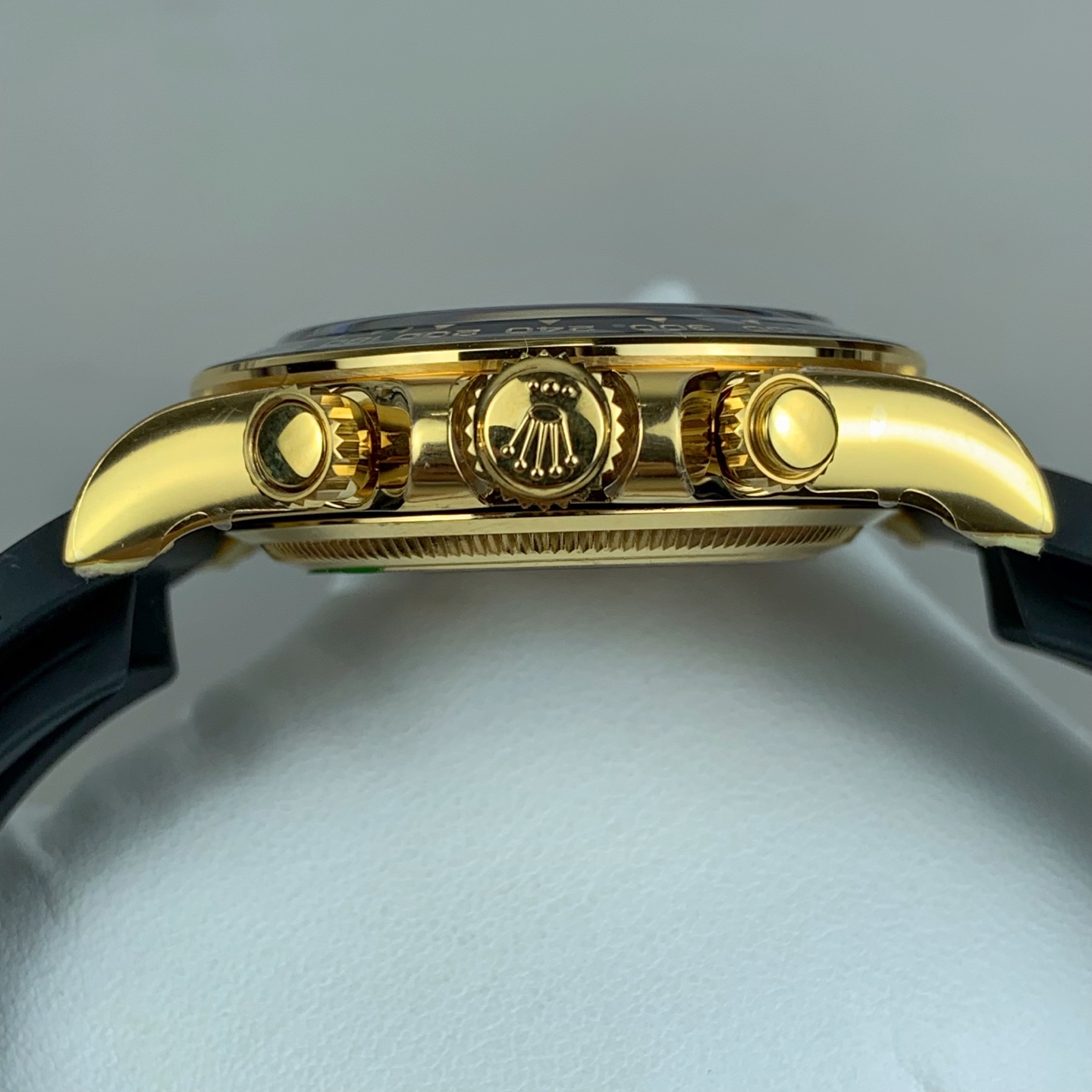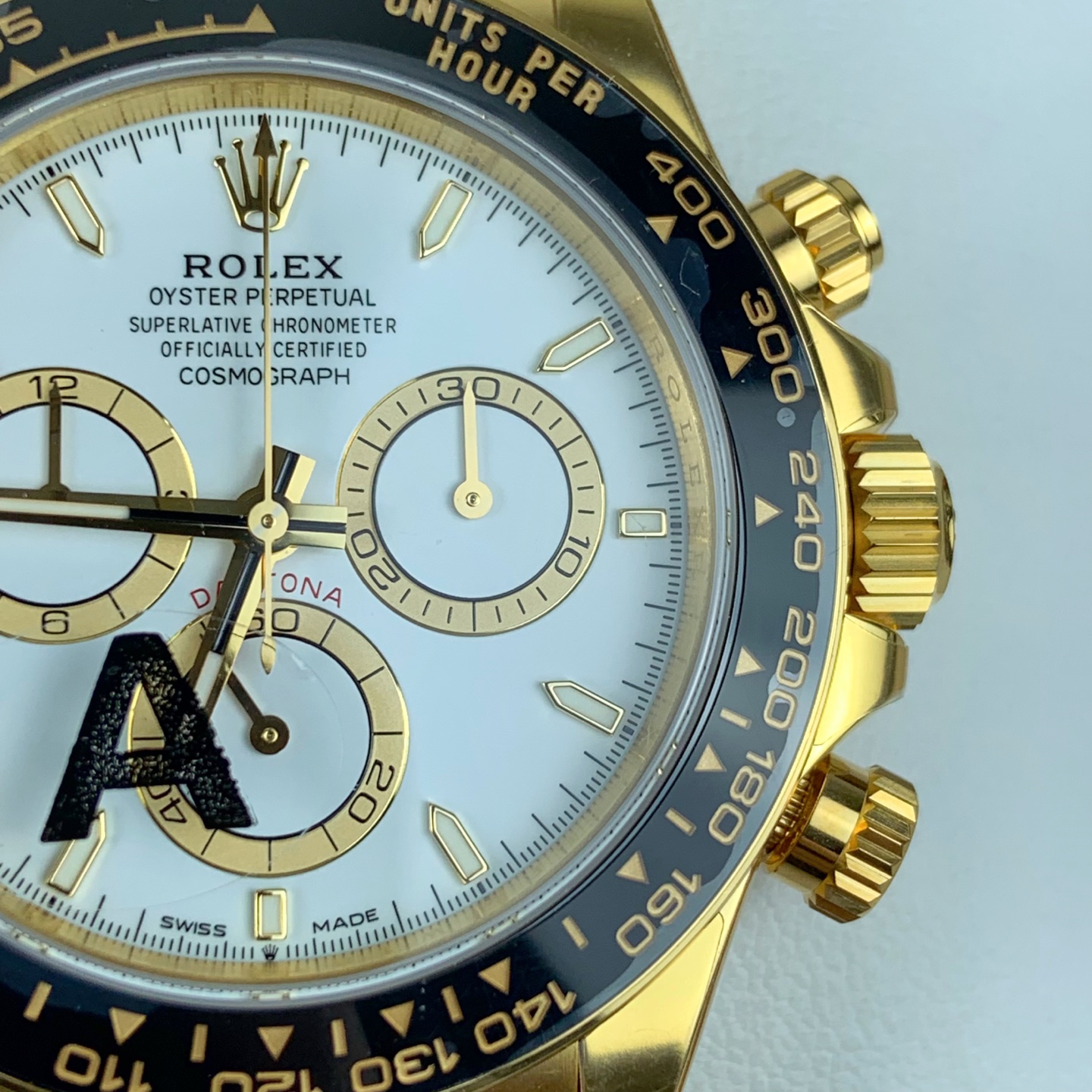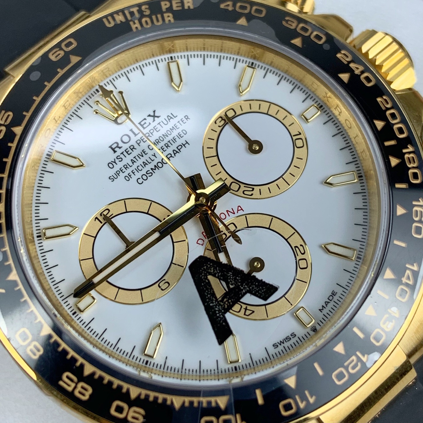 新世代のアップグレード: このスーパークローンは、最新のデイトナのケースのアップデートを忠実に再現しています。非常に傷に強いブラックのセラクロムベゼルは、美しく研磨された18Kイエローゴールドのエッジリングによって包まれています。これにより、セラミックの端を日常の衝撃から保護し、ゴールドのケースと完璧に結びつく、わずかに層状で洗練された堅牢なプロファイルを与えます。