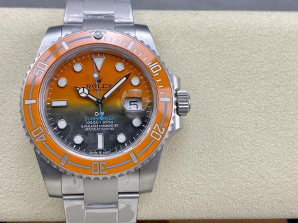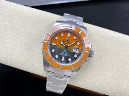 VSファクトリー製のサブマリーナーデイト「DiW オレンジ/ブルー」は、Designa Individual Watches (DiW) によってモディファイされた非常にエクスクルーシブなカスタム時計の、息を呑むような1:1スーパークローンです。この前衛的な傑作は、伝統的なサテン仕上げステンレススチールの堅牢でクラシックな重量感と、非常に鮮やかでスポーティなカラーリングを完璧に融合させています。テクスチャーのあるフォージドカーボンベースへとフェードする魅惑的なオレンジグラデーション文字盤、カスタムのオレンジベゼル、そして印象的なライトブルーのアクセントを特徴とするこの時計は、間違いなく視線を釘付けにします。VSFの伝説的なカスタムVS3135ムーブメントを搭載し、アグレッシブでモダンなレーシング美学と妥協のない機械的安定性を両立させています。