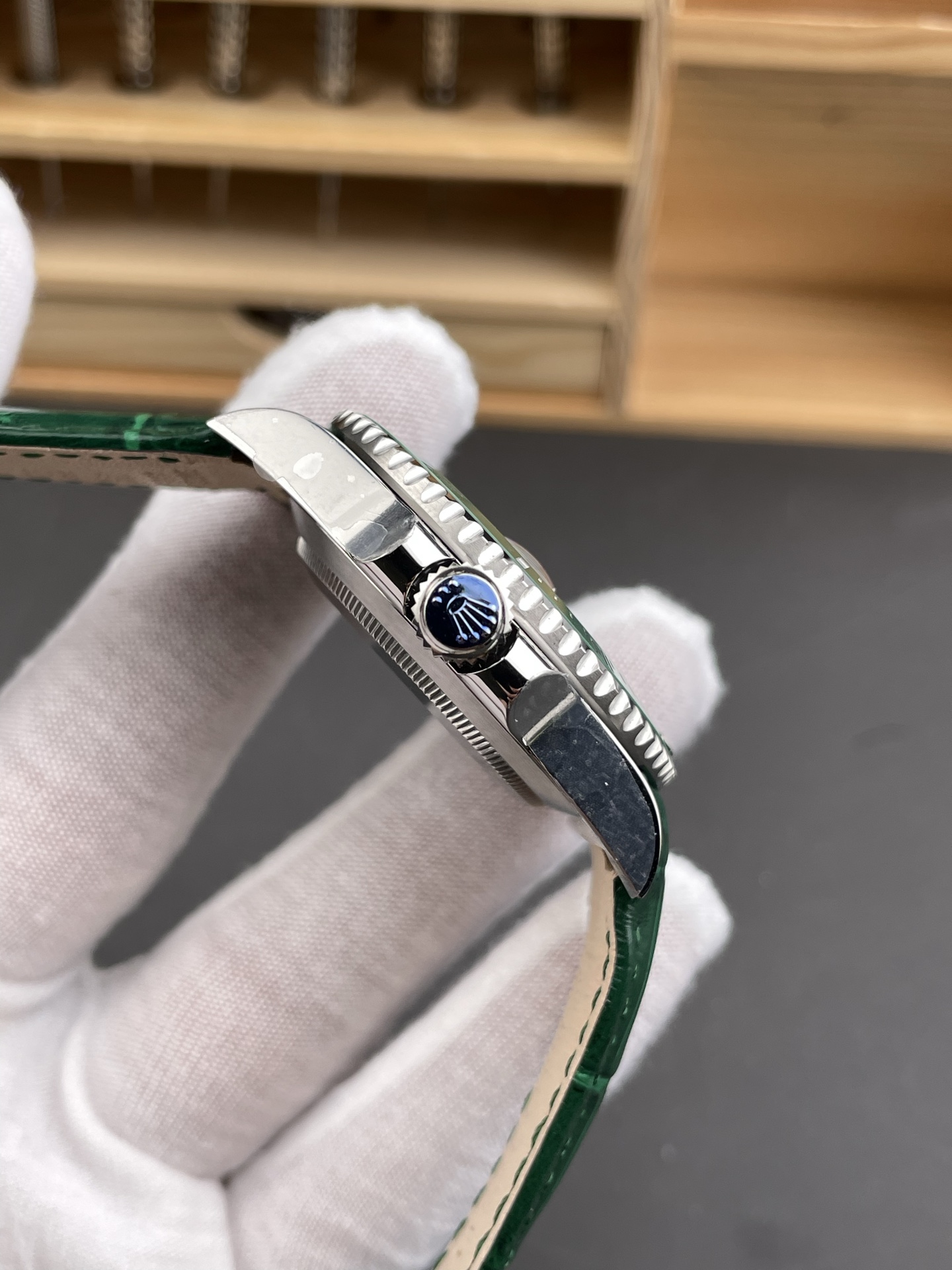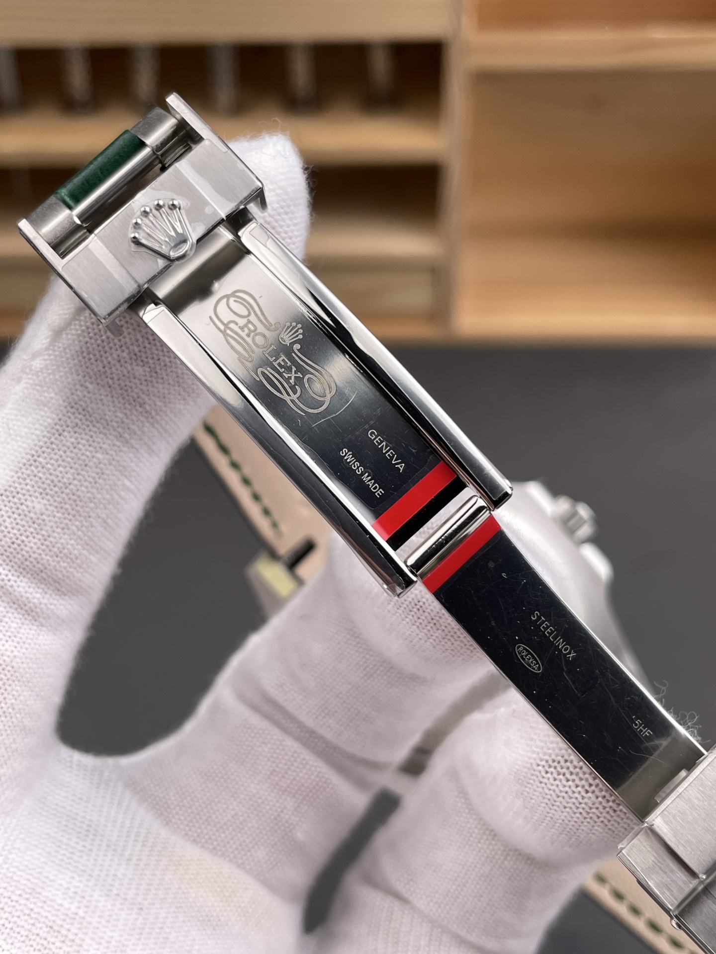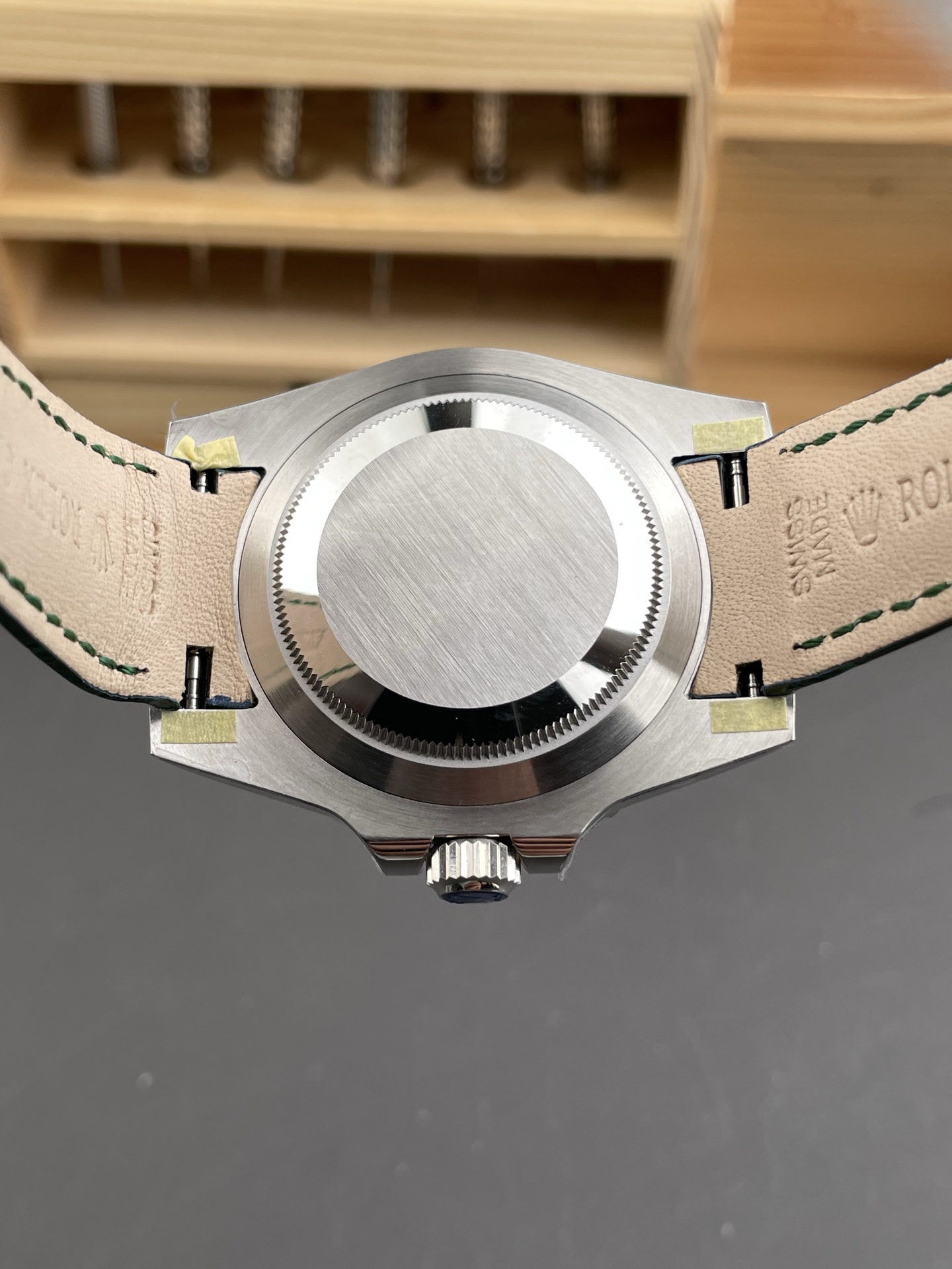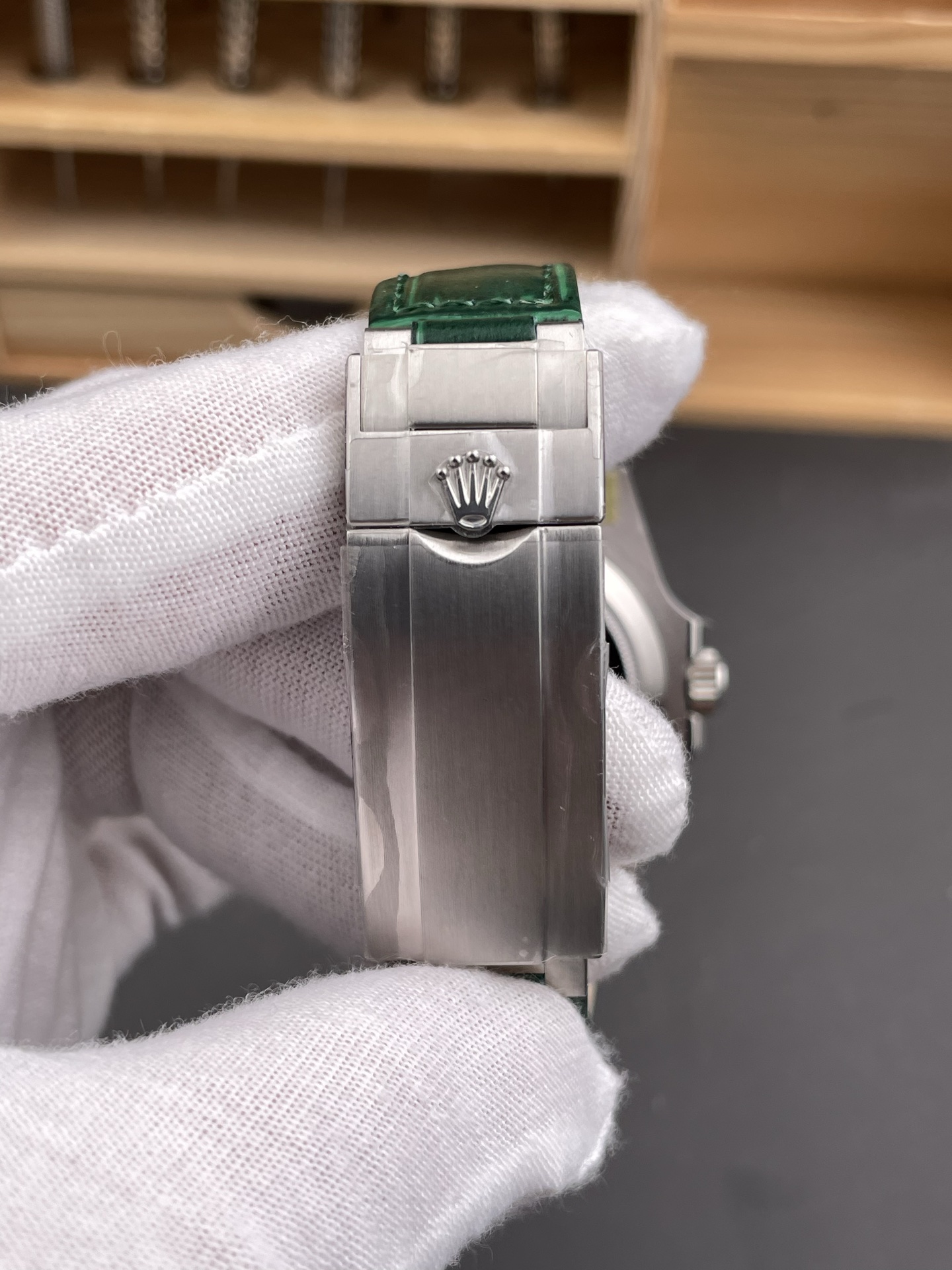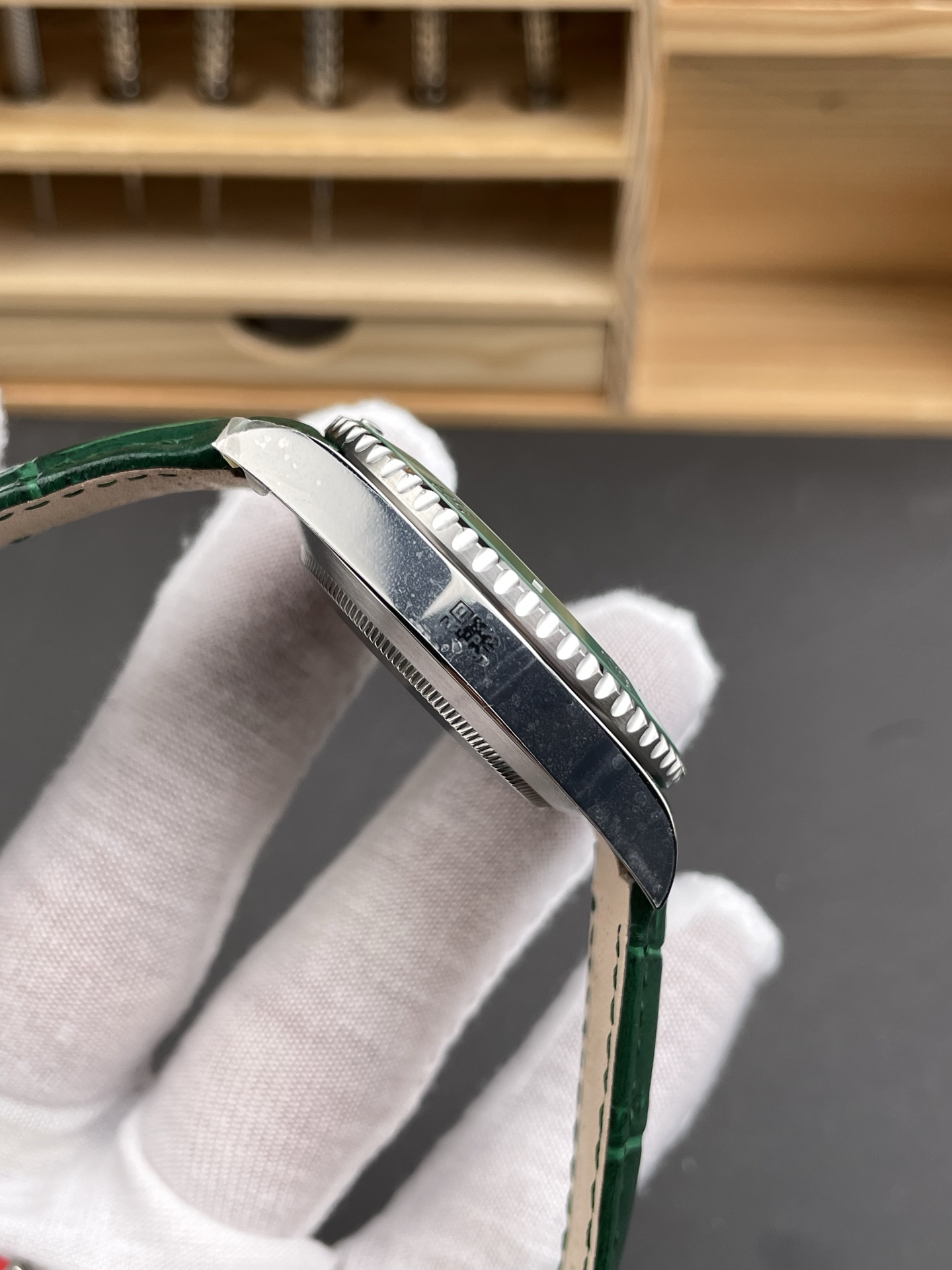 • 特別なカスタムストラップの統合: これは、40mmのケースに完全に密着して見苦しい隙間を残さず、標準のオイスターブレスレットに代わる印象的でラグジュアリーな選択肢を提供するプレミアムなグリーンレザーストラップを備えた、市場で唯一のバージョンです。
