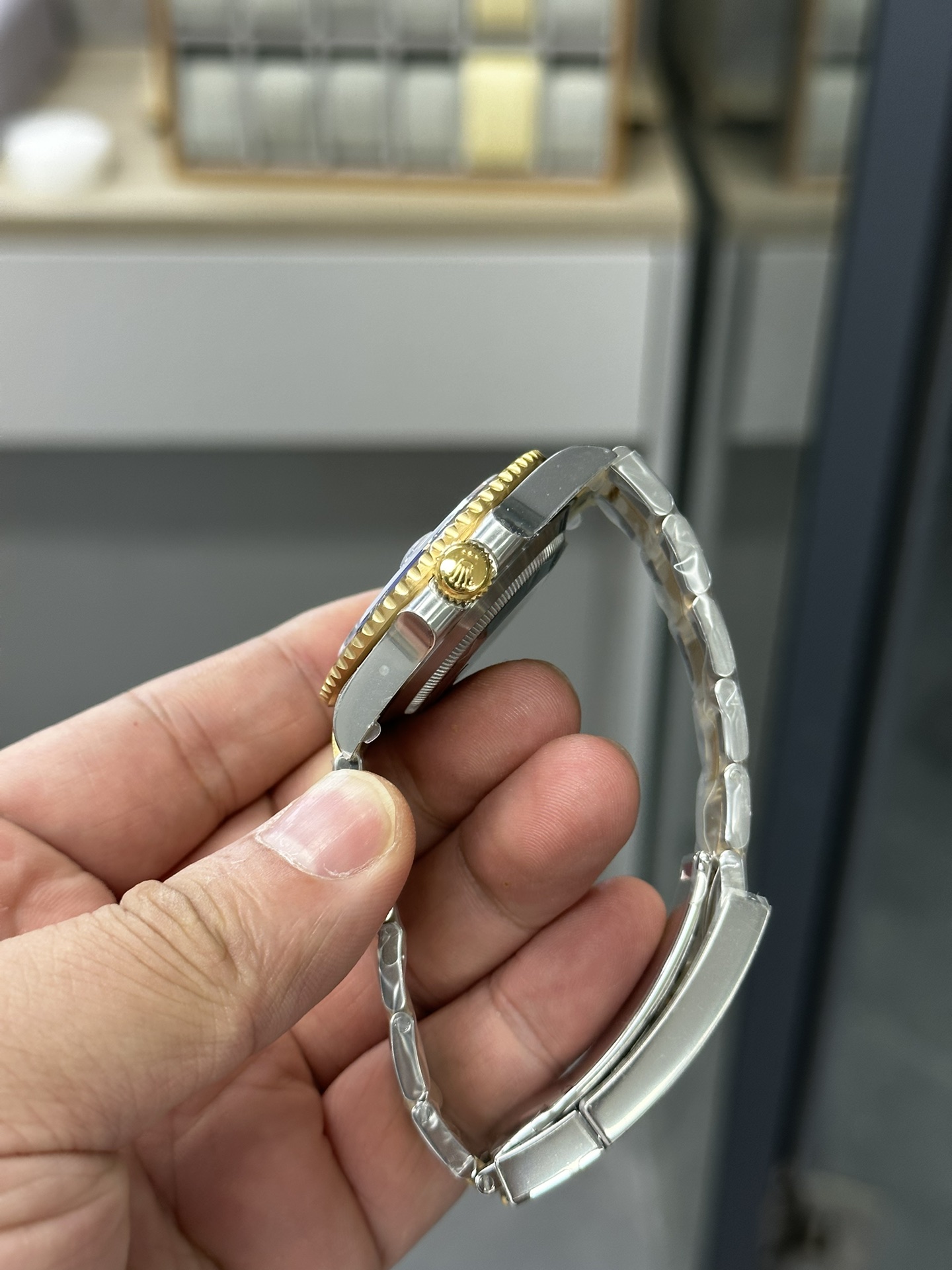 ツートン 904L オイスタースチール&ゴールド: 標準的なレプリカとは異なり、VSFはケースとブレスレットに本物の904Lオイスタースチール(卓越した光沢と耐食性で知られる、本物のブランドで使用されているのと同じ航空宇宙グレードの合金)を使用しています。VSFは、豊かで鮮やかな18Kイエローゴールドのトーンを、ベゼルリング、トリプロック(Triplock)巻き上げリューズ、およびオイスターブレスレットの研磨されたセンターリンクに見事に電気メッキしました。