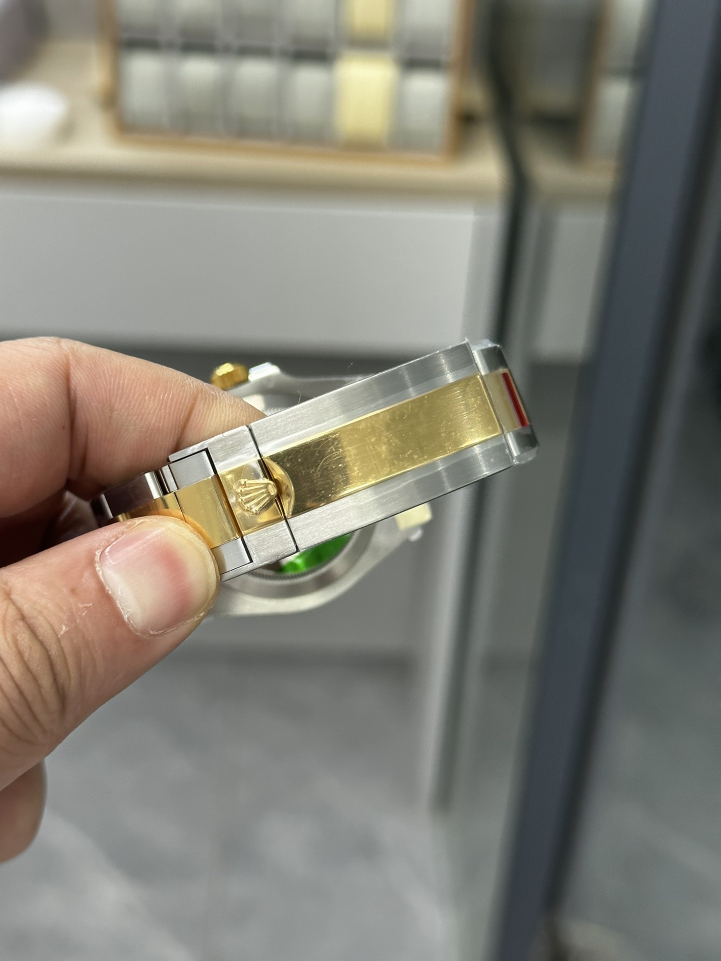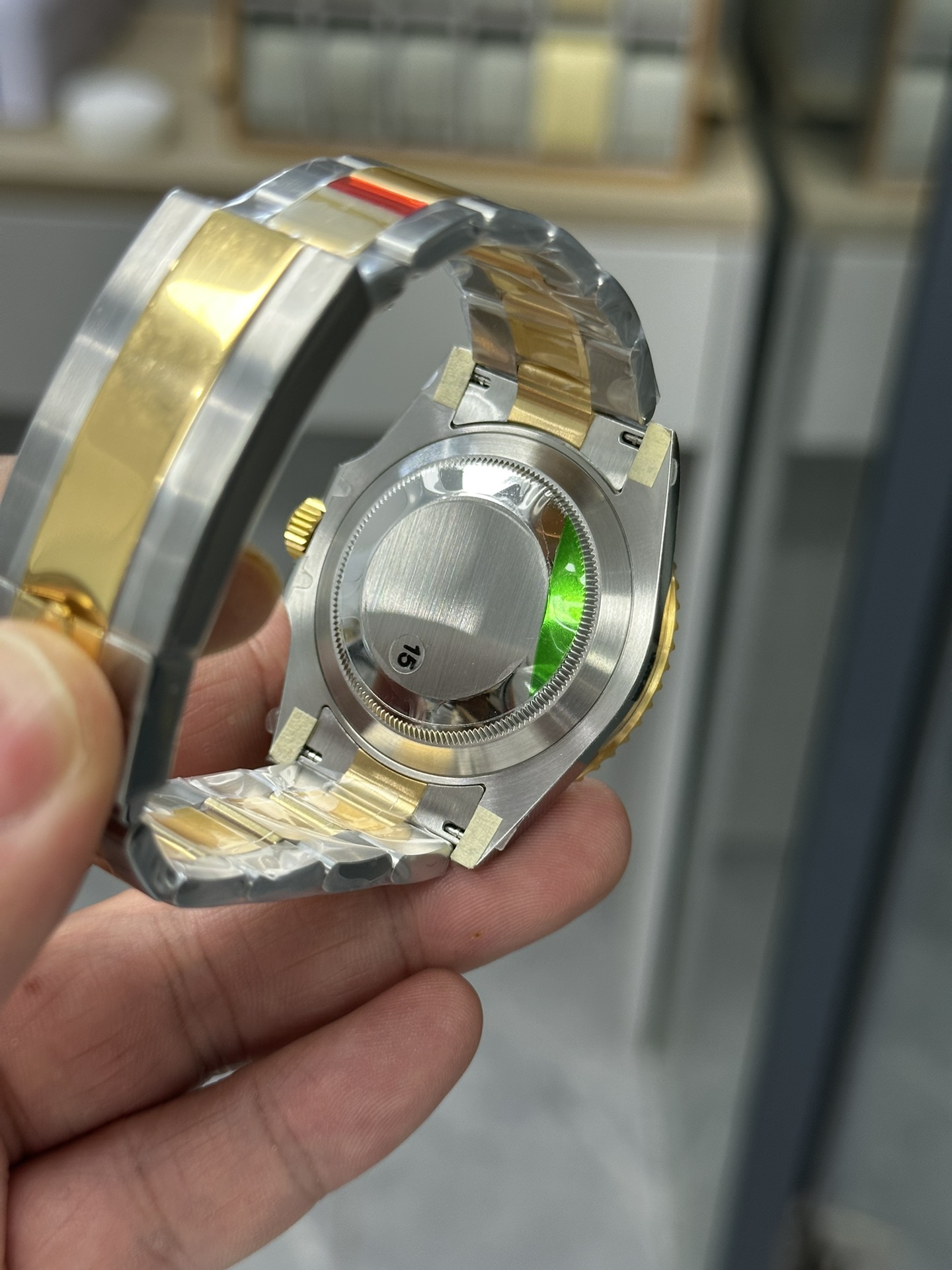 素材: プレミアム 904L オイスタースチール ベース(ベゼルリング、リューズ、センターリンクに厚塗り18Kイエローゴールドコーティング)