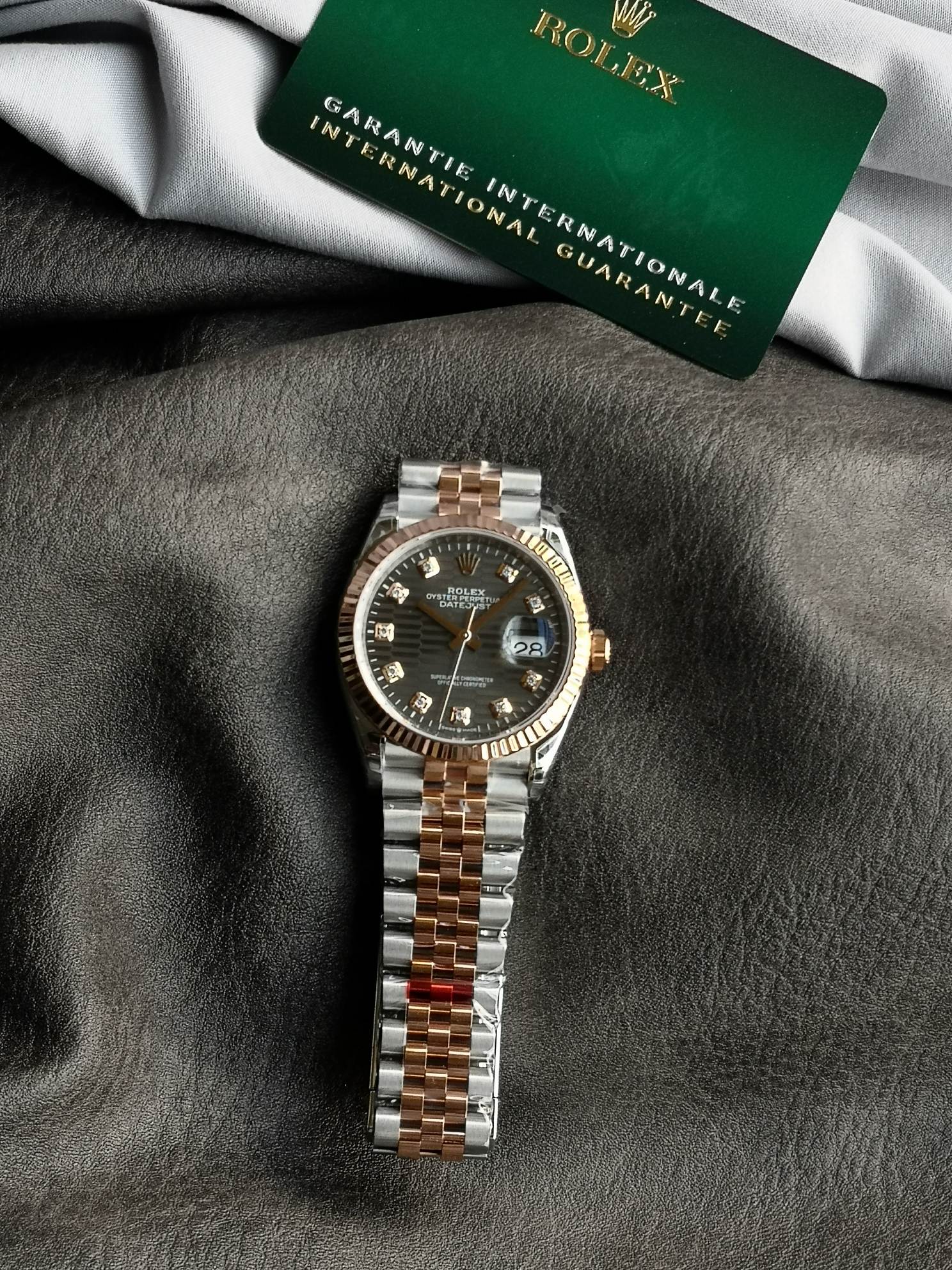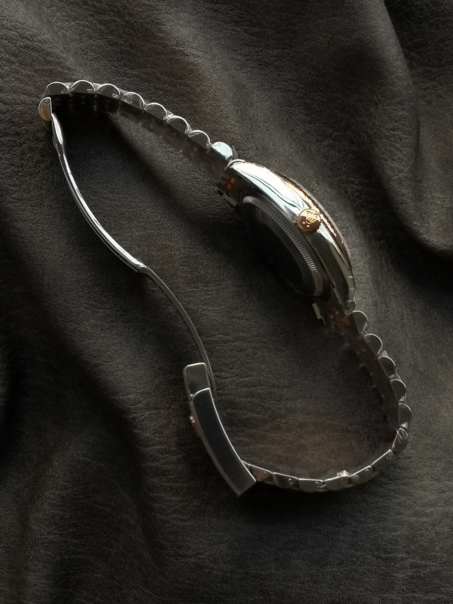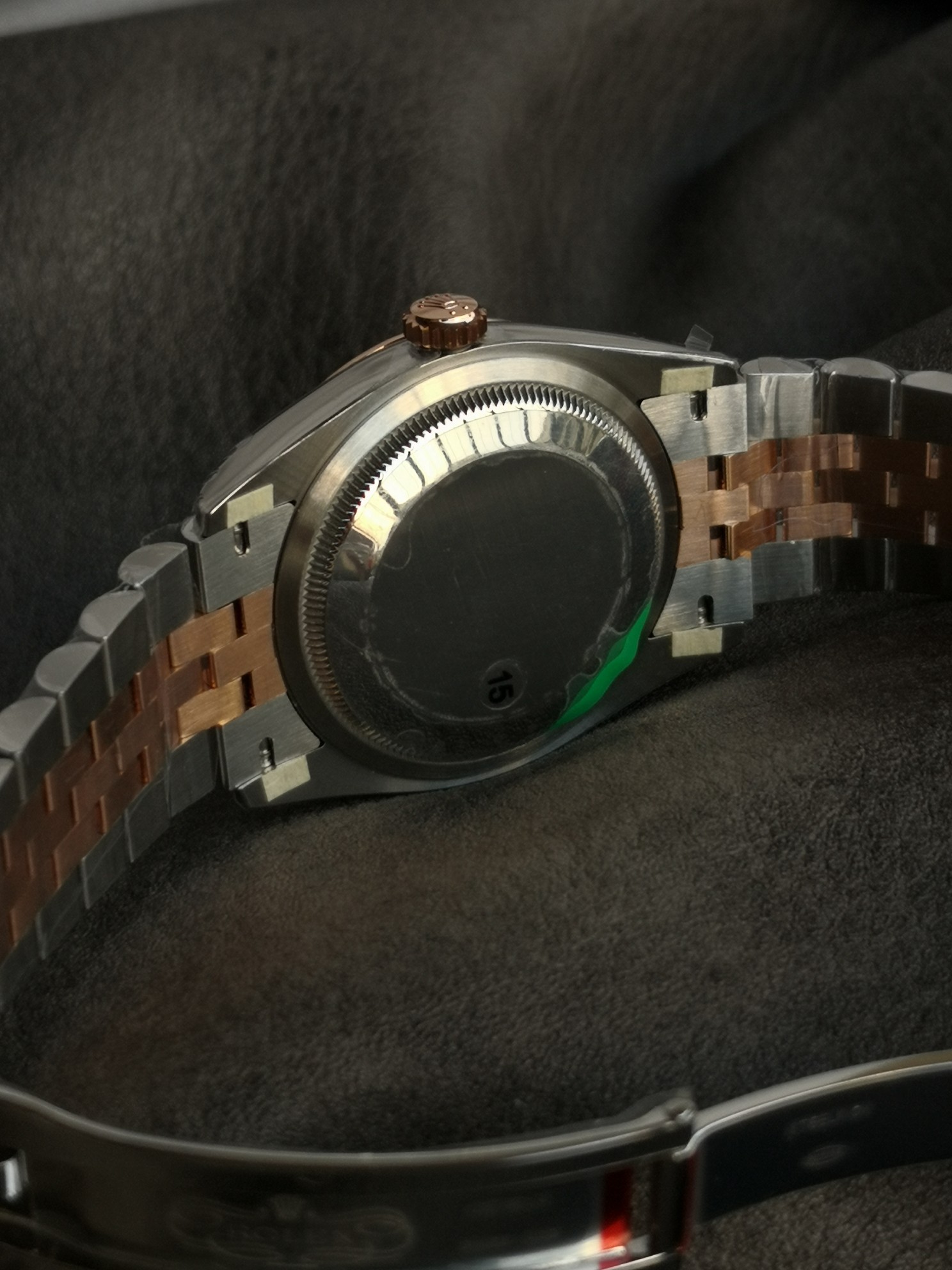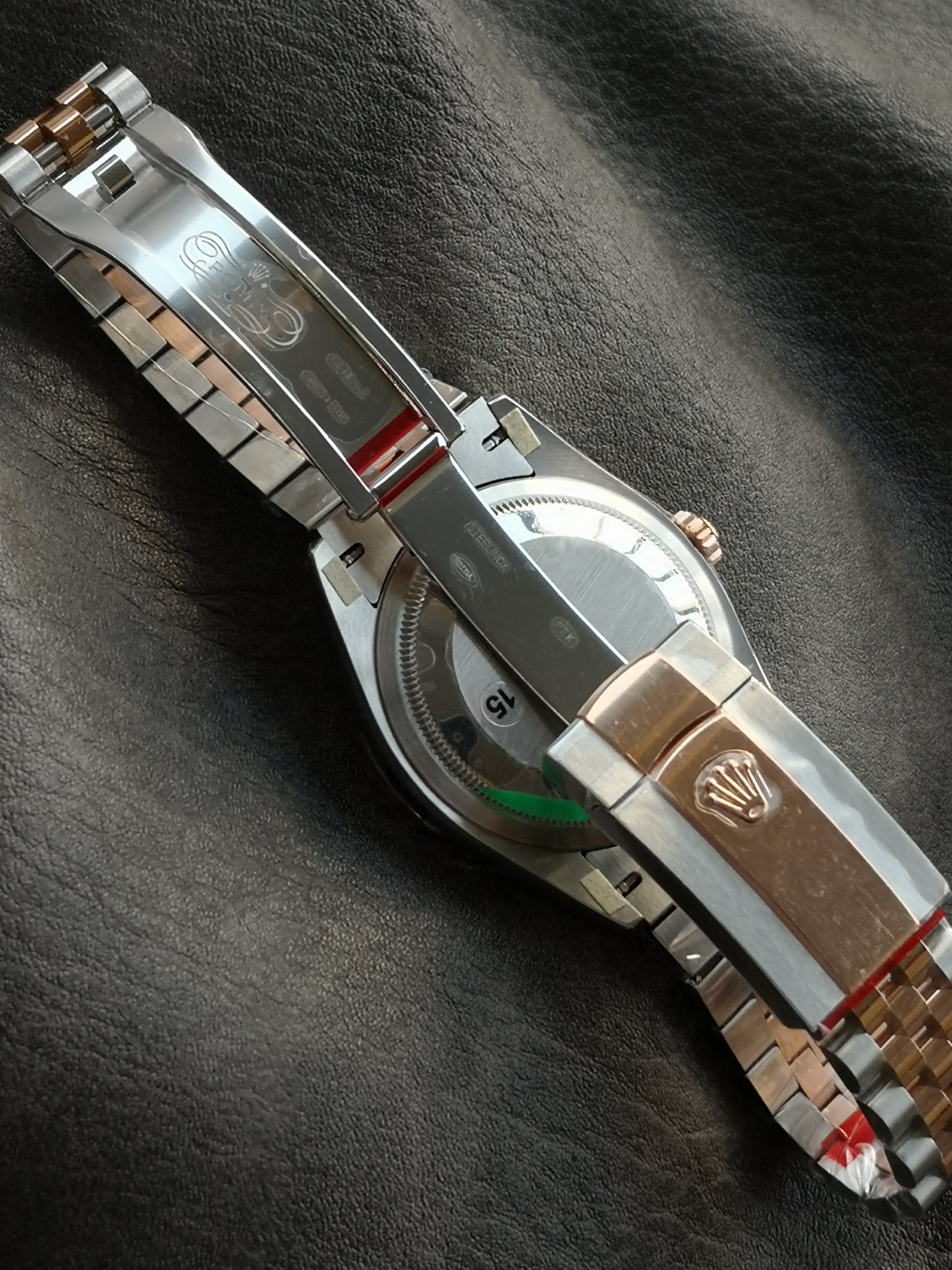 豪華なエバーローズゴールド ツートン アーキテクチャ: VSFは、フルーテッドベゼル、巻き上げリューズ、およびジュビリーブレスレットの3つの中央リンクに、豊かで温かみのある18Kエバーローズゴールドトーンを見事に電気メッキしました。これはロレックス独自のローズゴールド合金を完全に模倣しており、ブラシ仕上げおよびポリッシュ仕上げされた904Lスチールの明るく白い仕上げに対して、シームレスで裕福なコントラストを作り出しています。