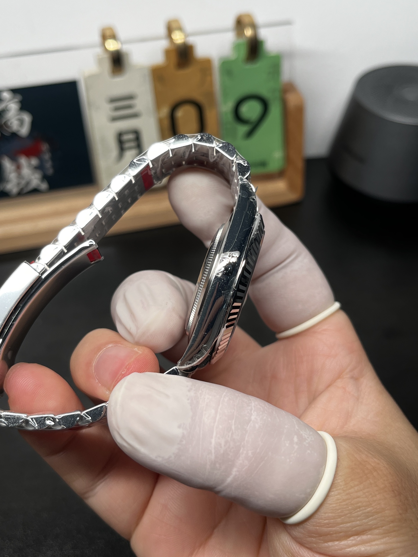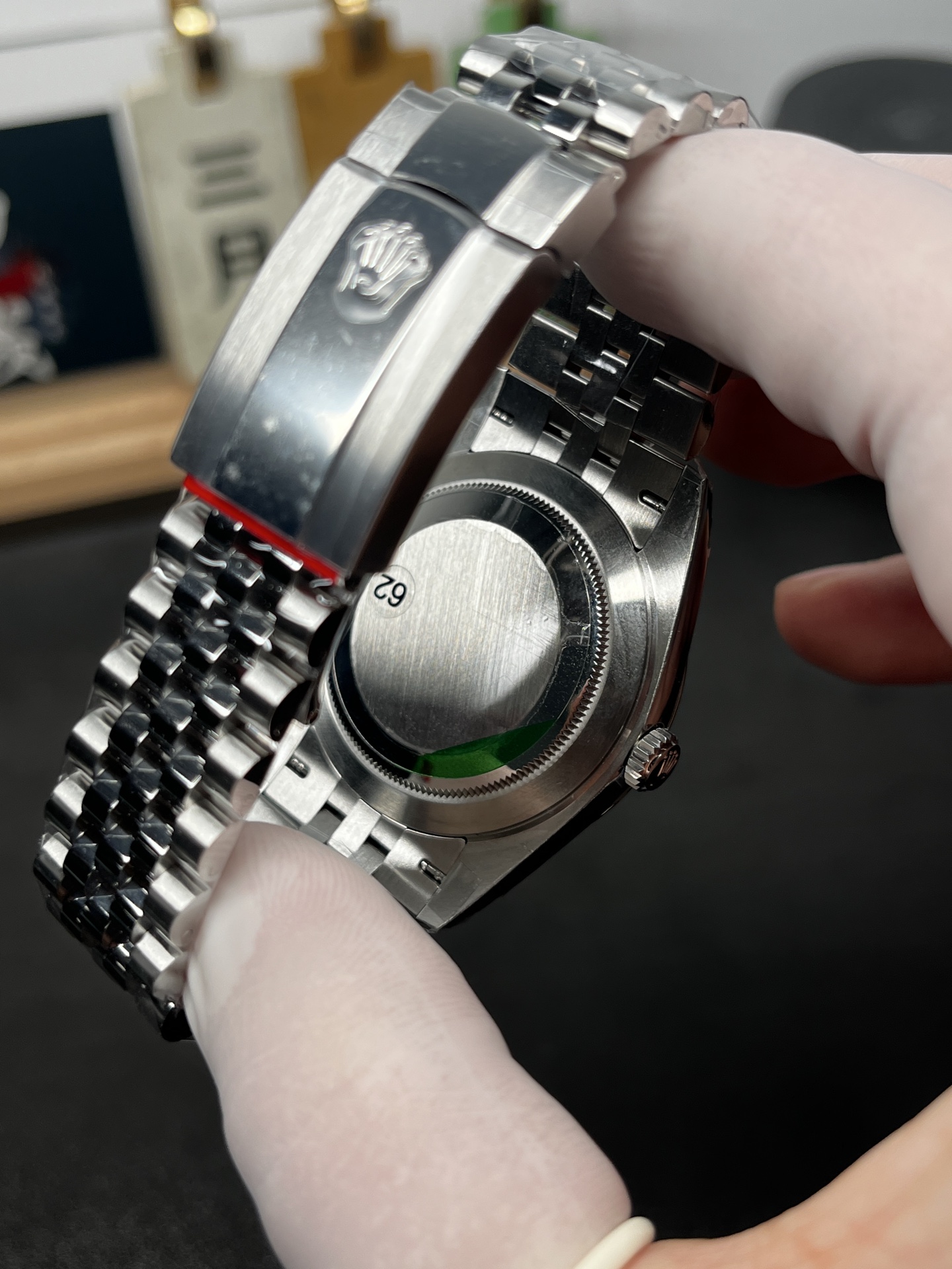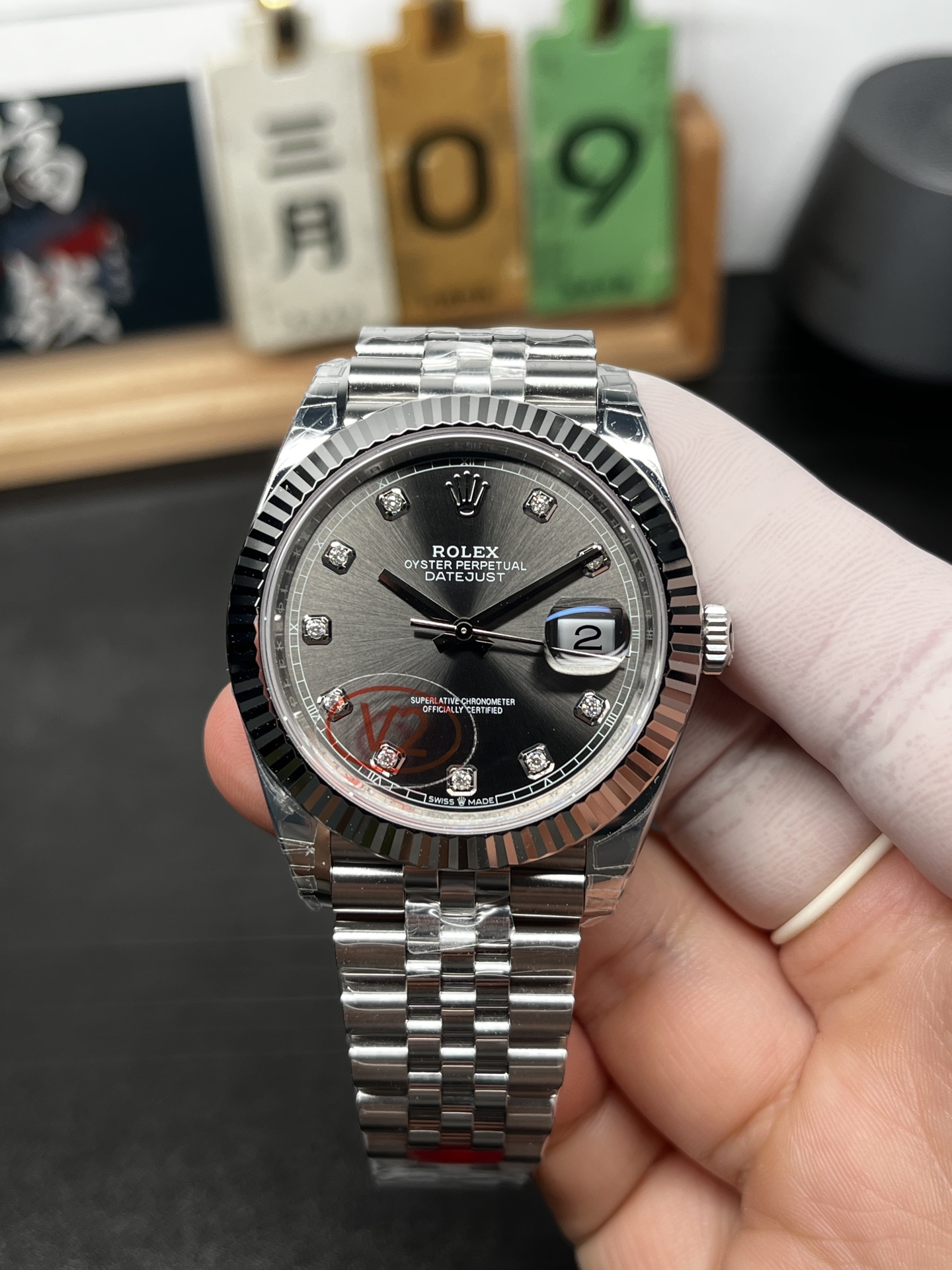 V2 風防とベゼルのアップグレード: V2バッチインジケーターで示されているように、このモデルは、ベゼルと完全に面一になるアップグレードされた超クリアで傷に強いサファイアクリスタルを特徴としています。フルーテッドベゼル自体も、本物のホワイトゴールドと全く同じように光を捉えて反射するように、更新された研磨技術を受けています。3時位置の日付窓の上には、有名な「ブラックホール」効果をもたらすプレミアムな無反射コーティングが施された象徴的なサイクロップレンズがあります。