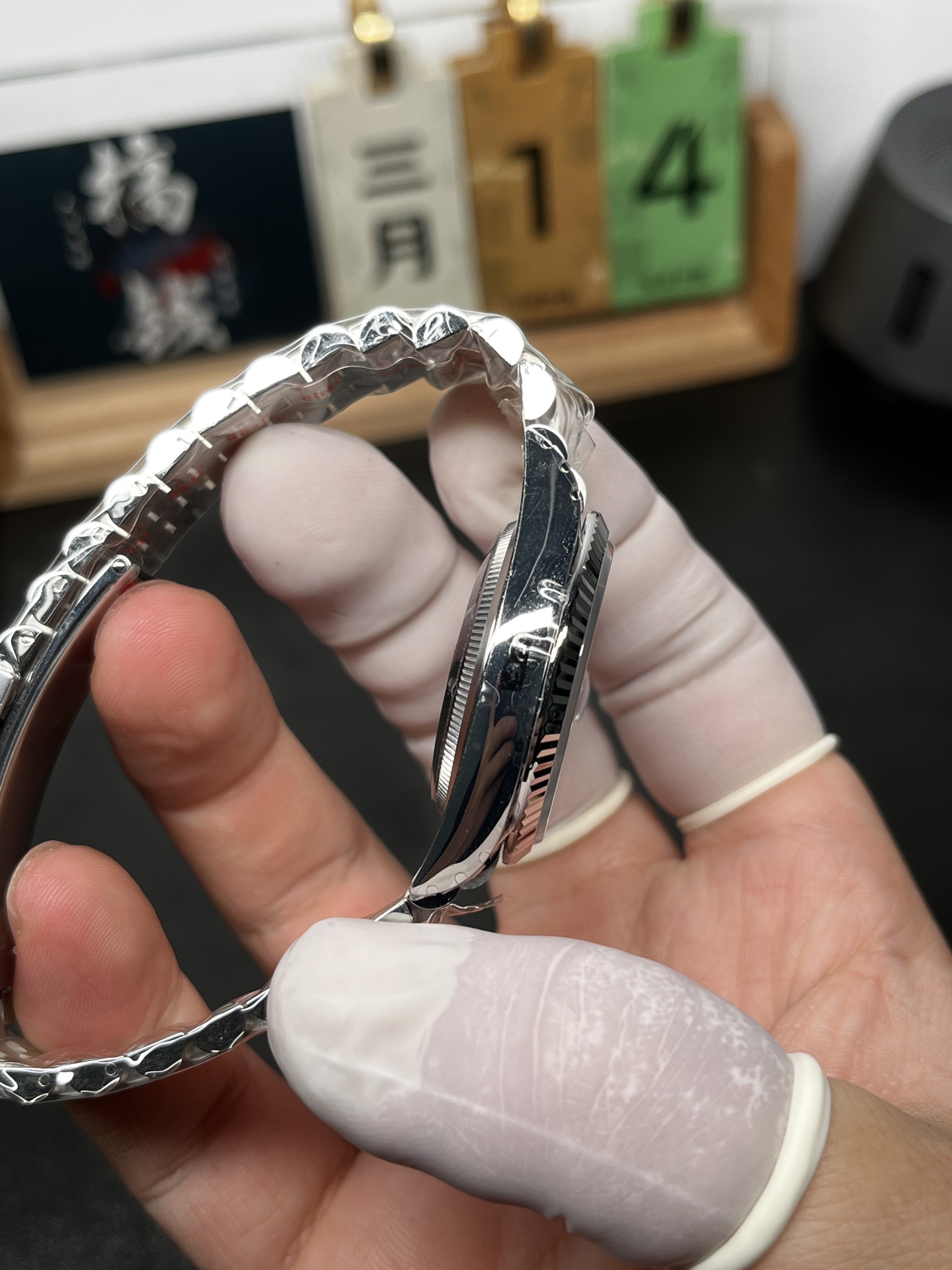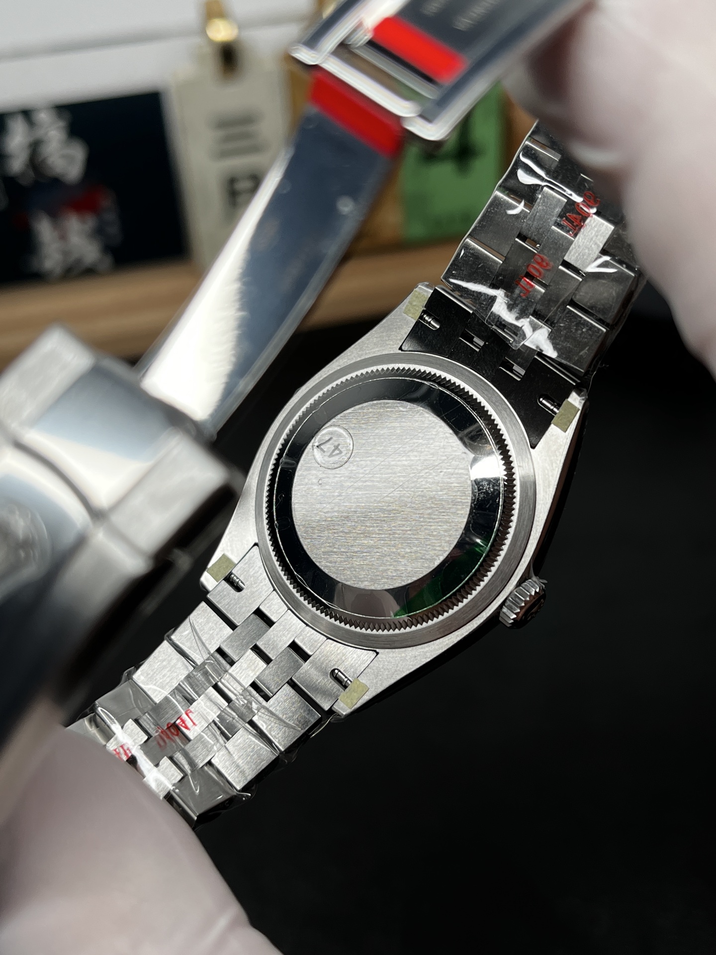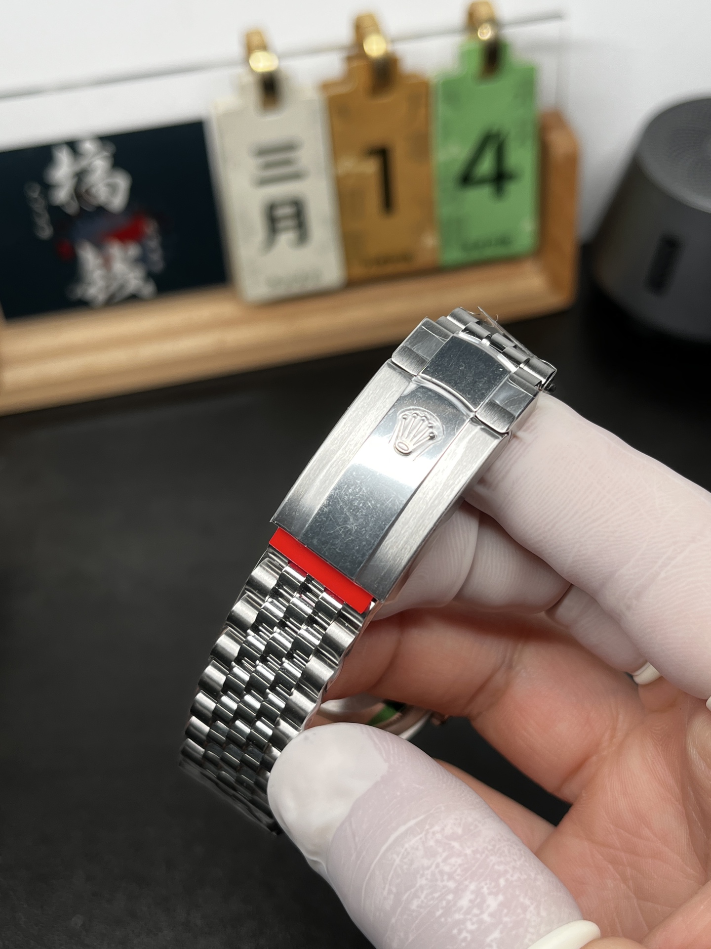 プレミアムな904Lスチール構造: ケース全体とジュビリーブレスレットはハイグレードな904Lステンレススチールから鍛造されており、オリジナルと全く同じ重量、重厚感、および耐腐食性を提供します。サテン仕上げのスチール外側リンクはポリッシュ仕上げの中央リンクとシームレスに統合されており、5mmのイージーリンク快適拡張システムを備えた非常に安全なフォールディング オイスタークラスプで固定されています。