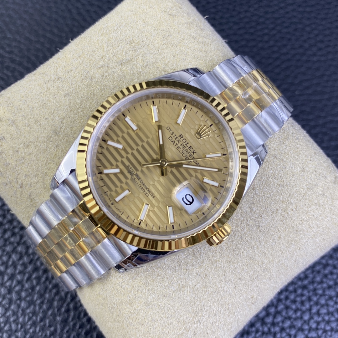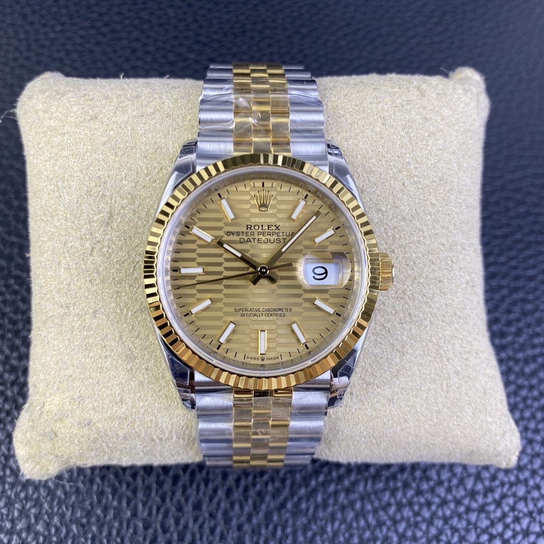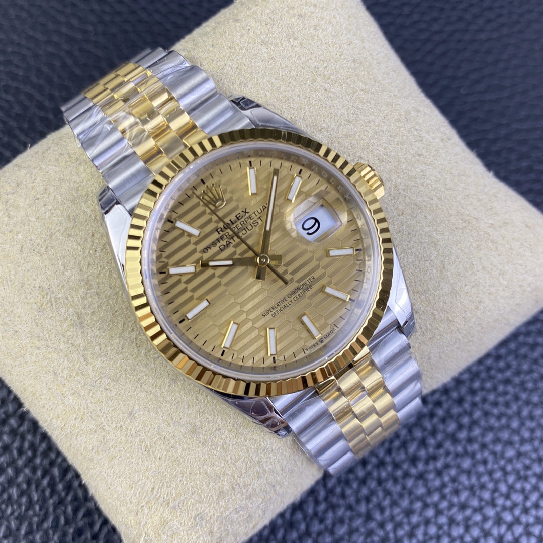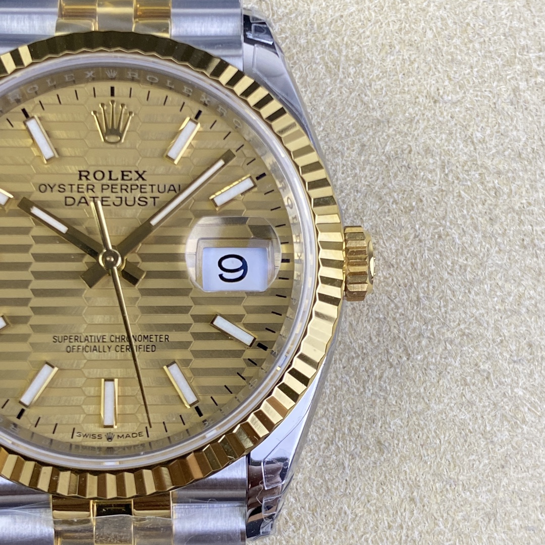 VSファクトリー製のロレックス デイトジャスト 36 (リファレンス 126233) は、テクスチャー、光の遊び、そして永遠の威信の傑作です。ロレックスのカタログで「イエローロレゾール」として知られるこのクラシックなツートン(間金)の傑作は、904Lステンレススチールの頑丈な信頼性と、18Kイエローゴールドの豊かで重厚な存在感をシームレスにブレンドしています。この特定の1:1スーパークローンは、ロレックスがこれまでに製造した中で最も複雑なモダンフェイスの1つ、すなわちレーザーエッチングされたゴールデン「フルーテッド モチーフ」文字盤を強調しており、視認性の高い夜光バトンインデックスを備えています。手首を包み込むような5連ジュビリーブレスレットと象徴的なフルーテッドベゼルとの組み合わせにより、あらゆるシーンで輝かしいステートメントピースとなります。VSFの業界をリードするVS3235自動巻きムーブメントを搭載し、真の72時間パワーリザーブを誇り、実機と見分けがつかない妥協のないラグジュアリーを提供します。