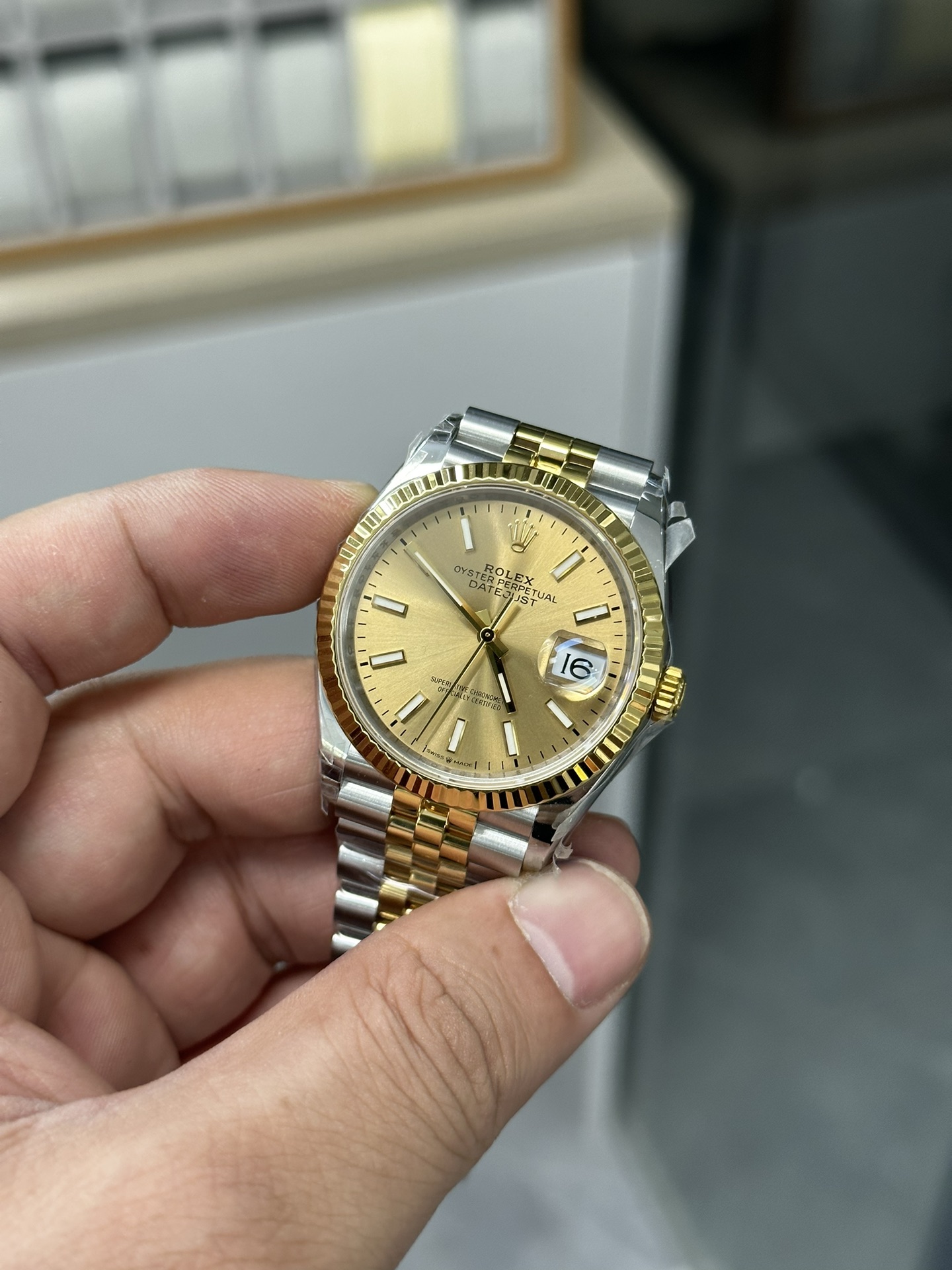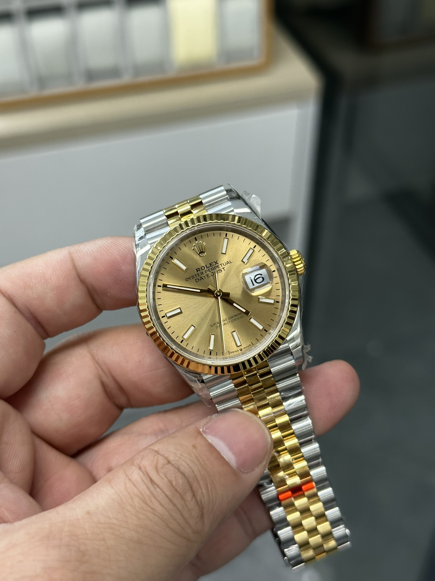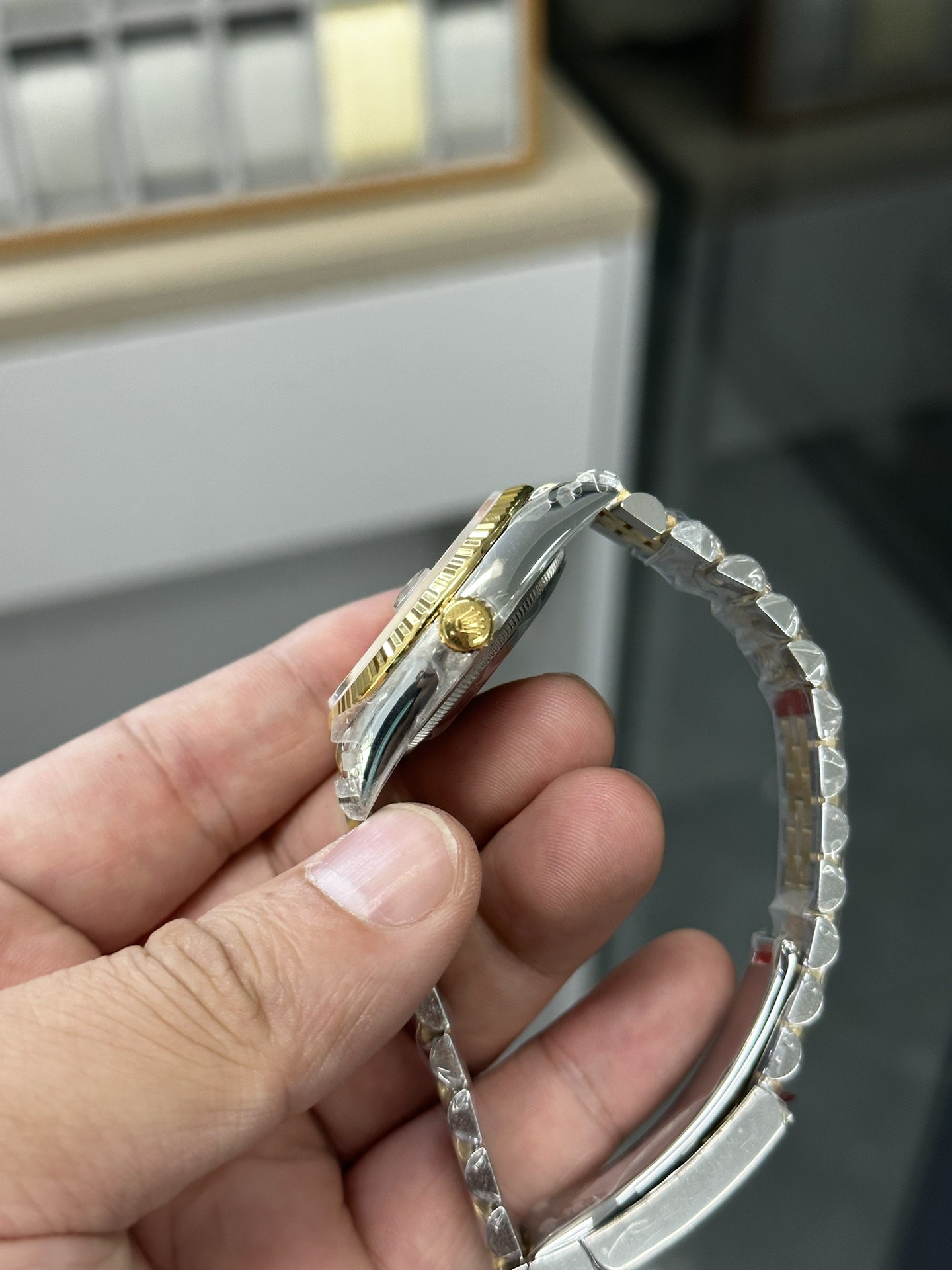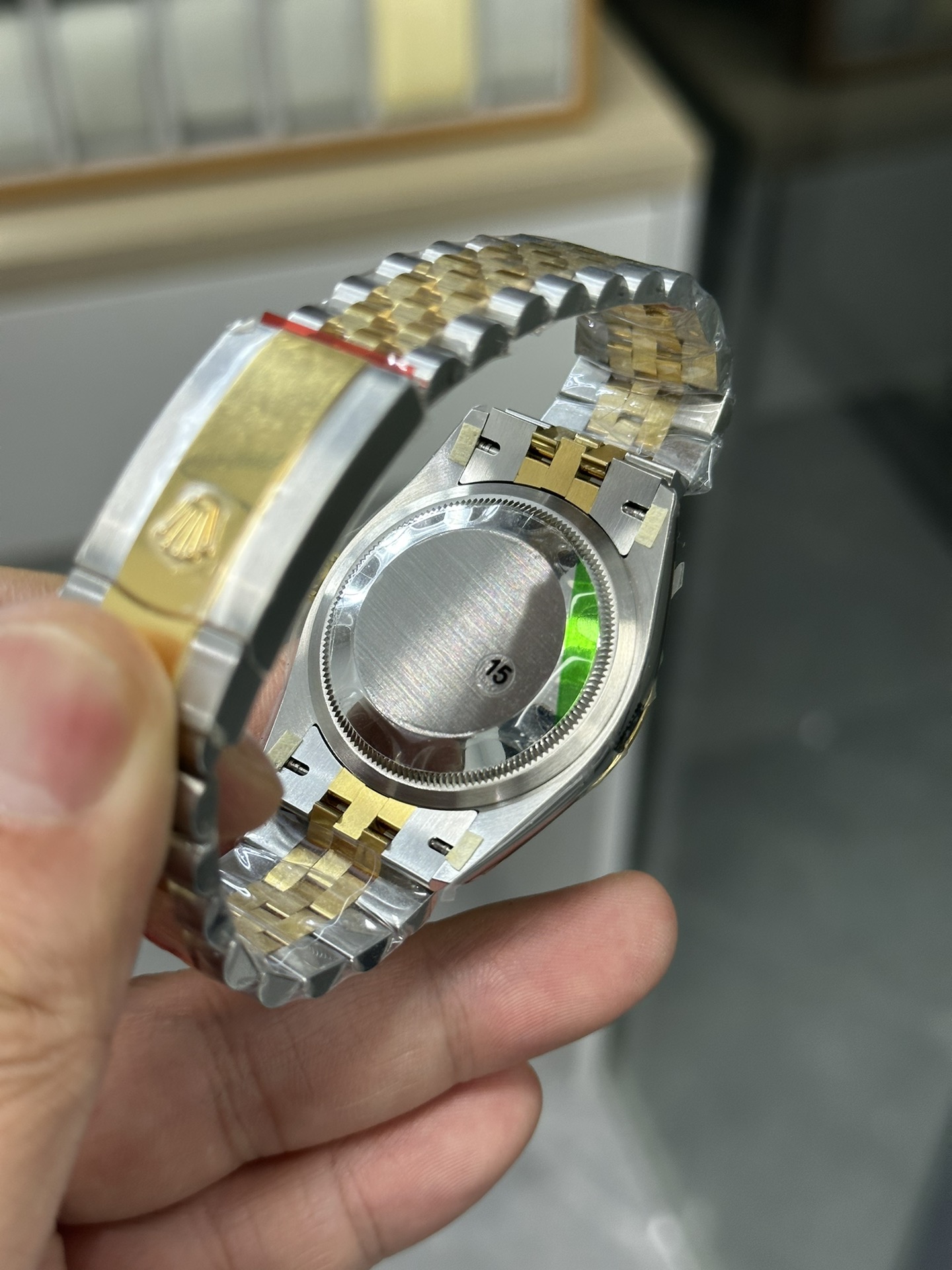典型的な「イエローロレゾール」: この構成はロレックスのラグジュアリーの礎です。ジュビリーブレスレットの外側リンクとメインケースは耐久性に優れた高光沢の904Lオイスタースチールから鍛造されており、ベゼル、リューズ、および中央リンクには豊かな18Kイエローゴールドが厚くコーティングされています。VSFは、粗悪なレプリカに見られるような過度に真鍮のような、または偽物に見える色合いを避け、ロレックス純正のゴールドに完全に一致するように、この温かみのあるゴールドの色合いを見事に完成させました。