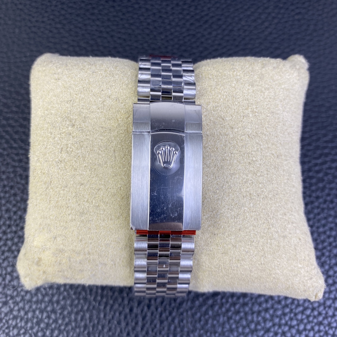 クラシックなスチールとホワイトゴールドの美学: この構成は、非常に用途の広い、モノクロームのラグジュアリールックを提供します。ケース全体とジュビリーブレスレットはハイグレードな904Lステンレススチールから鍛造されており、深くファセット(面)カットされたフルーテッドベゼルは完璧に研磨され、本物の18Kホワイトゴールドと全く同じ輝きで光を反射します。