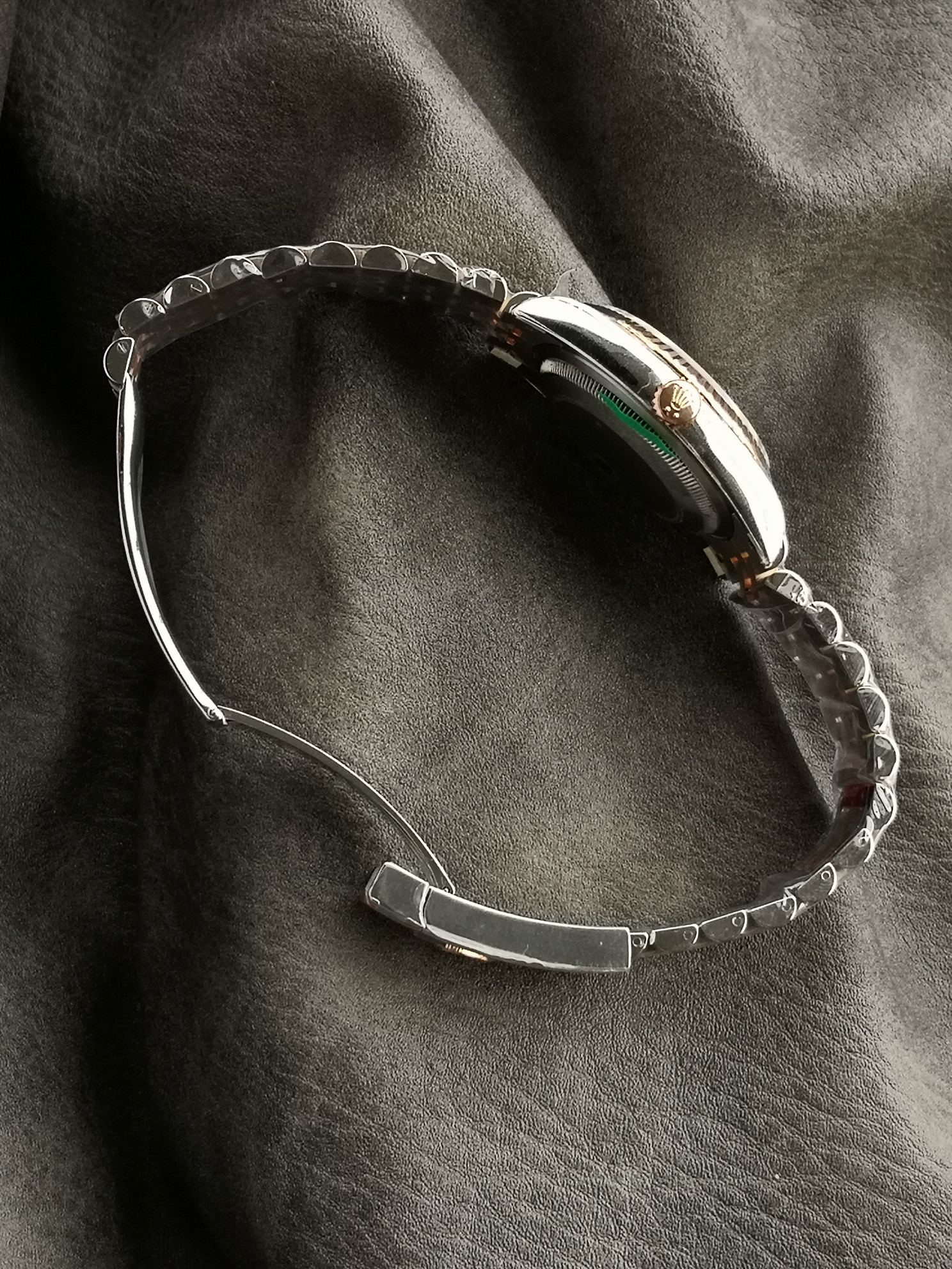 「エバーローズ ロレゾール」の美学: この構成は、完璧なハイコントラストのラグジュアリールックを提供します。ジュビリーブレスレットの外側リンクとメインケースは耐久性に優れた高光沢の904Lオイスタースチールから鍛造されており、ベゼル、リューズ、中央リンクには豊かな18Kローズゴールドが厚くコーティングされています。VSFは、過度にピンクがかった、または真鍮のような色合いを避け、ロレックス純正のゴールドに完璧に一致するように、この温かく銅色がかった「エバーローズ」の色合いを見事に完成させました。