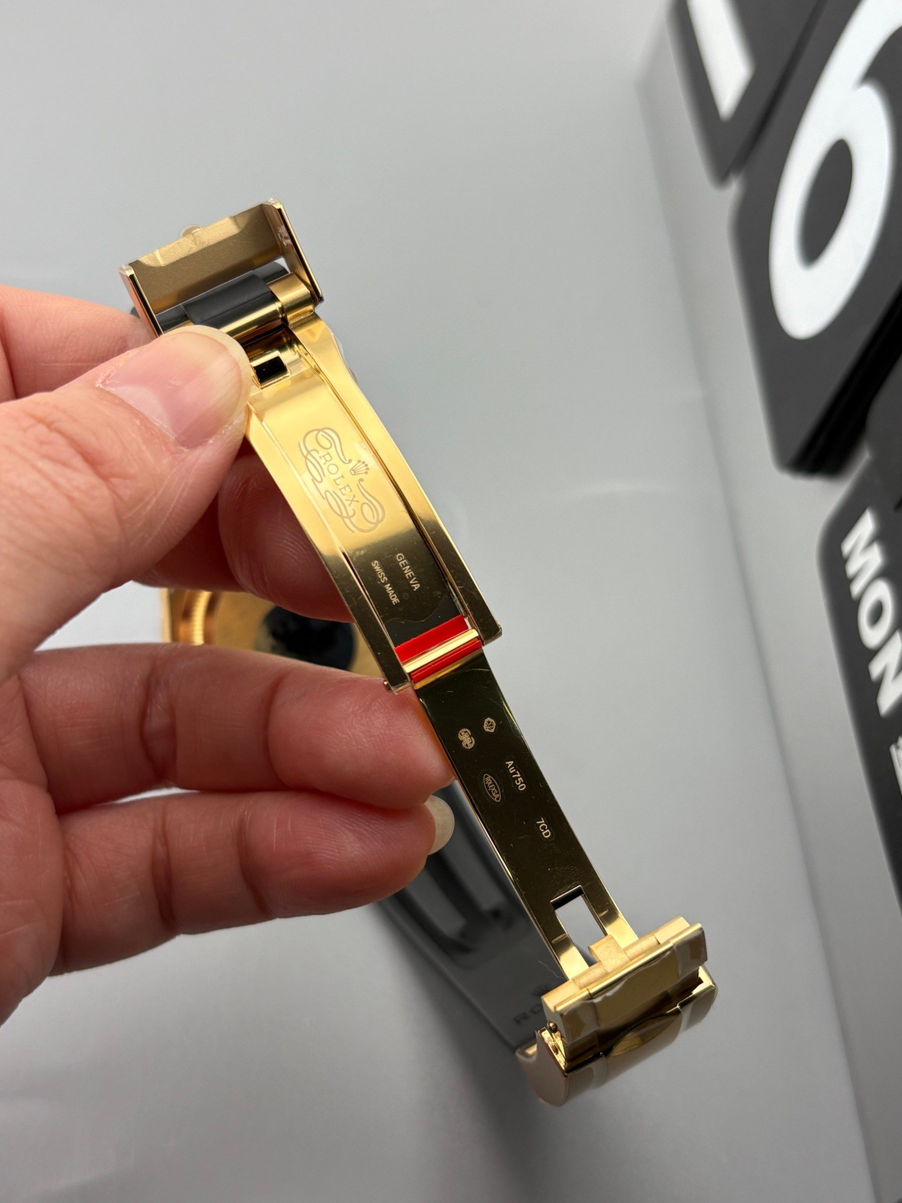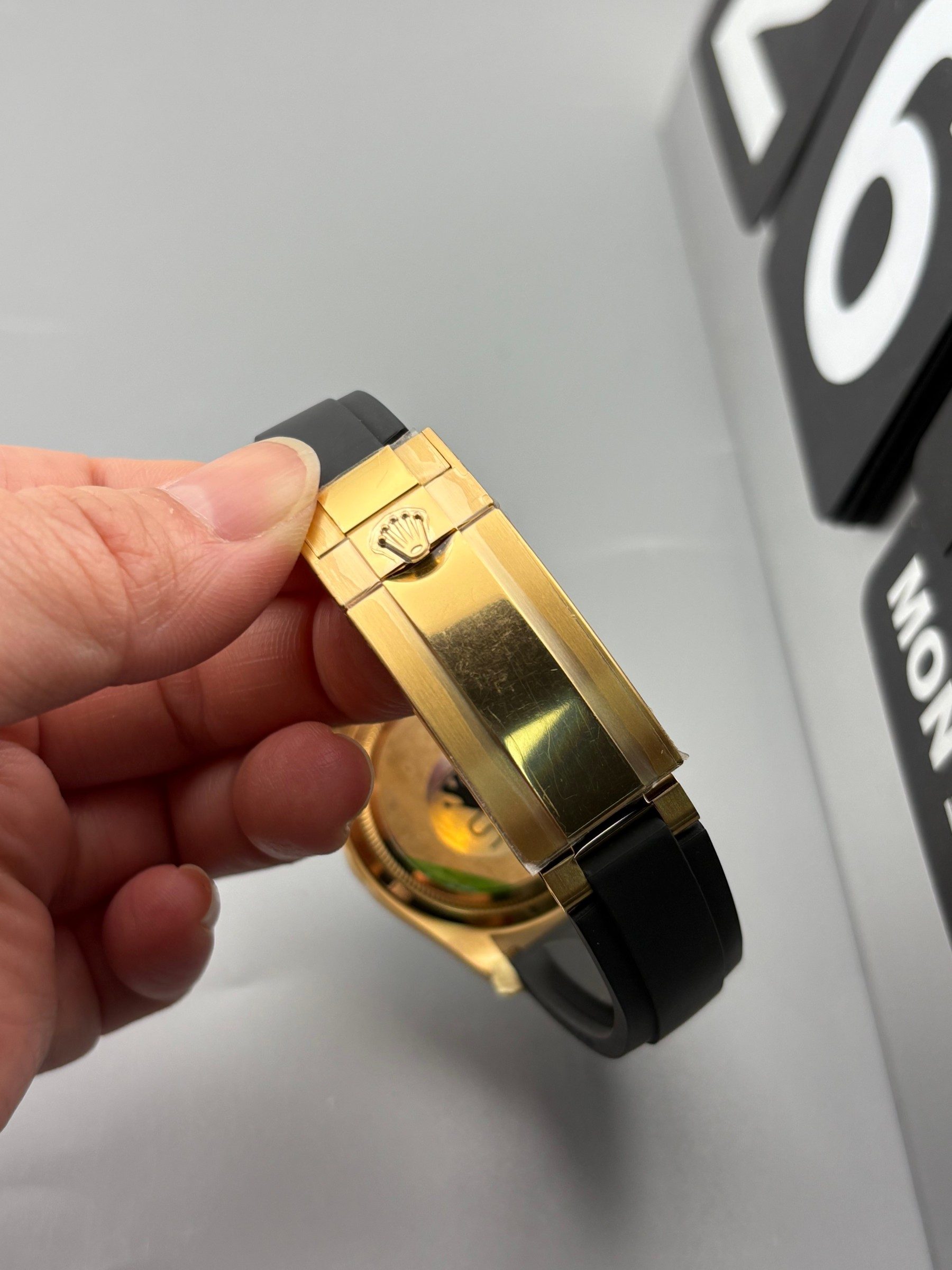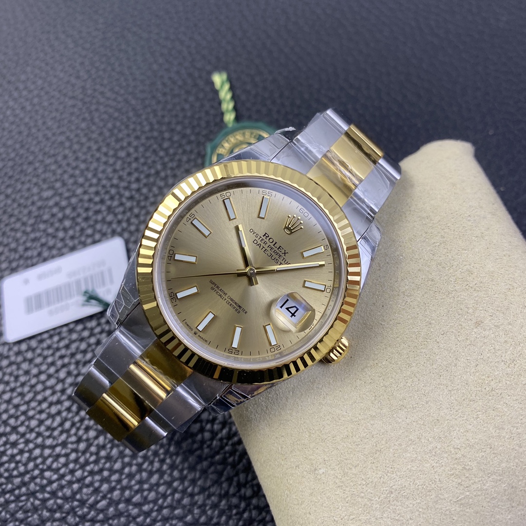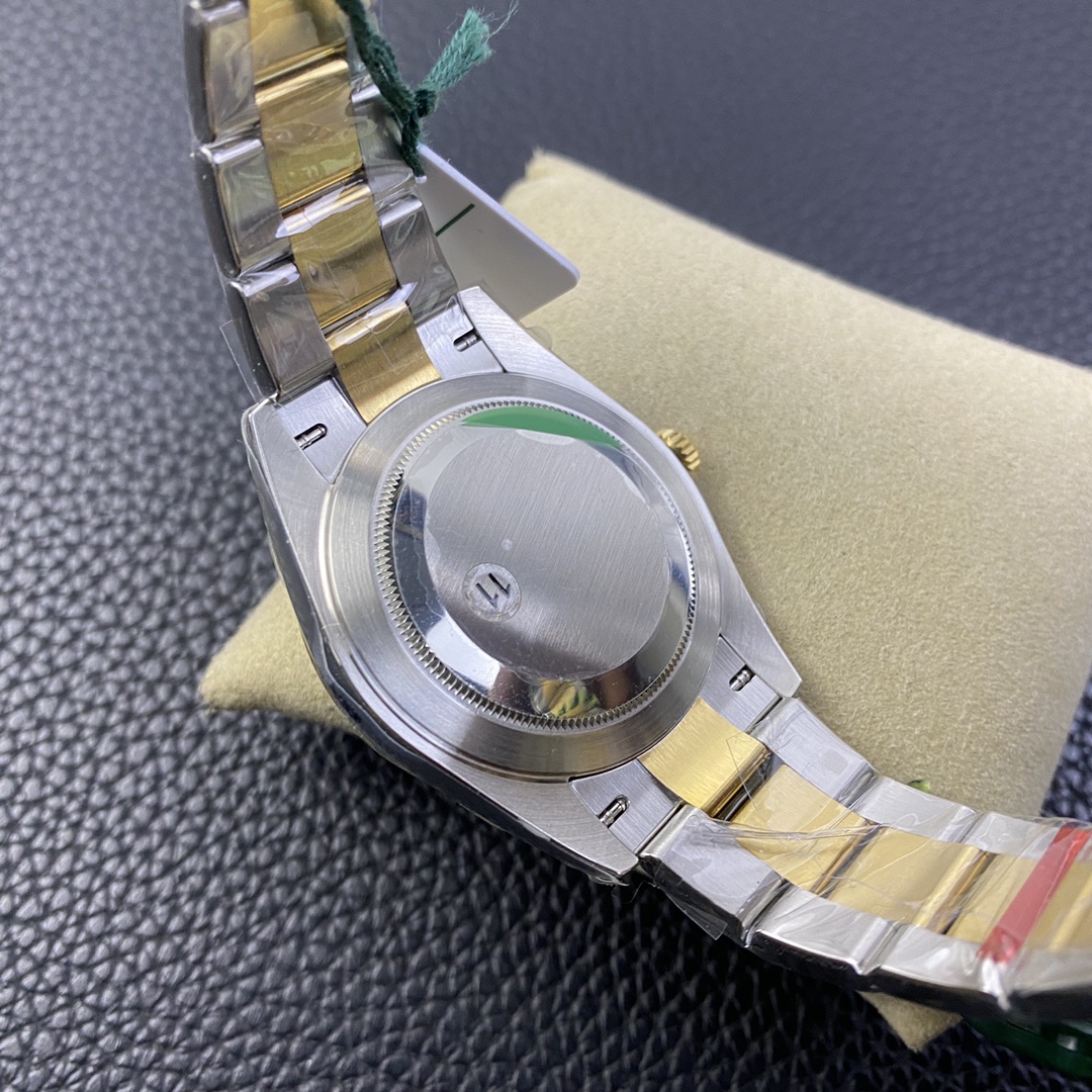 VSファクトリーのゴールドの精度: VSファクトリーは、ロレックス純正の18Kゴールドの正確な色合いをマスターしていることで世界的に高く評価されています。フルーテッドベゼル、リューズ、およびオイスターの中央リンクには、過度に真鍮のような、または偽物に見える色合いを避けた豊かで温かみのあるイエローゴールドが厚くコーティングされており、信じられないほど裕福で正確な存在感を提供します。