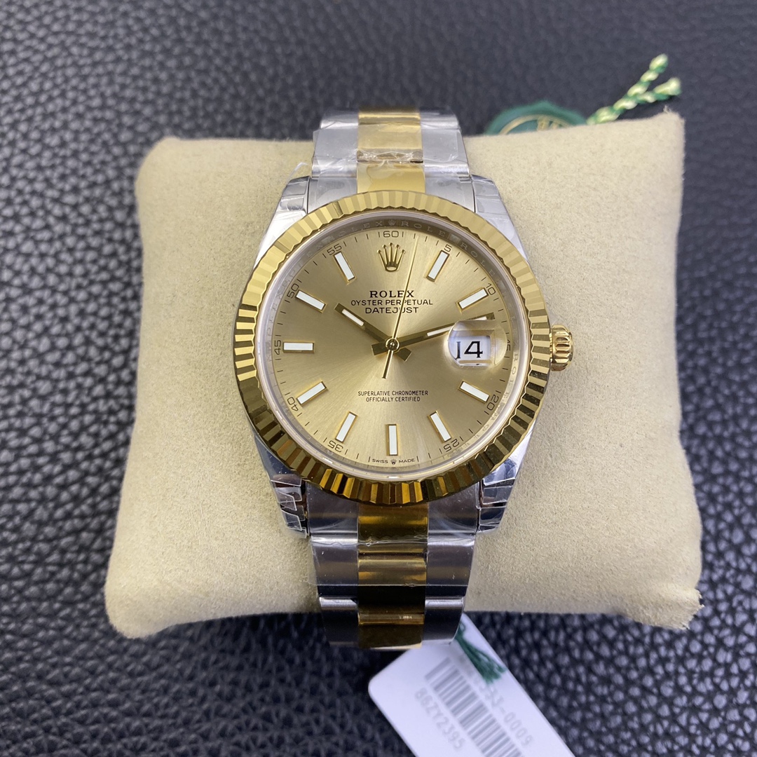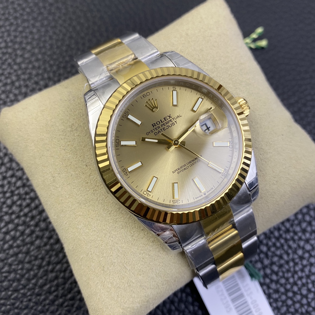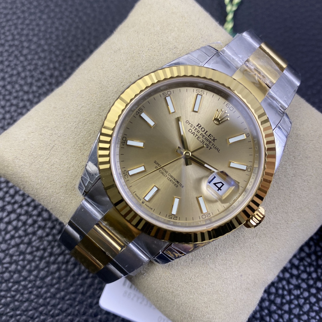 オイスターブレスレットを備えたVSファクトリー製のロレックス デイトジャスト 41 (リファレンス 126333) は、世界で最も認知されているラグジュアリーウォッチの美学を見事に現代向けにスケールアップ(大型化)したモデルです。ロレックスのカタログで「イエローロレゾール」として知られるこのツートン(間金)の傑作は、重厚な904Lステンレススチールケースの頑丈な信頼性と、18Kイエローゴールドの豊かで紛れもない存在感をシームレスにブレンドしています。この特定の1:1スーパークローンは、伝説的なサンバースト シャンパン文字盤と光を捉えるフルーテッドベゼルを、非常に堅牢な3連オイスターブレスレットと組み合わせています。これにより、ジュビリーの対応モデルよりもわずかにスポーティで現代的に感じる、ユニークで圧倒的な手首での存在感が生み出されます。VSFの業界をリードするVS3235自動巻きムーブメントを搭載し、真の72時間パワーリザーブを誇り、実機と見分けがつかない妥協のない威信を提供します。