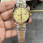 シャンパン ダイヤモンド文字盤: 文字盤はロレックスの絶対的かつ典型的なカラーウェイですが、大幅にアップグレードされています。豊かで黄金色のシャンパンフェイスは、外側に向かって放射状に広がる美しいサンバーストテクスチャーを特徴としています。このクラシックな背景に対して設定されているのは、輝く模造ダイヤモンドインデックスです。それぞれのダイヤモンドは完璧にカットされ、研磨されたイエローゴールドの縁取りの中に緻密に手作業でセットされており、時計を完全に新しいレベルのラグジュアリーへと引き上げる信じられないほどのきらめきを提供します。
